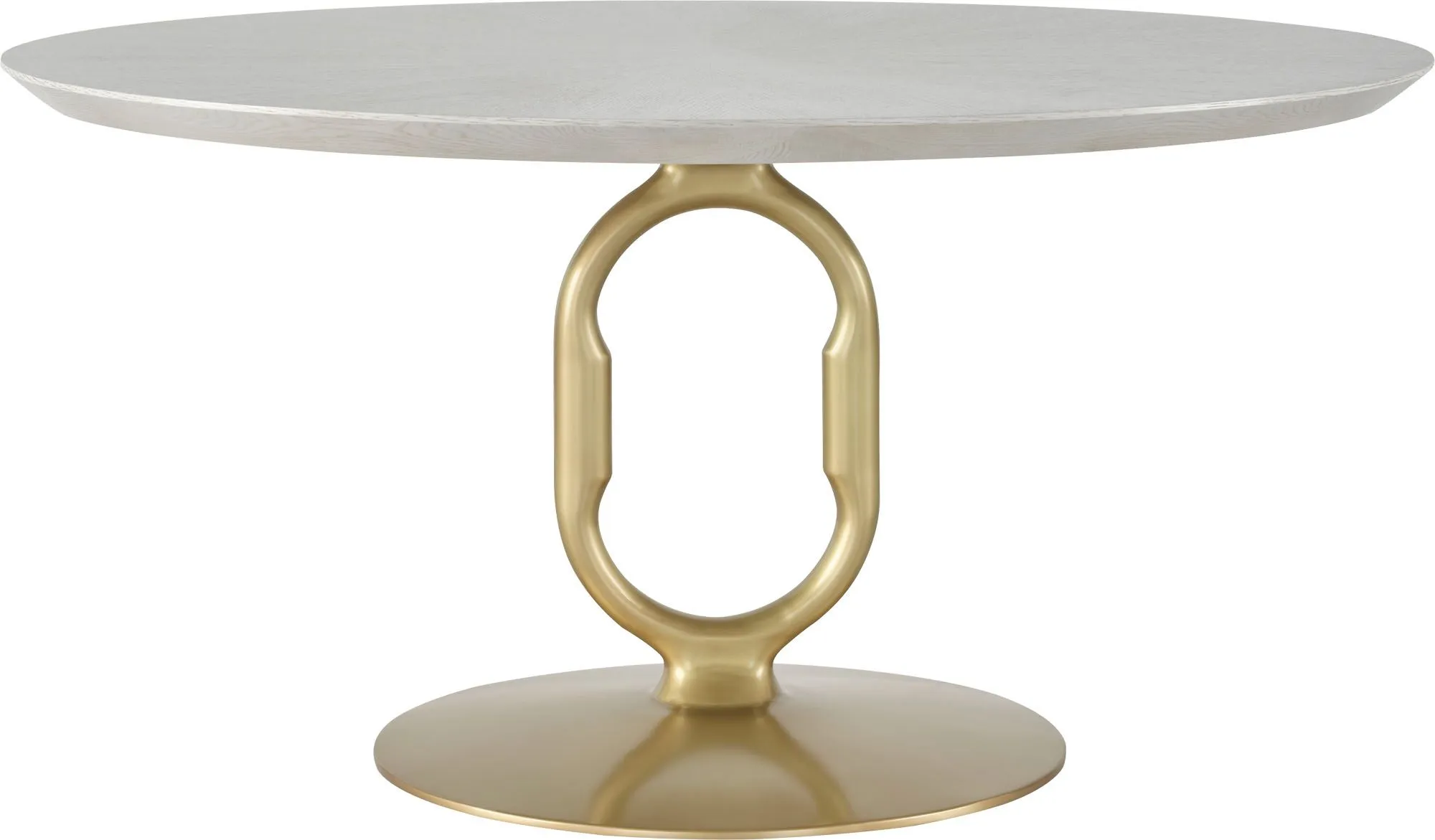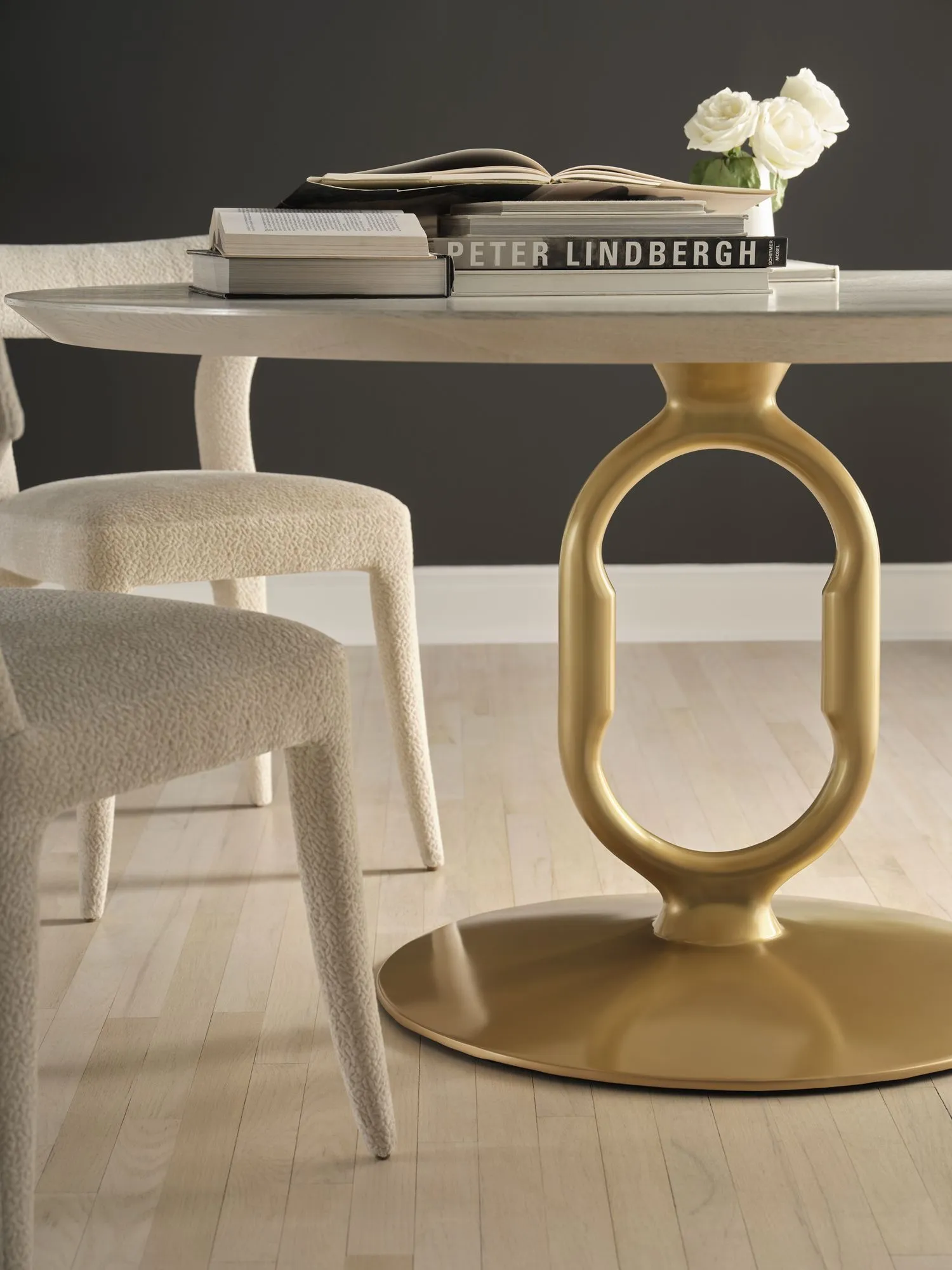 Inspired by the clasp and cuff detailing of luxury fashion and jewelry, the Link Round Dining Table is an oak and bronze piece with a remarkable silhouette. Its tabletop features a magnificent starburst pattern.