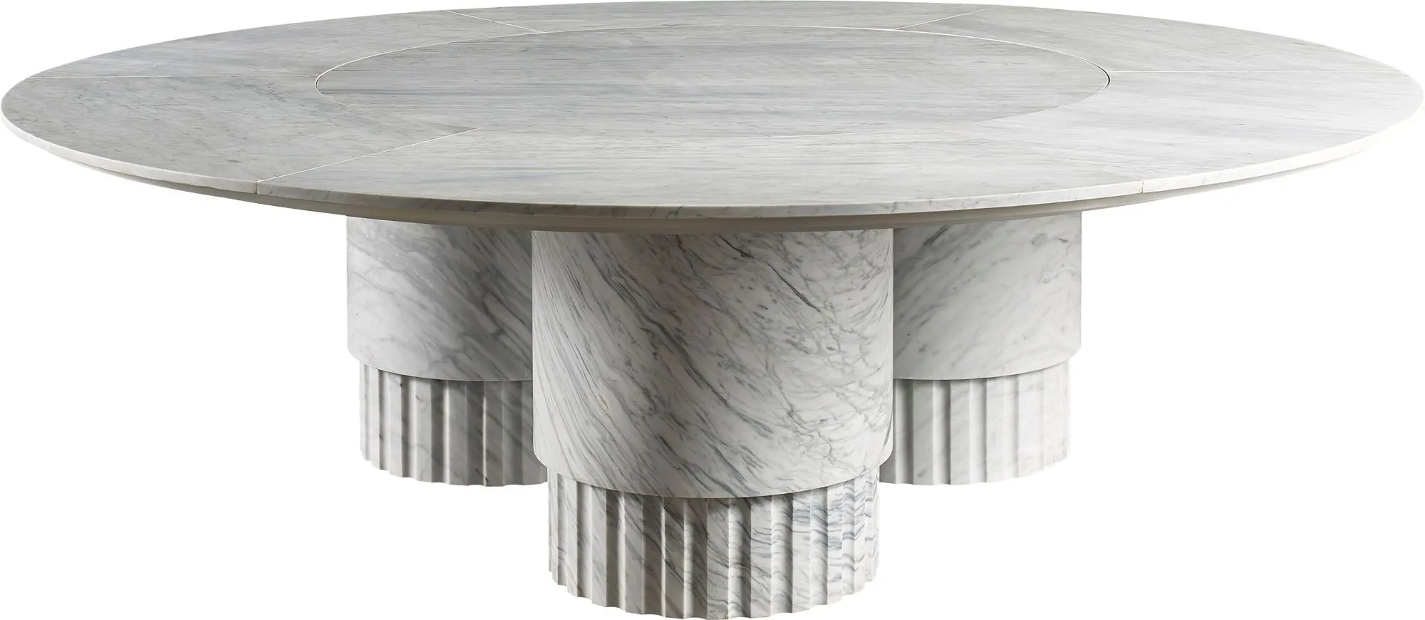 Strong and steadfast, the Agora Round Dining Table takes its cues from the neoclassical architecture of Ancient Greece. A Carrara marble tabletop with an inset and flush lazy susan that rests above three Carrara marble Doric-style column.