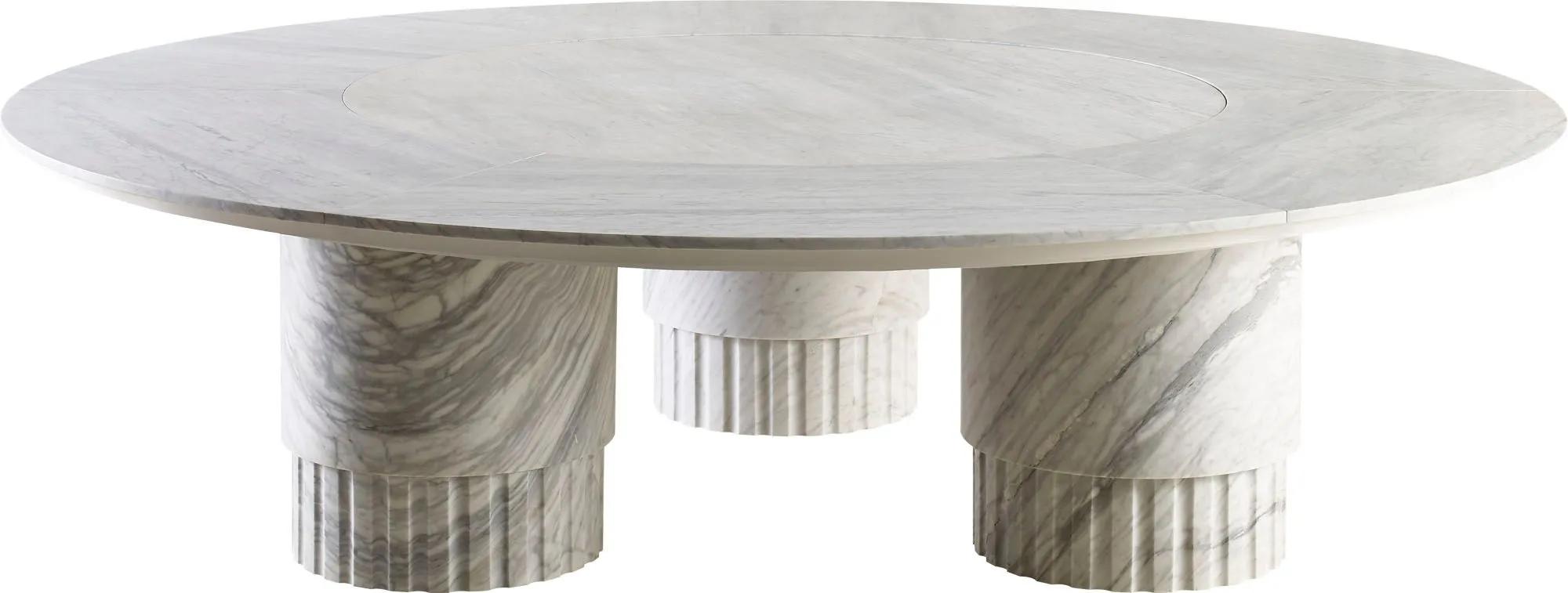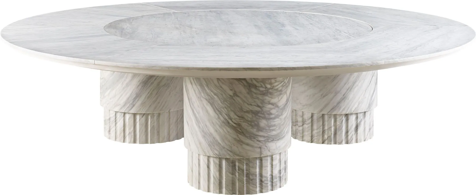 Strong and steadfast, the Agora Round Dining Table takes its cues from the neoclassical architecture of Ancient Greece. A Carrara marble tabletop with an inset and flush lazy susan that rests above three Carrara marble Doric-style column.
