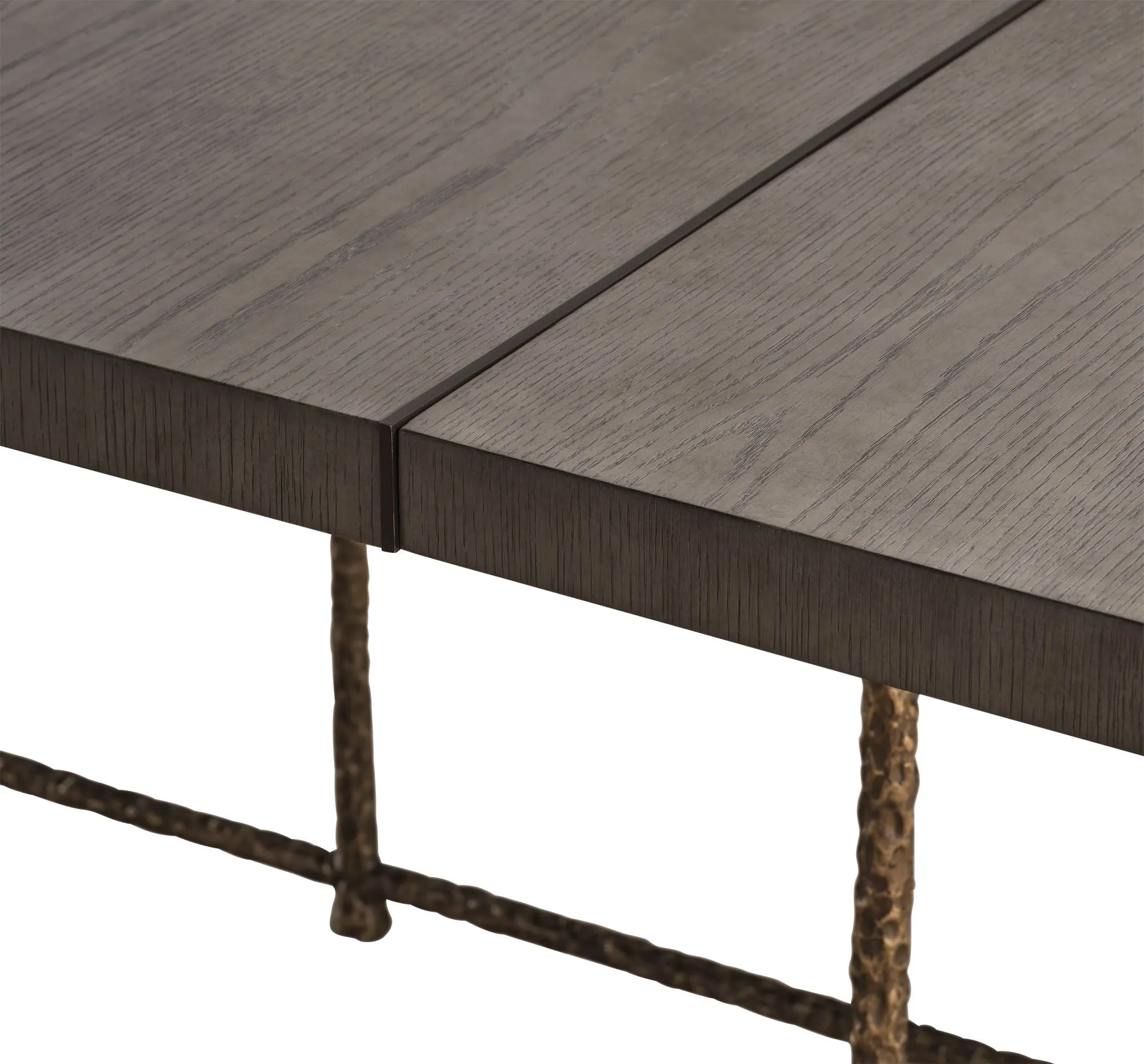 The Otago 144” Rectangle Dining Table explores the pairing of oak veneer and cast bronze, with a bronze detail emerging through the tabletop to display the beauty and imagination of contrasting elements. It is inspired by a region on New Zealand’s South Island that features mountains, glacial lakes and dormant volcanoes.
