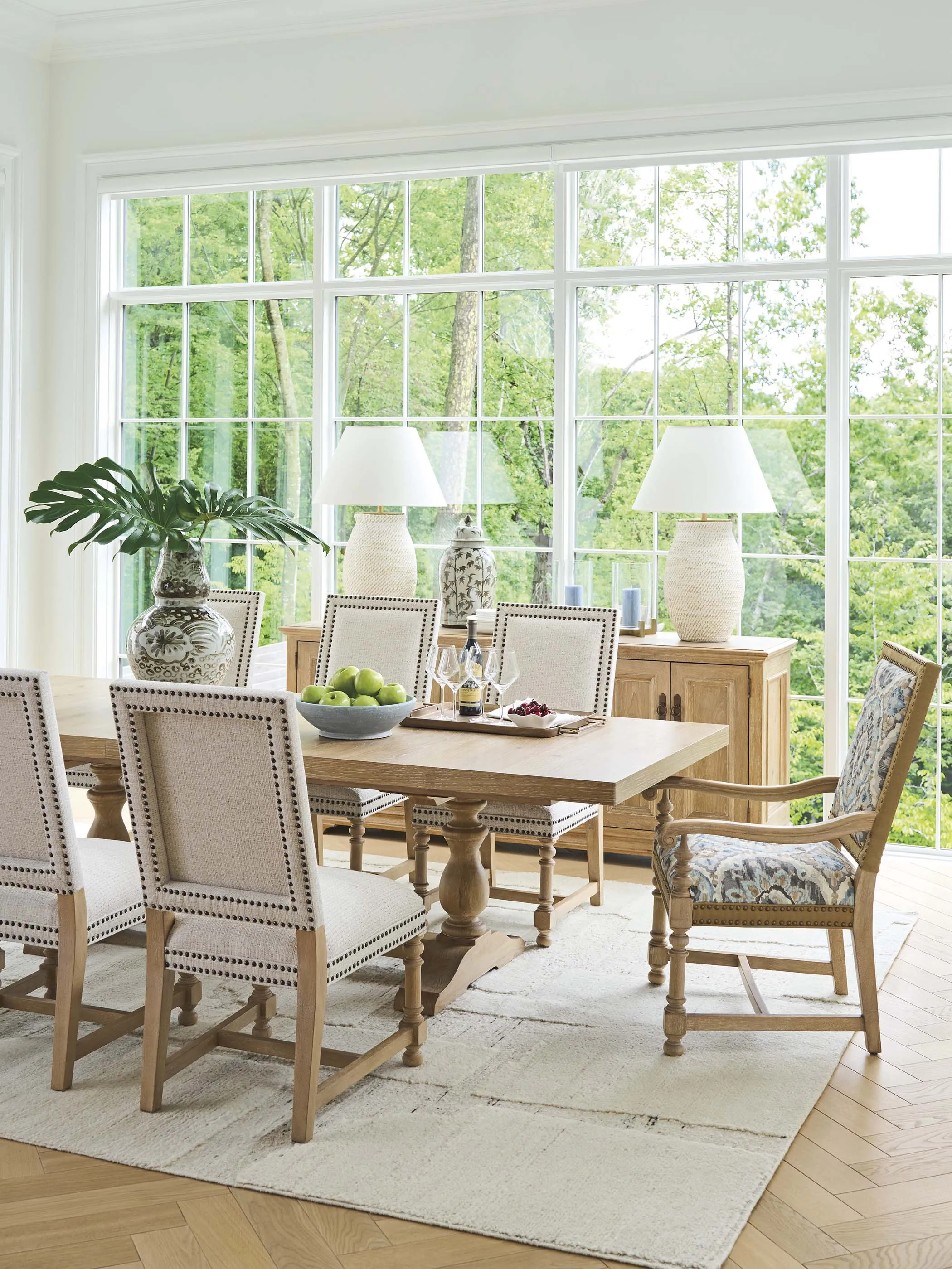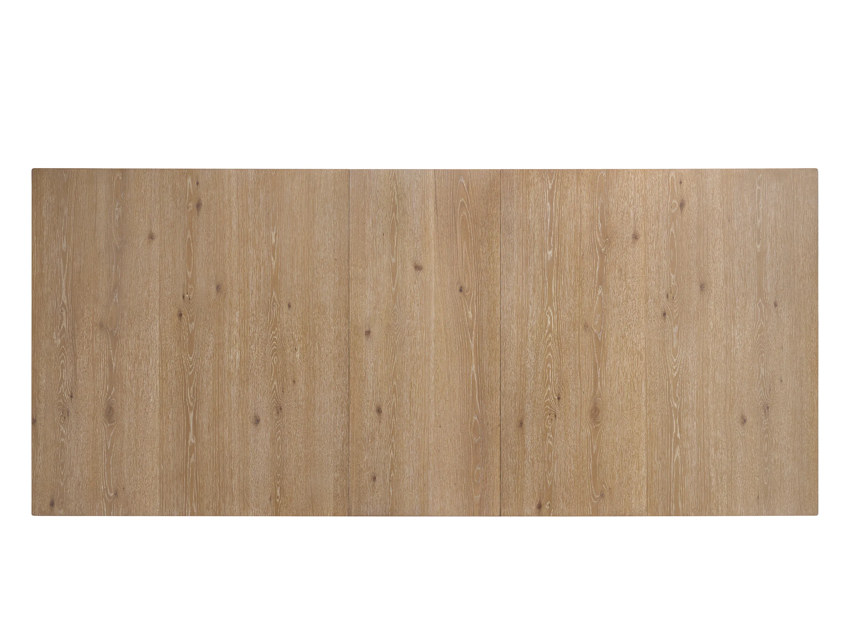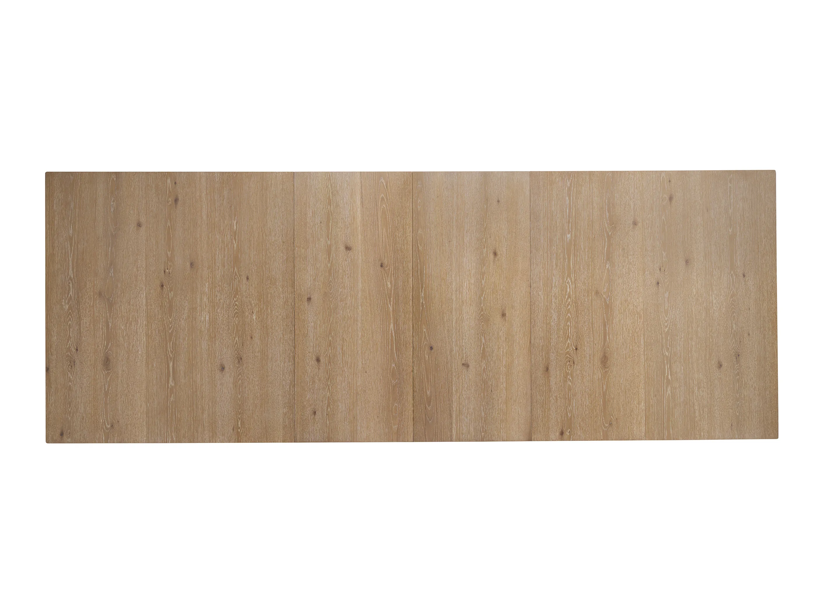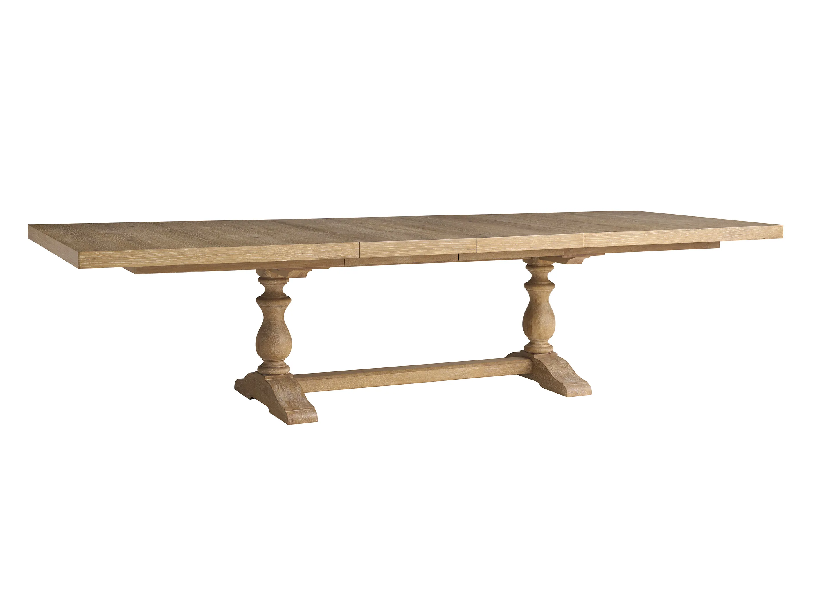 The 84-inch La Mirada dining table extends to 124-inches with two 20-inch leaves. The top features quartered white oak veneer, with long elegant grain lines. Classic urn-shaped pedestal legs support the top on a generous trestle base with bracket feet.