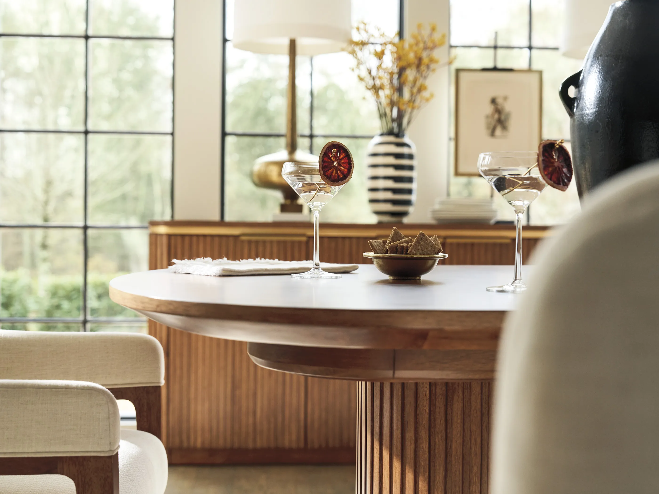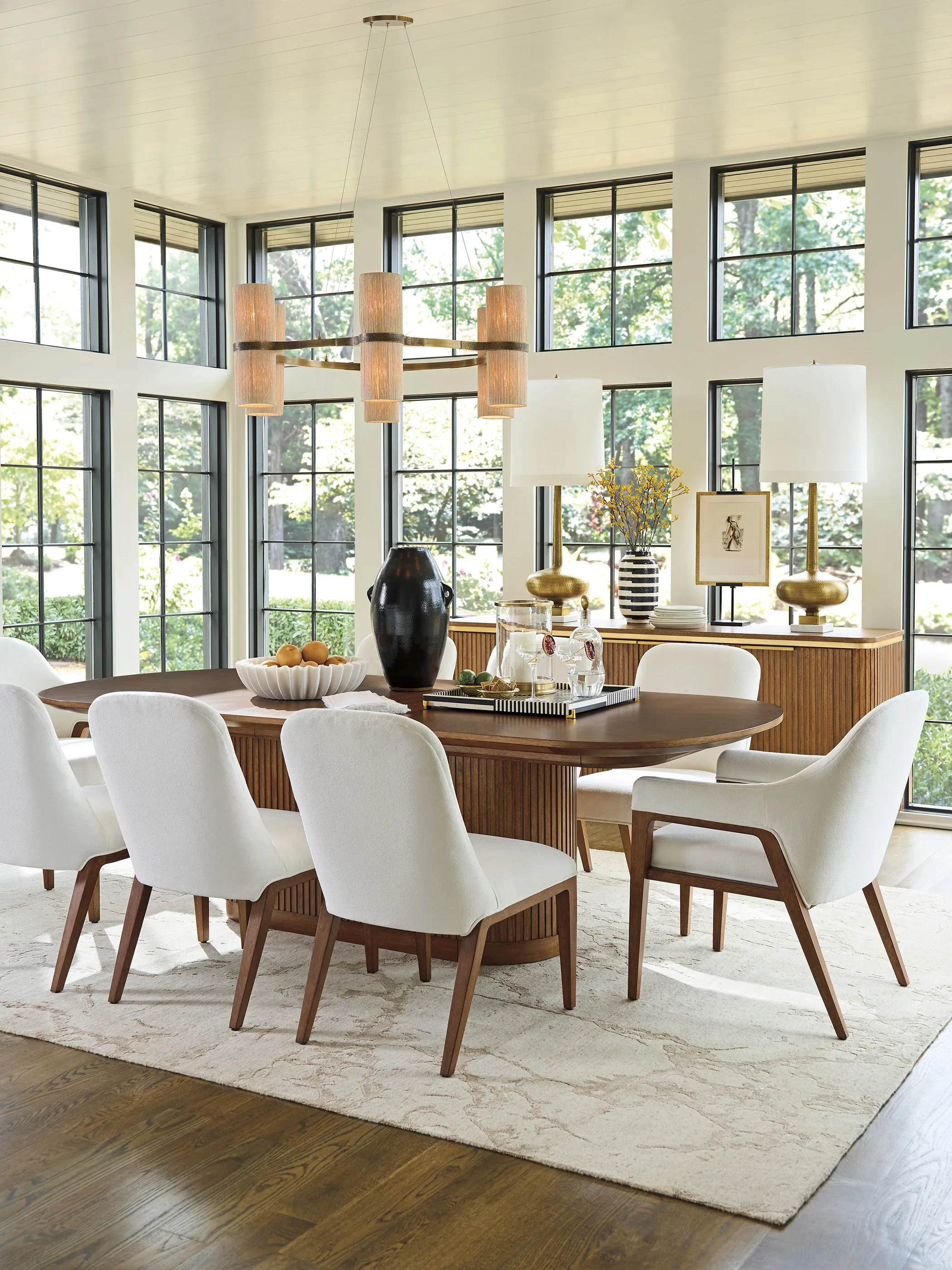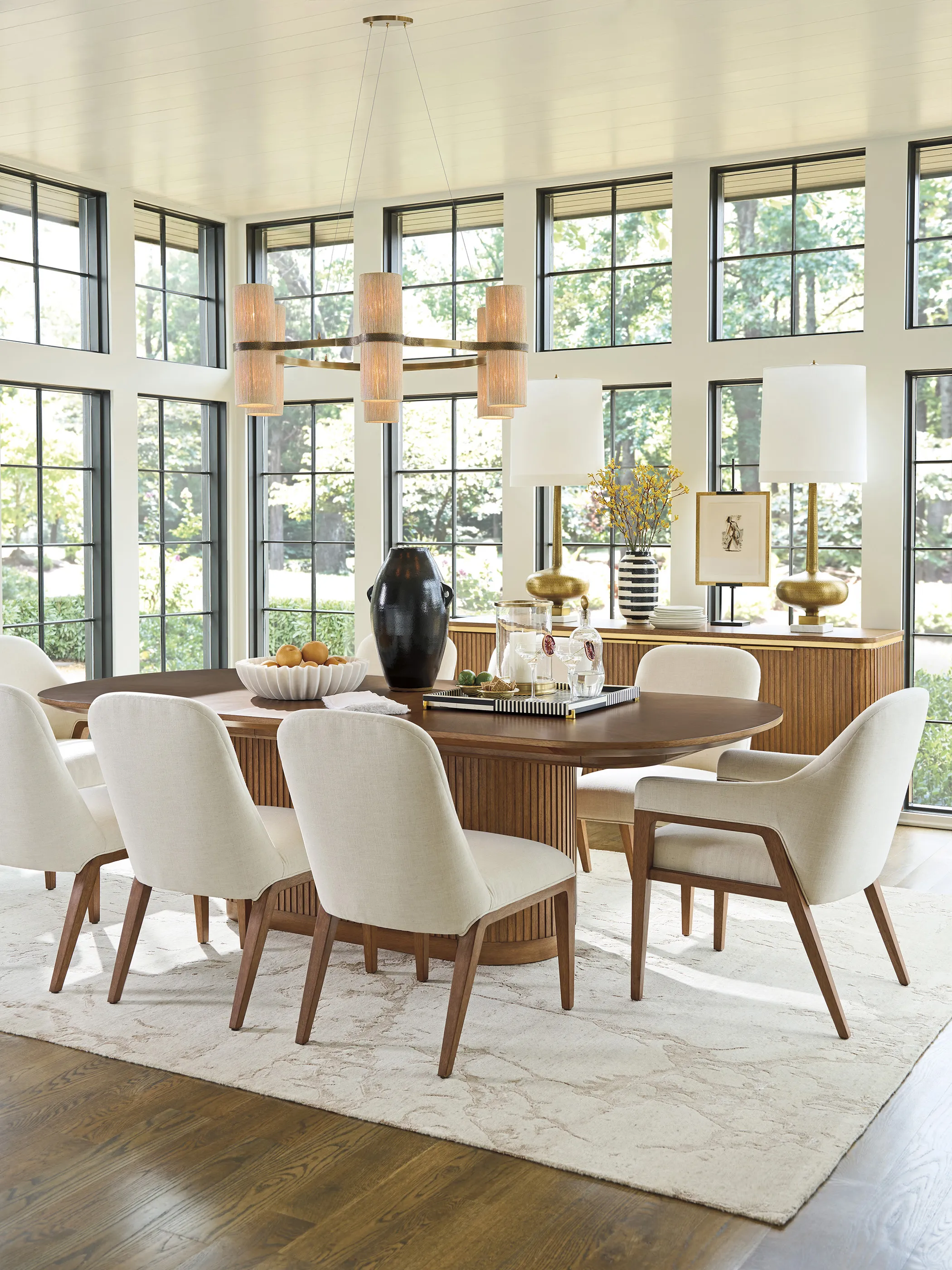 Offering a fresh take on casual contemporary living, La Costa features elegant curves, fluted detailing, and a fusion of materials like Anticato marble, honed limestone and metal accents in a satin gold finish. Designs incorporate touches of Mid-Century styling for a sophisticated yet approachable interpretation of luxury living.