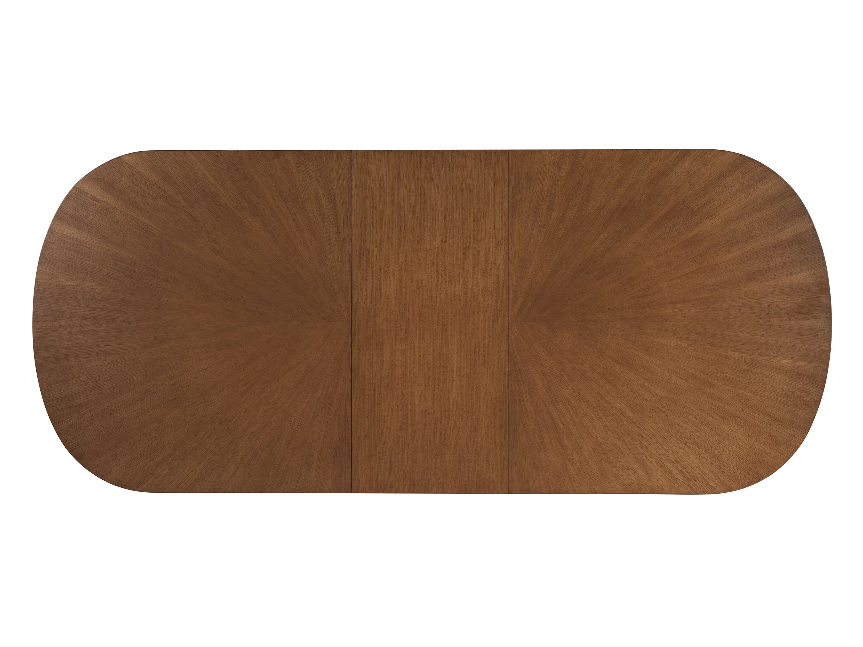 The Palomar dining table extends to 122-inches with two 20-inch leaves. The top features a radial veneer pattern and the leaves have a straight grain pattern. The top has a reverse chamfer on the edge, and there is a privacy apron under the top that elegantly conceals the table slide mechanism.