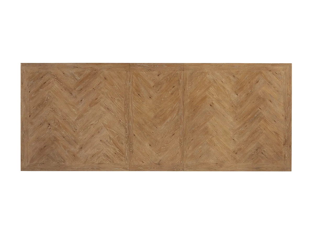 The 88-inch trestle dining table is a perfect gathering place. The top features an elegant herringbone veneer pattern and with two leaves, the table extends to 132-inches, comfortably accommodating ten.