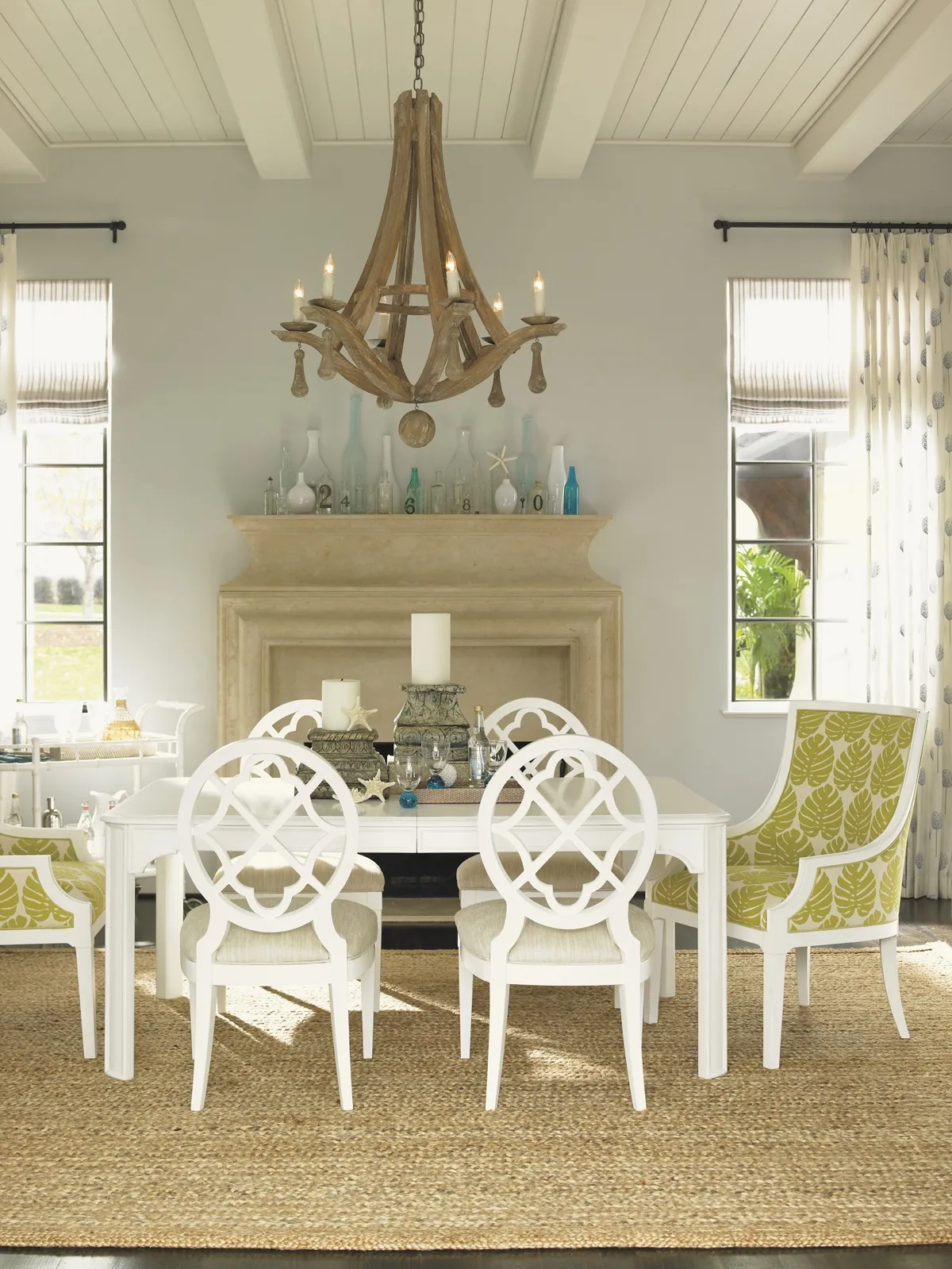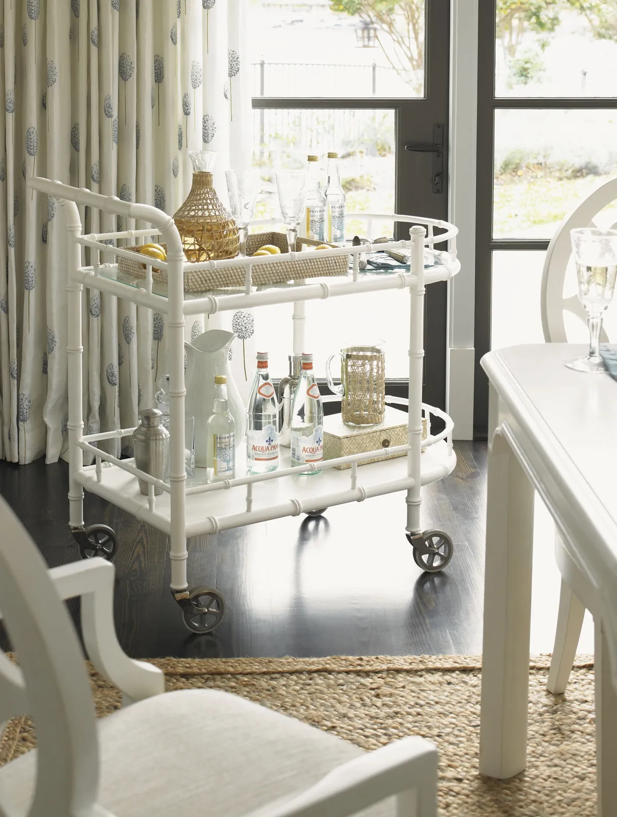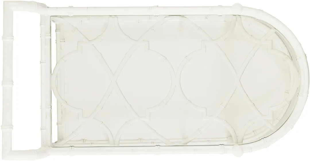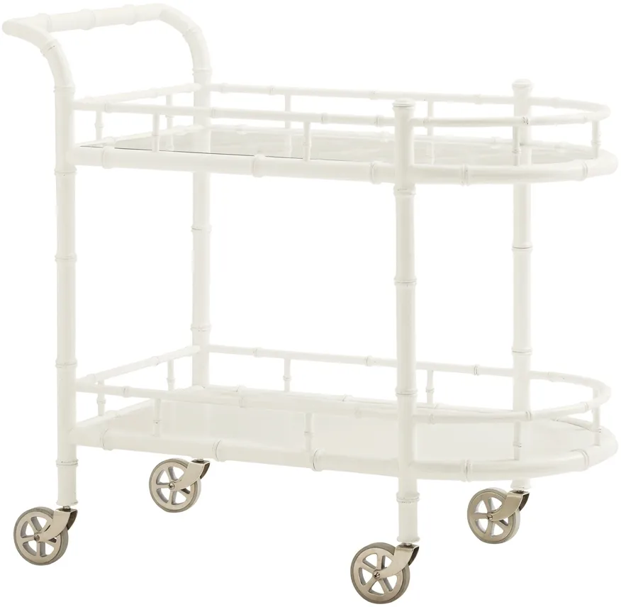 The top surface is glass over decorative fretwork while the lower shelf is wood. Both are surrounded by a bamboo inspired gallery rail to keep items from slipping off during transport. The rubber tread casters ensure a smooth ride.