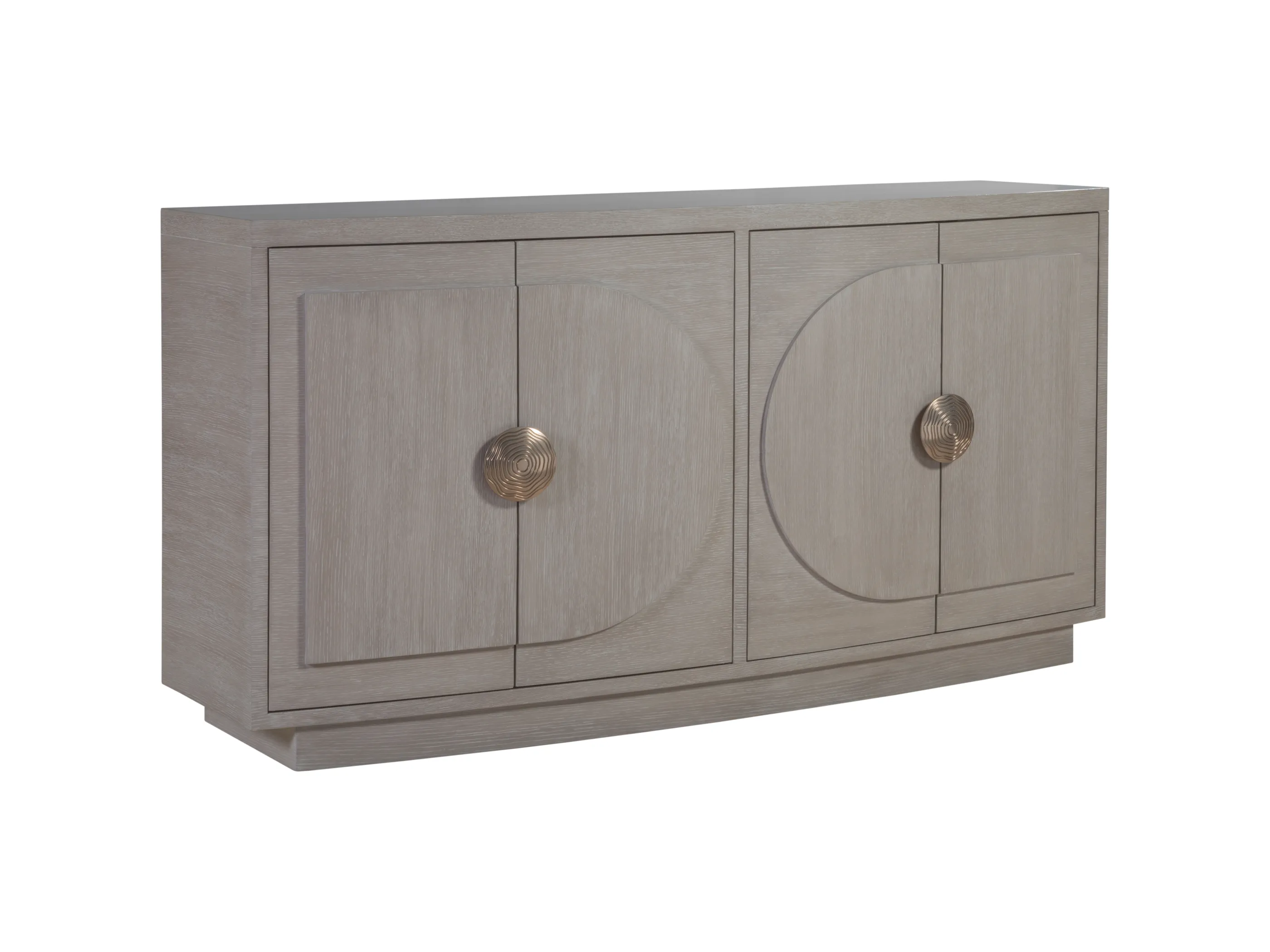 Bow fronted transistional credenza featuring half-oval overlays and exceptional hardware culled from the Deco era. The case body boasts unusual landscaped white oak quarter grained veneers, while the grain on the overlays runs vertically, enhancing visual interest. Two drawers with felt inserts, and hardware in a brilliant, light champagne finish.