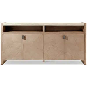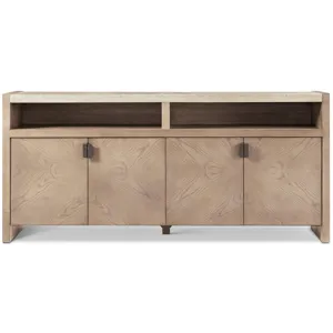 Four door media cabinet in figured cathedral ash in an artful grain pattern available in either Dune or Earth. Completed with metal pulls in Ember and a top in our exclusive Mineral finish. An adjustable shelf can be found in each cabinet.