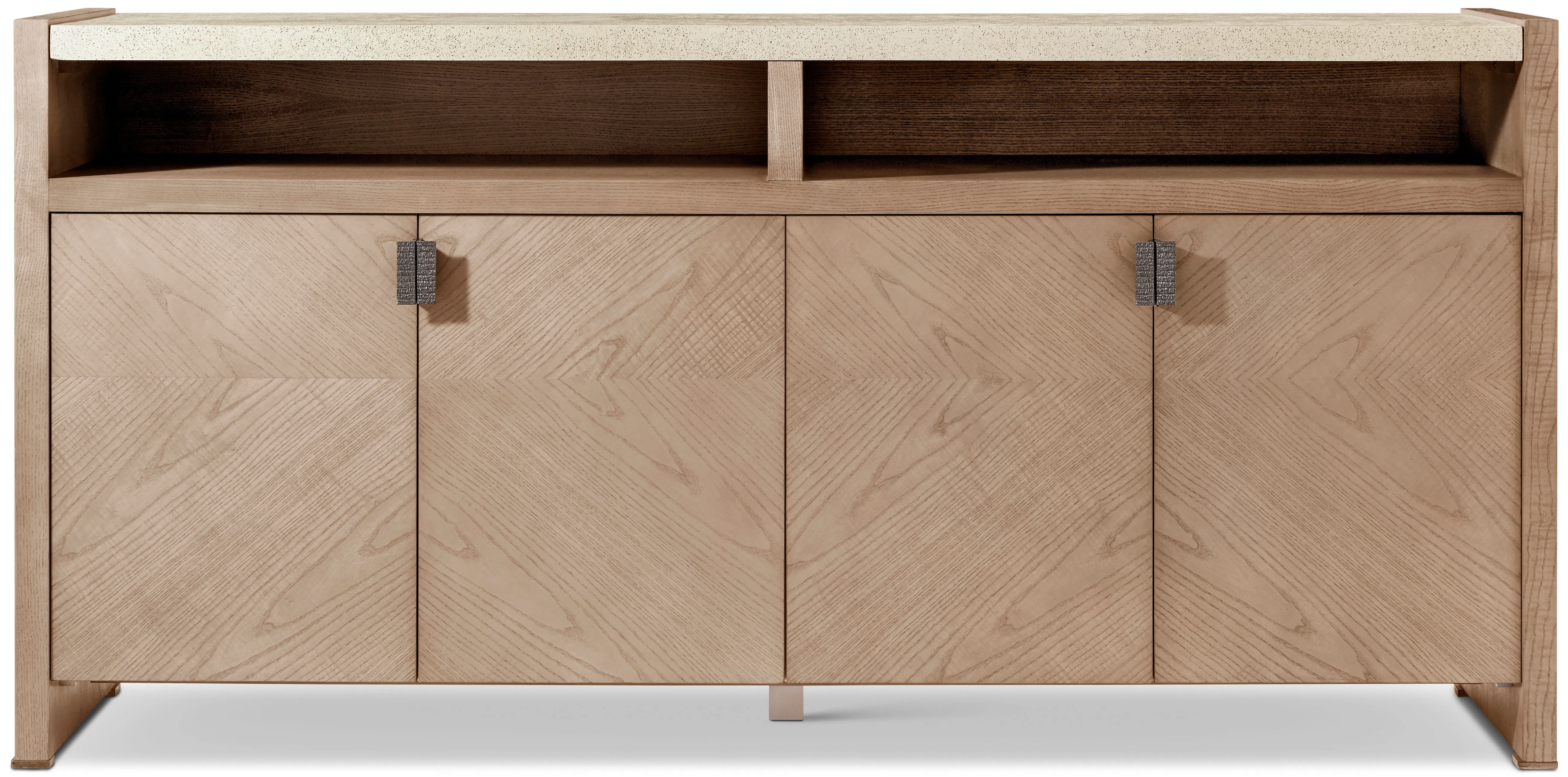 Minimalist four door sideboard with peaceful symmetry in figured cathedral ash. Available in Dune or Earth with metal pulls in Ember completed with a top done in our stone-like porous Mineral finish. An adjustable shelf can be found in each cabinet.