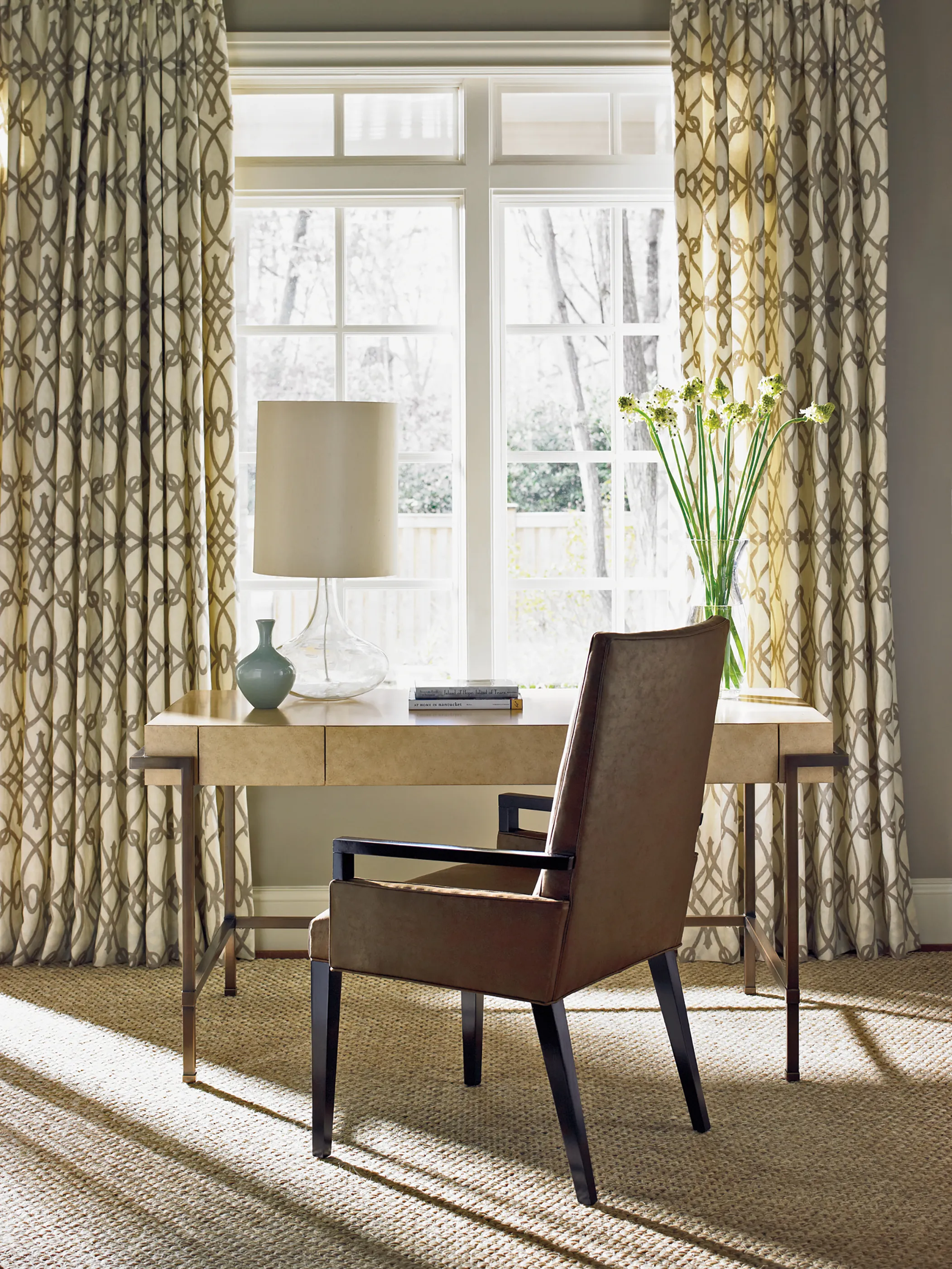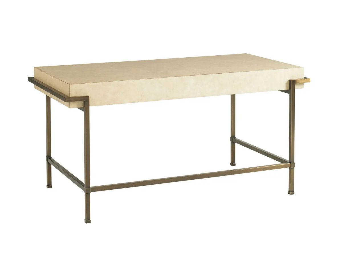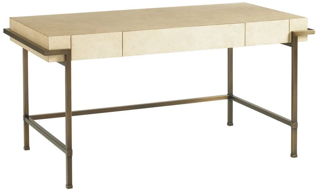 The three drawer desk in a Parchment finish, sits on a brushed brass base.