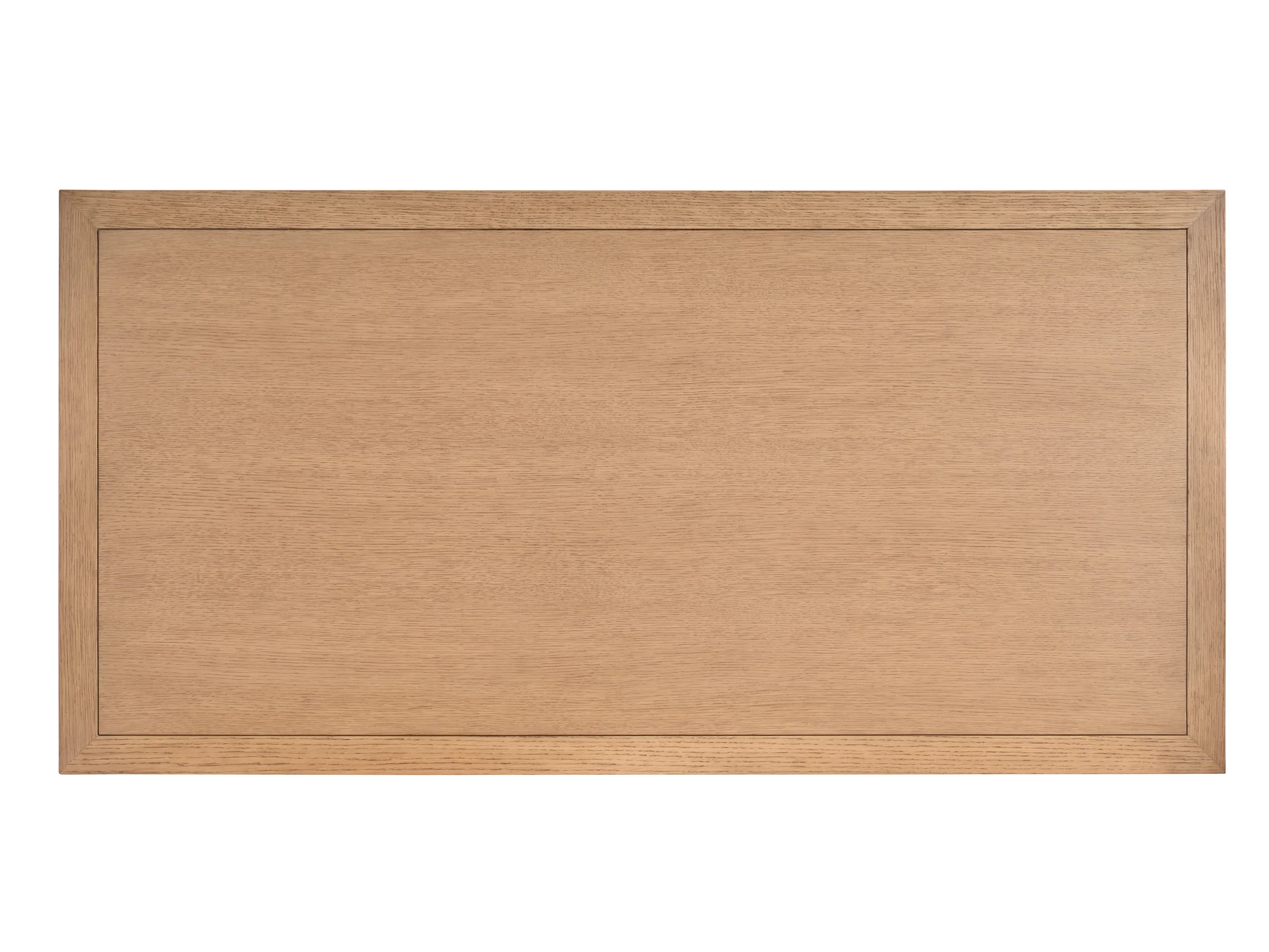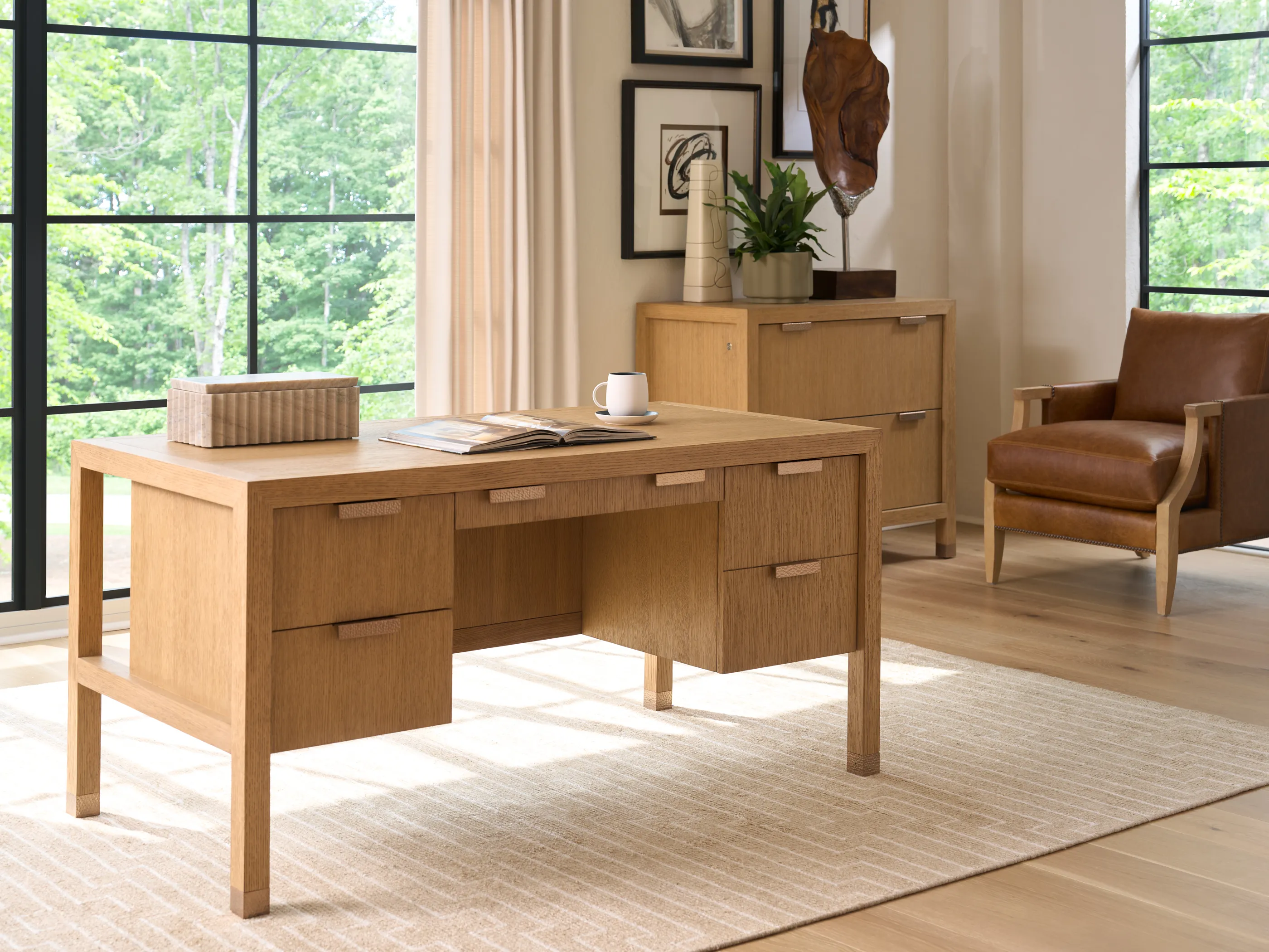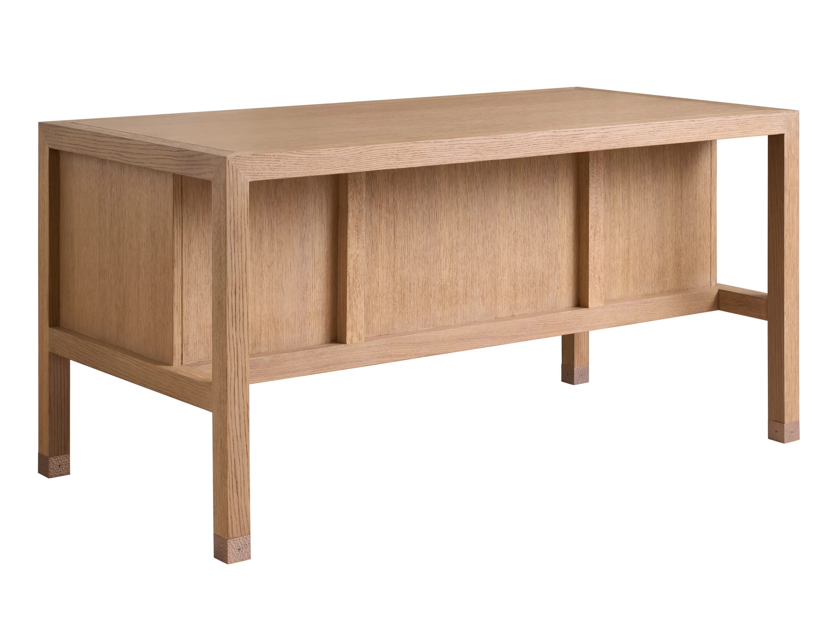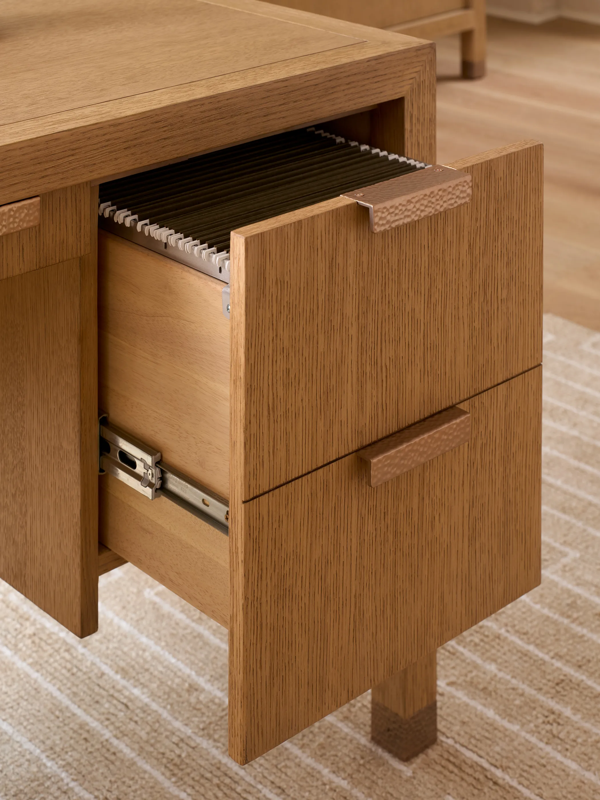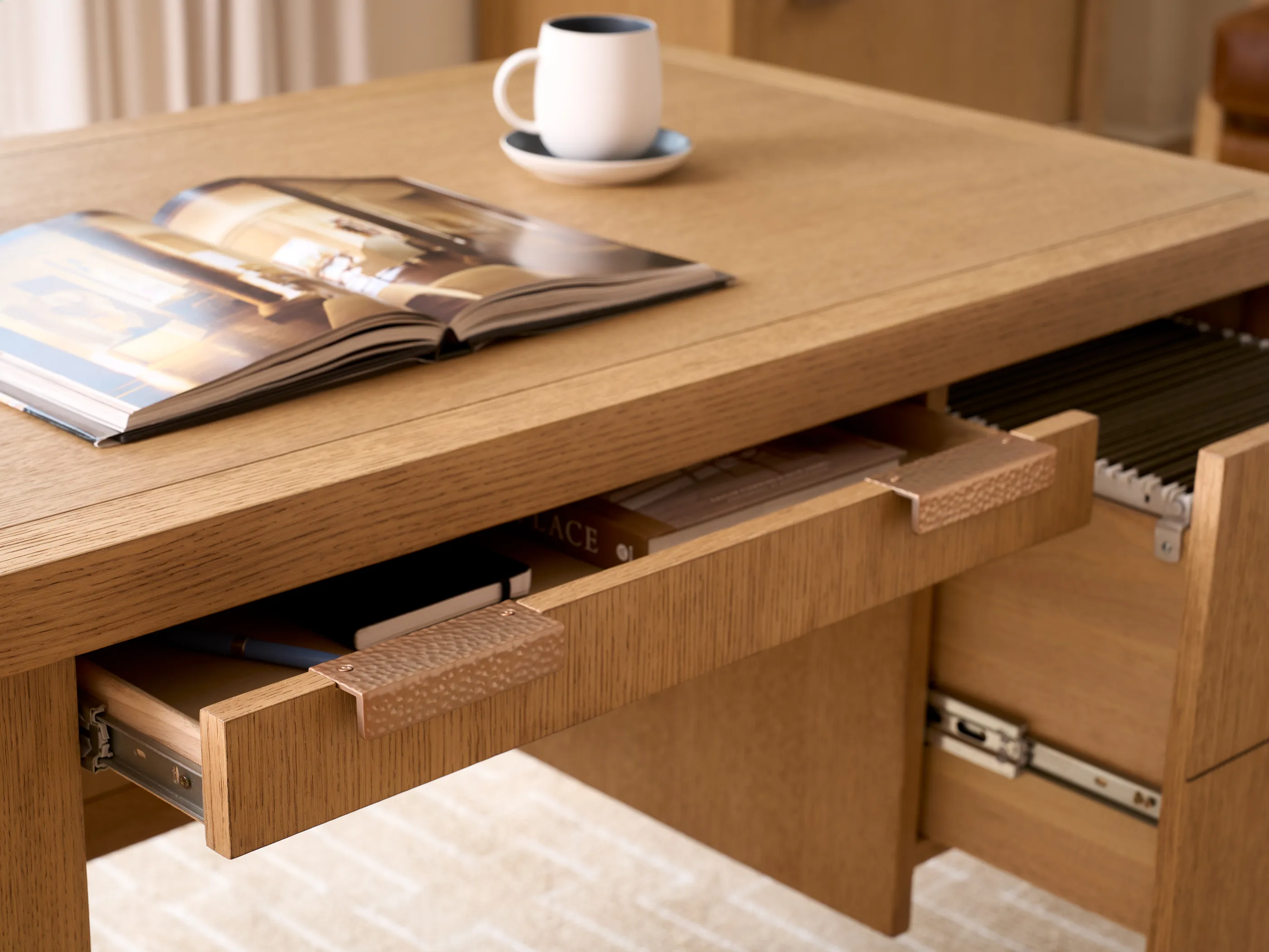The 60-inch writing desk features two large storage drawers on the left, a drawer in the center, and file storage to accommodate letter or legal files on the right. Quartered white oak is finished in a warm tan coloration, complemented by custom hardware in hammered copper. The legs feature contemporary metal ferrules in the hammered copper finish.