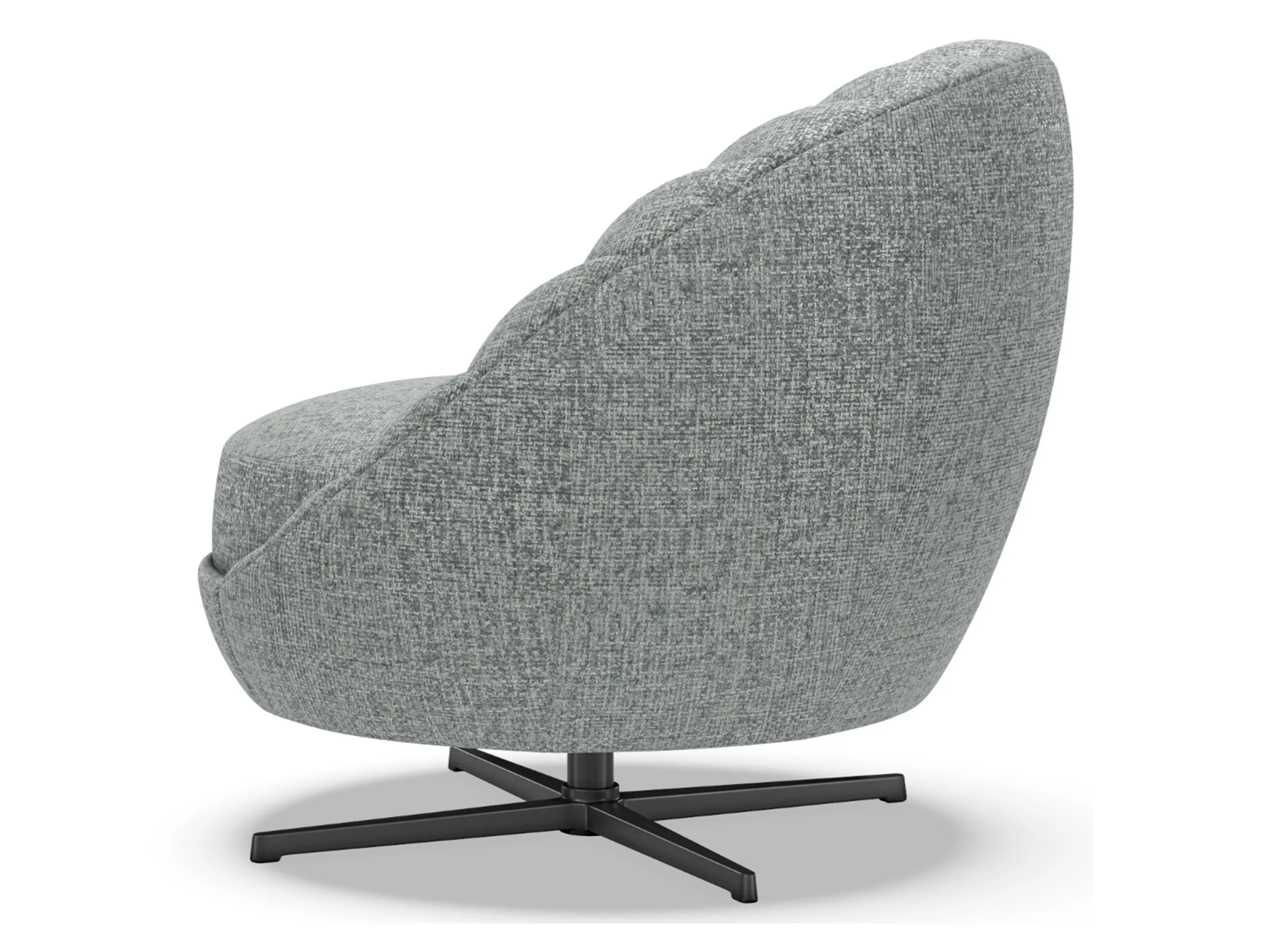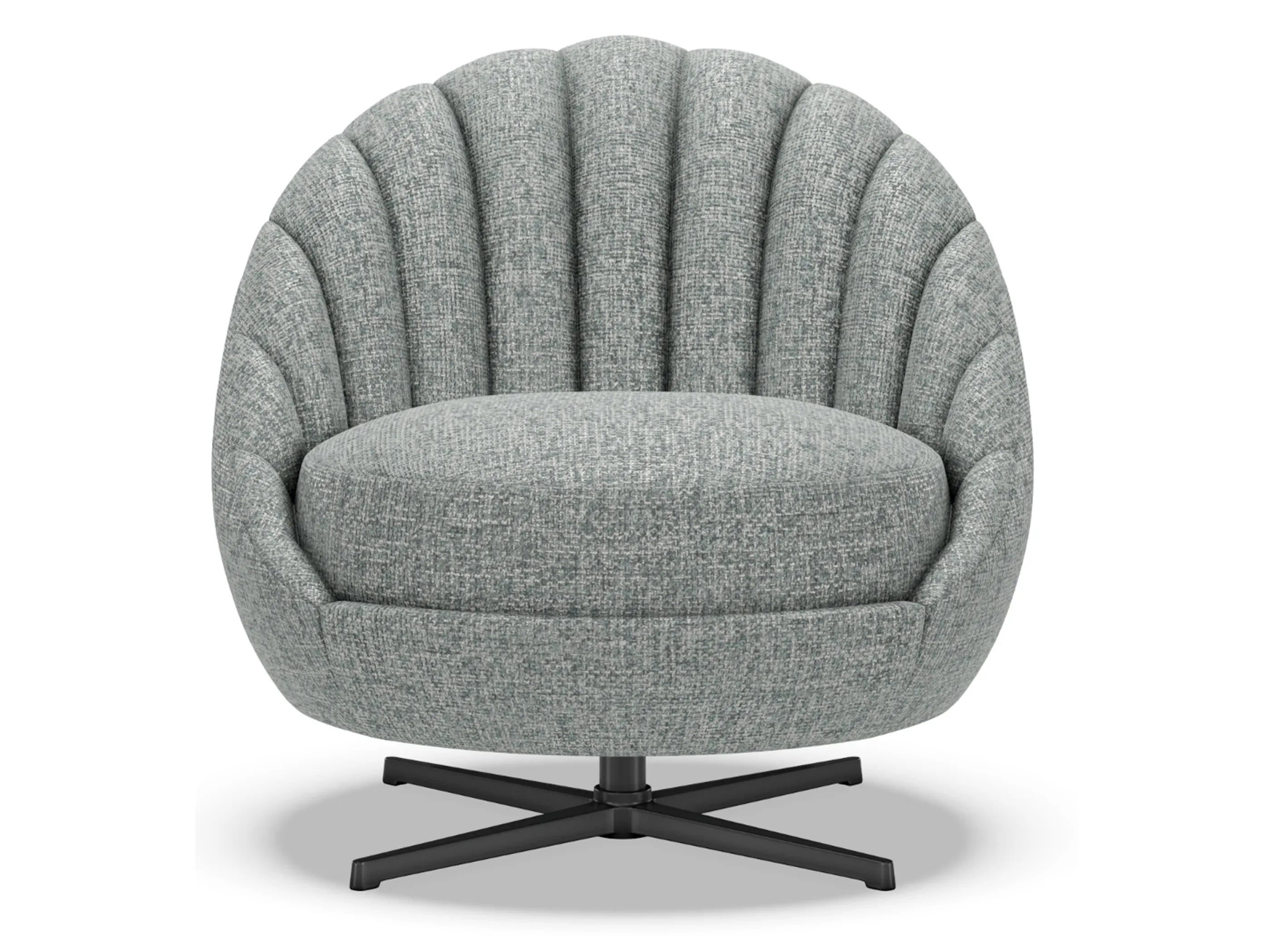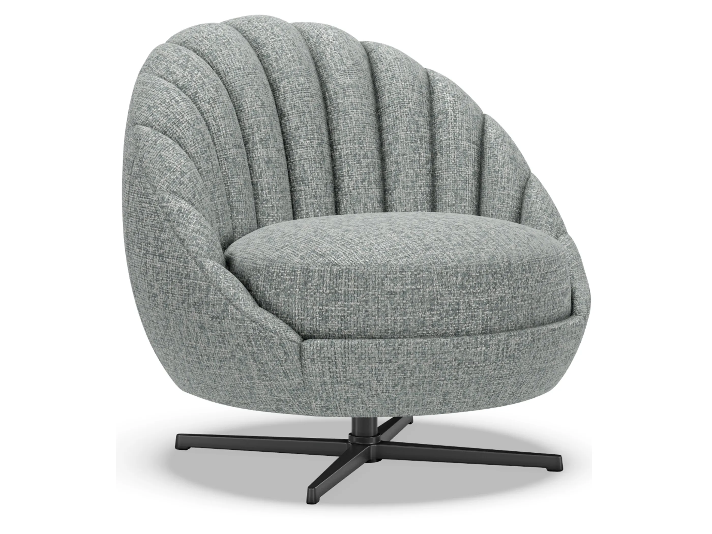 Lucille is a sublimely scaled Mid-century Modern form featuring interior channels that taper in as they meet the seat, creating a contemporary fan-like appearance. The in-back is intentionally pitched back to give the silhouette a more modern appearance while still maintaining great seating comfort. The swivel base is finished in a charcoal coloration. Due to the design, striped fabrics are not recommended.