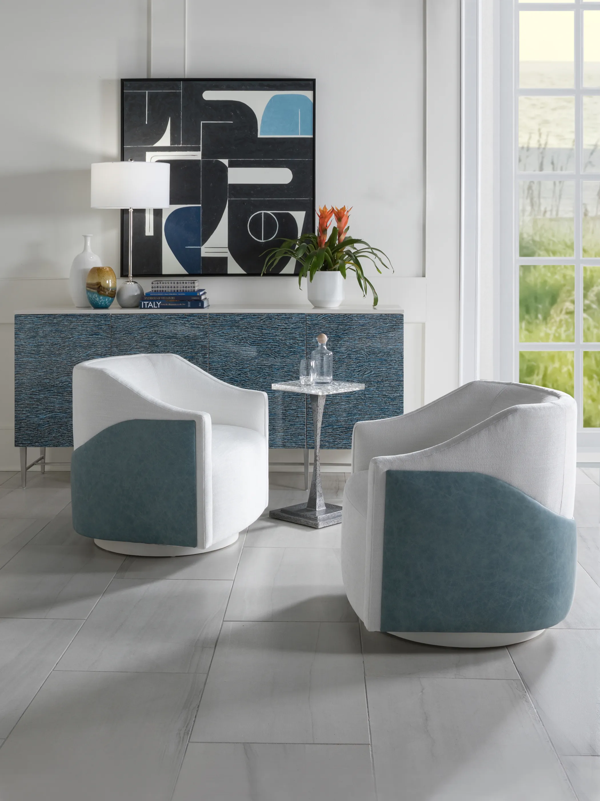 Based on the Ingrid footprint, the Raquel features a swooping overaly that can be contrasted with another fabric or leather. Its sloping arms make the silhouette feel more compact than Ingrid, even though they share the same overall dimensions. Swival chairs are best sellers for their comfort and ease of motion.