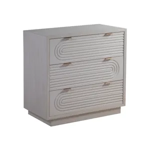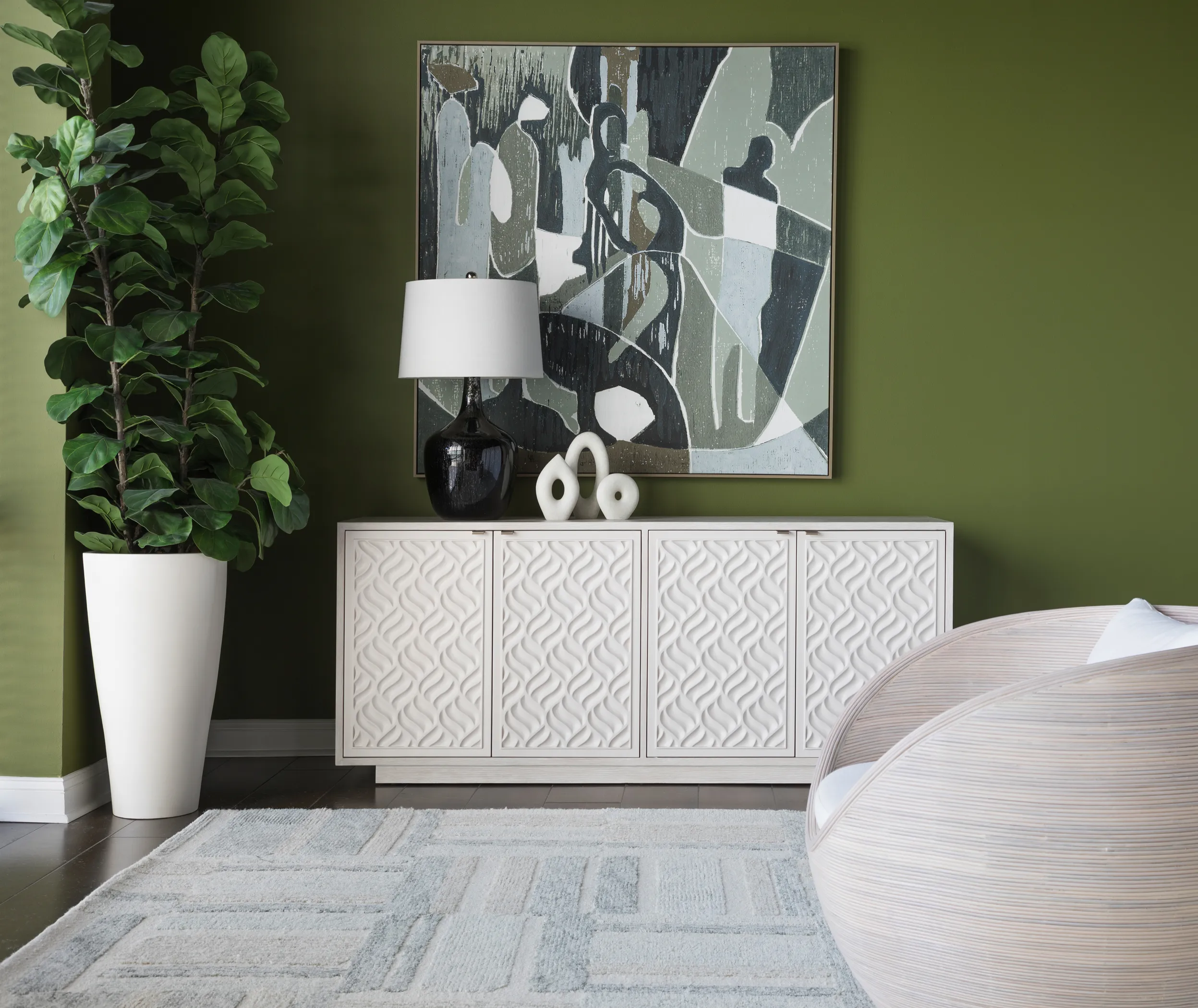 Contemporary original designs crafted from wire brushed quartered white oak, finished in a soft light cream with elegant ivory ceruse. Custom hardware gleams with a beautiful champagne finish, while the metal accents boast a stunning champagne silver leaf.