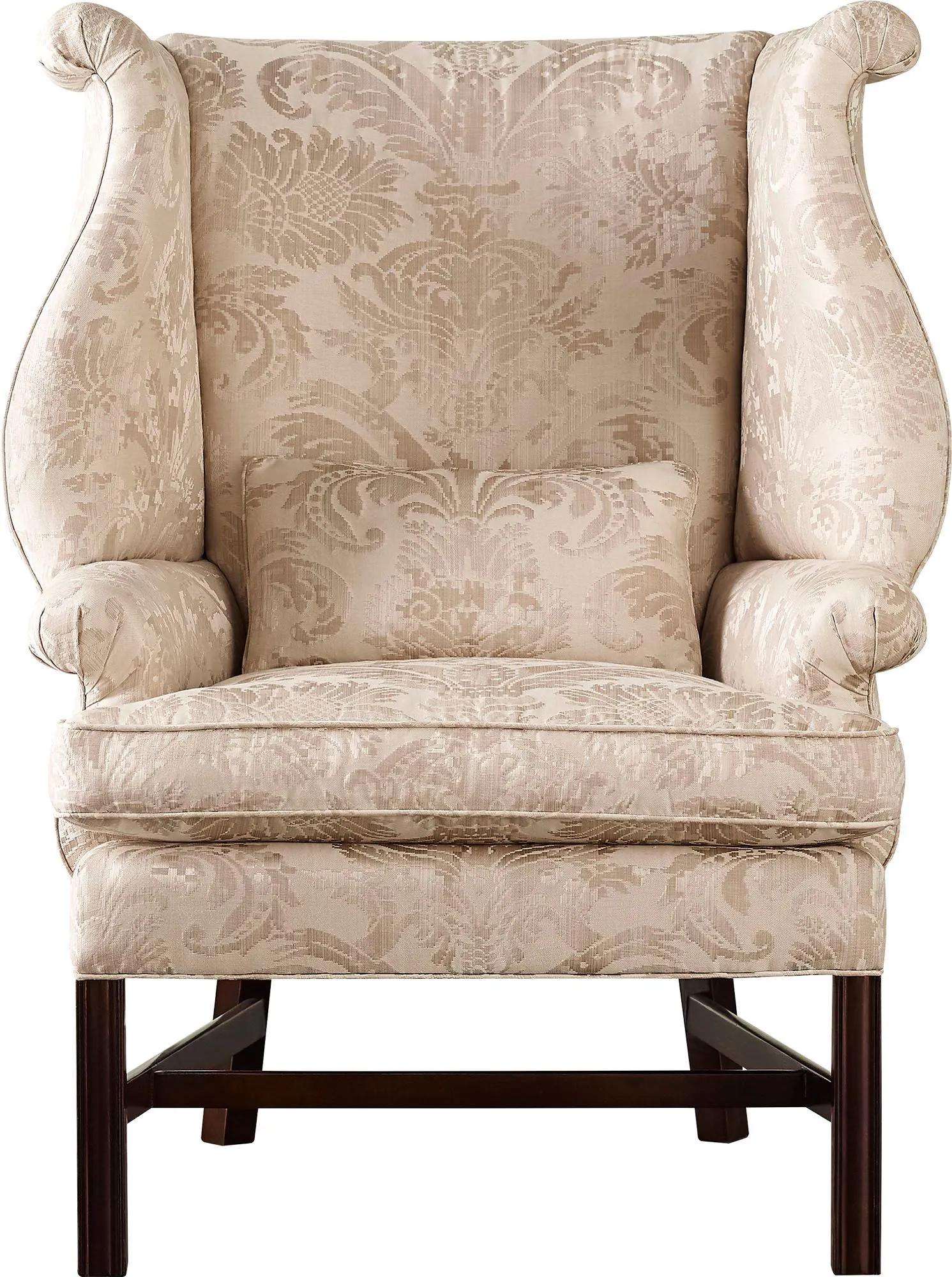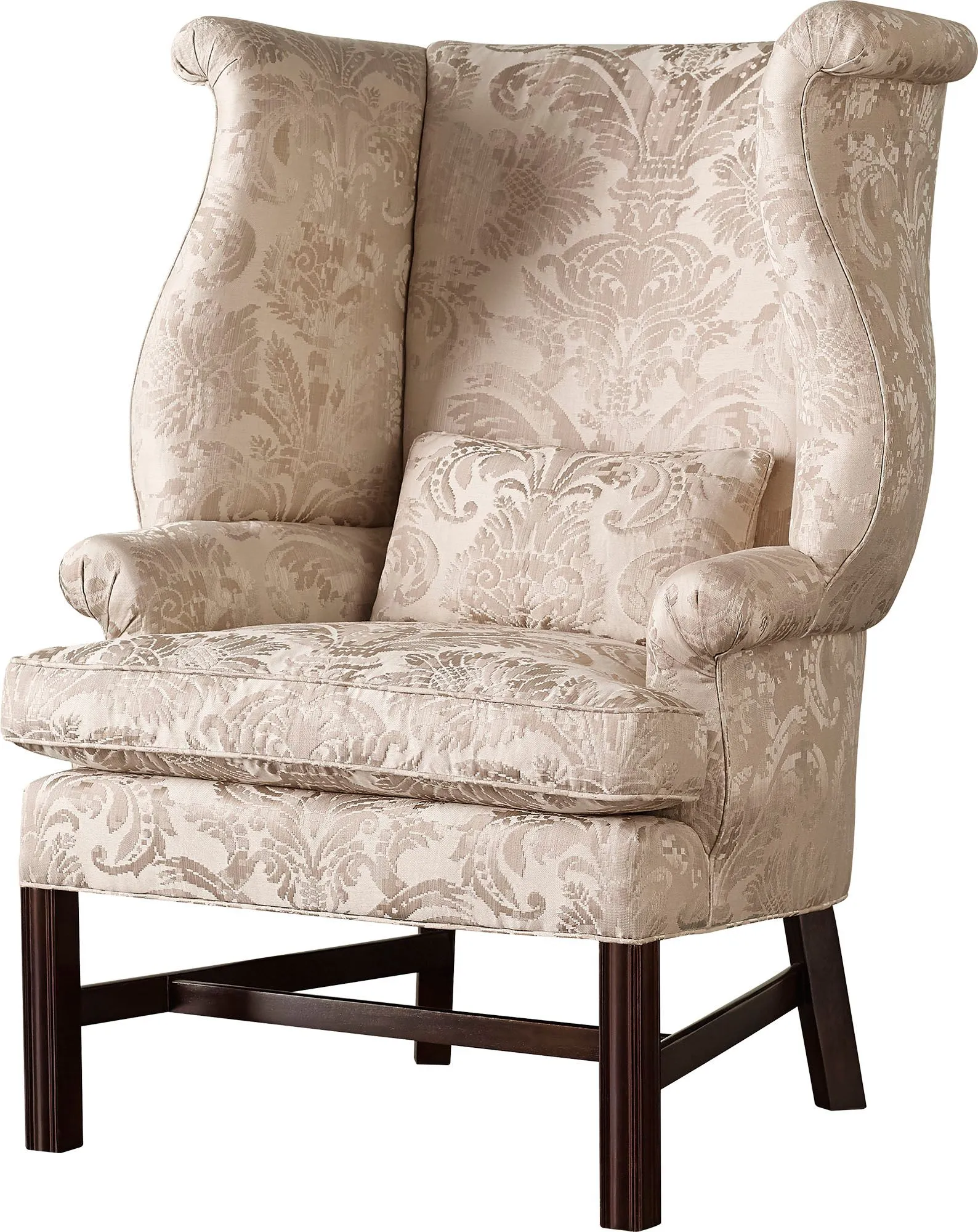 The Chippendale Scrolled Wing Chair is pure artistry—two unusually scrolled wings gently curve to bookend a rounded rectangular back. The rectangular seat frame and square moulded legs evoke British styling, circa 1760.