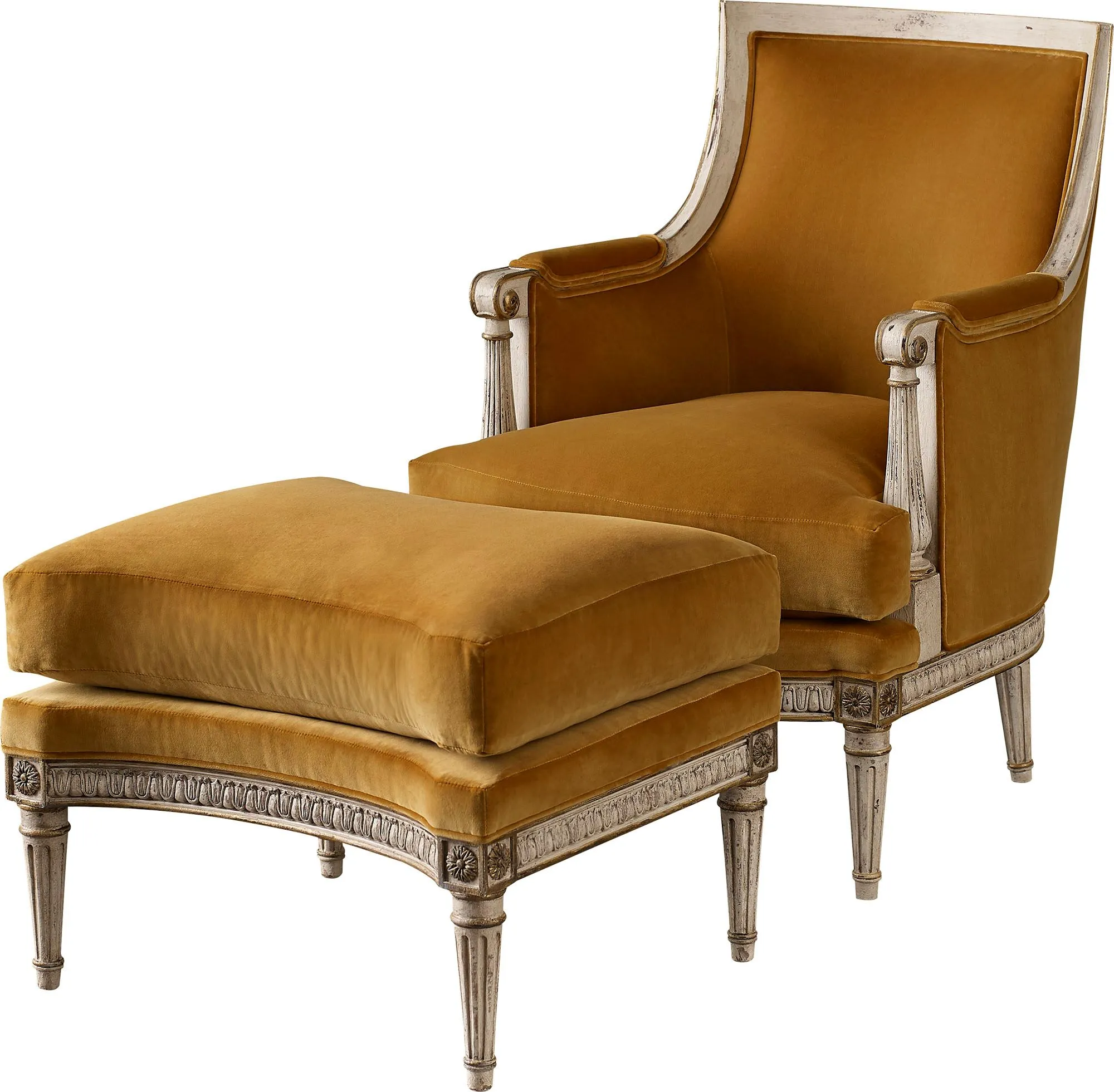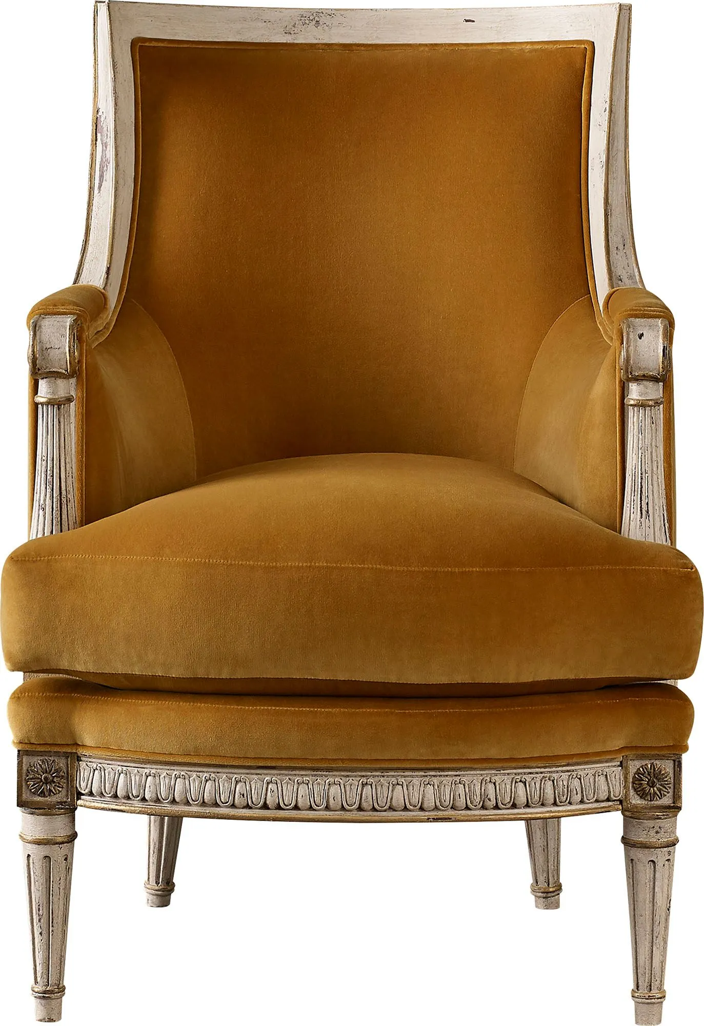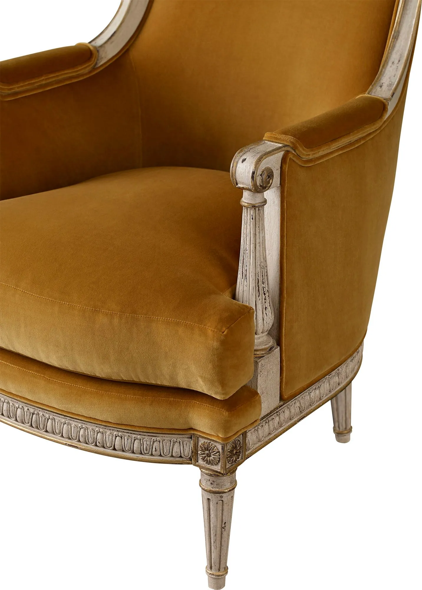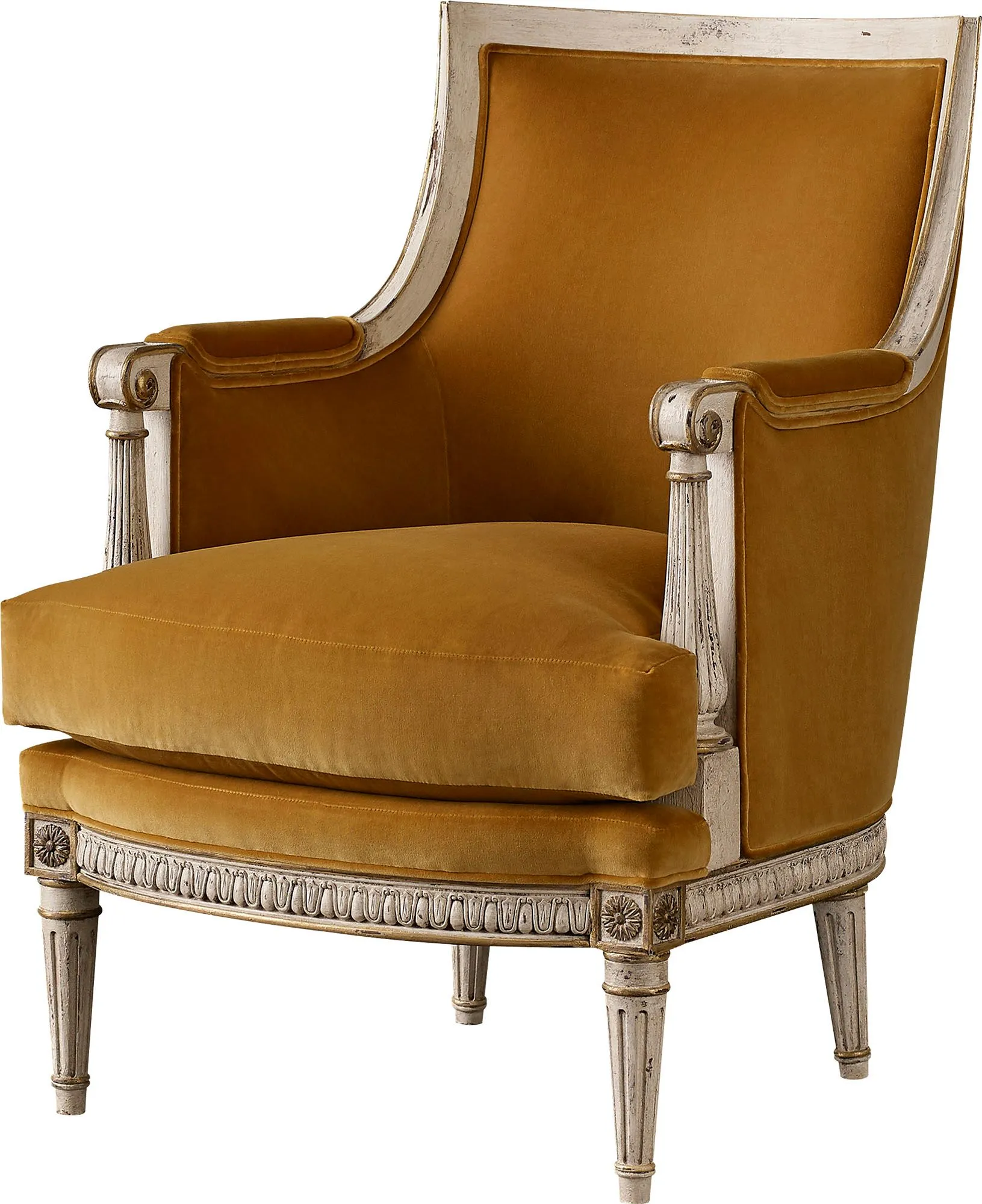 With a shaped and rounded silhouette and carvings throughout, the King Louis XVI Carved Chair has a stylish presence. Its floral motif and fluted legs are quintessential French design, circa 1770.