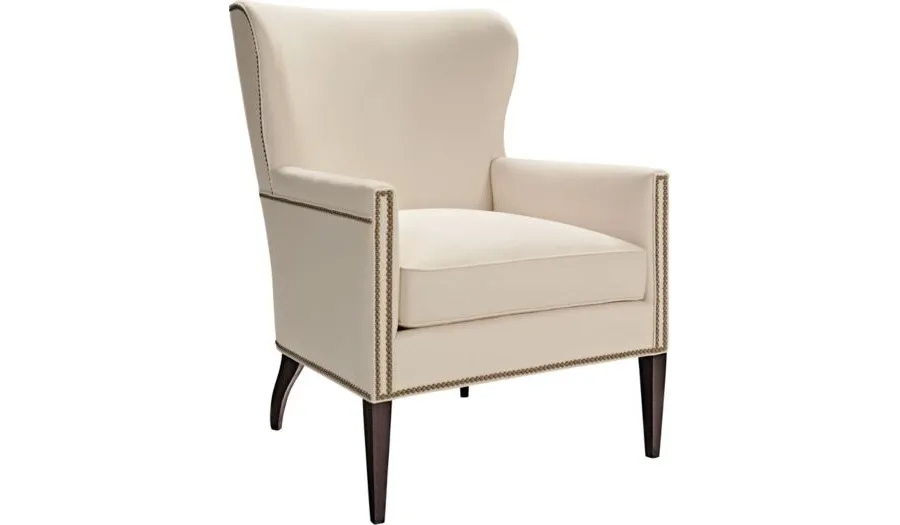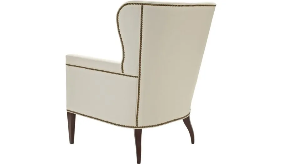 Interpreted from a 19th Century image from an English furniture catalog printed in London by G. Taylor between 1830-1850. The catalog is part of the extensive library at the Winterthur Museum. The barrel-back chair that inspired the Samuel Wing Chair appeared in print as early as 1803. The Samuel Wing chair features narrow, square capped arms, a perfectly contoured back with small, shapely wings and slender tapered front posts with splayed back legs. A Spring-Down seat cushion and nail head trim are standard. Shown in standard Espresso finish and NS-08 nail head trim.