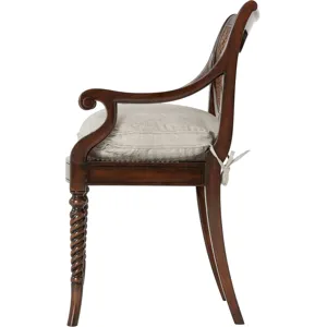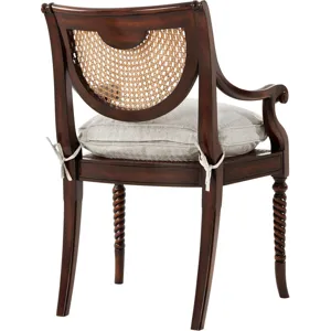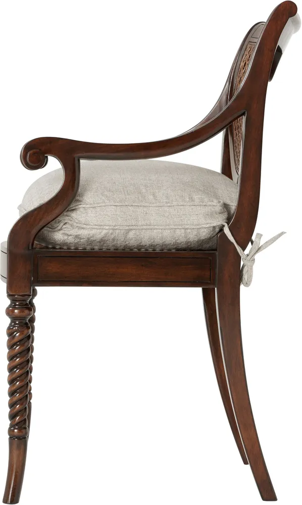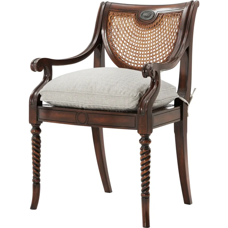 A hand carved armchair, the verdigris brass oval inset and caned back above a silk tie on cushion seat, on spiral turned legs. The original Regency.