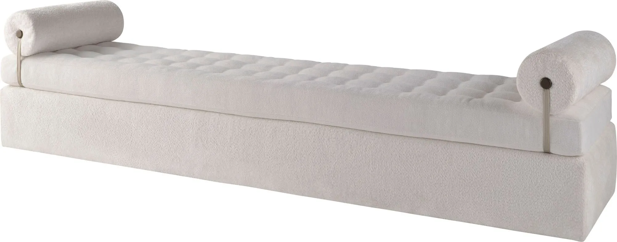 Capturing the essence of a quiet moment, the Lull Chaise offers an inviting, comfortable experience with an imaginative design. A square tufted bench cushion with a pair of bolsters anchored with leather strapping and bronze buttons create a modern, sophisticated look.