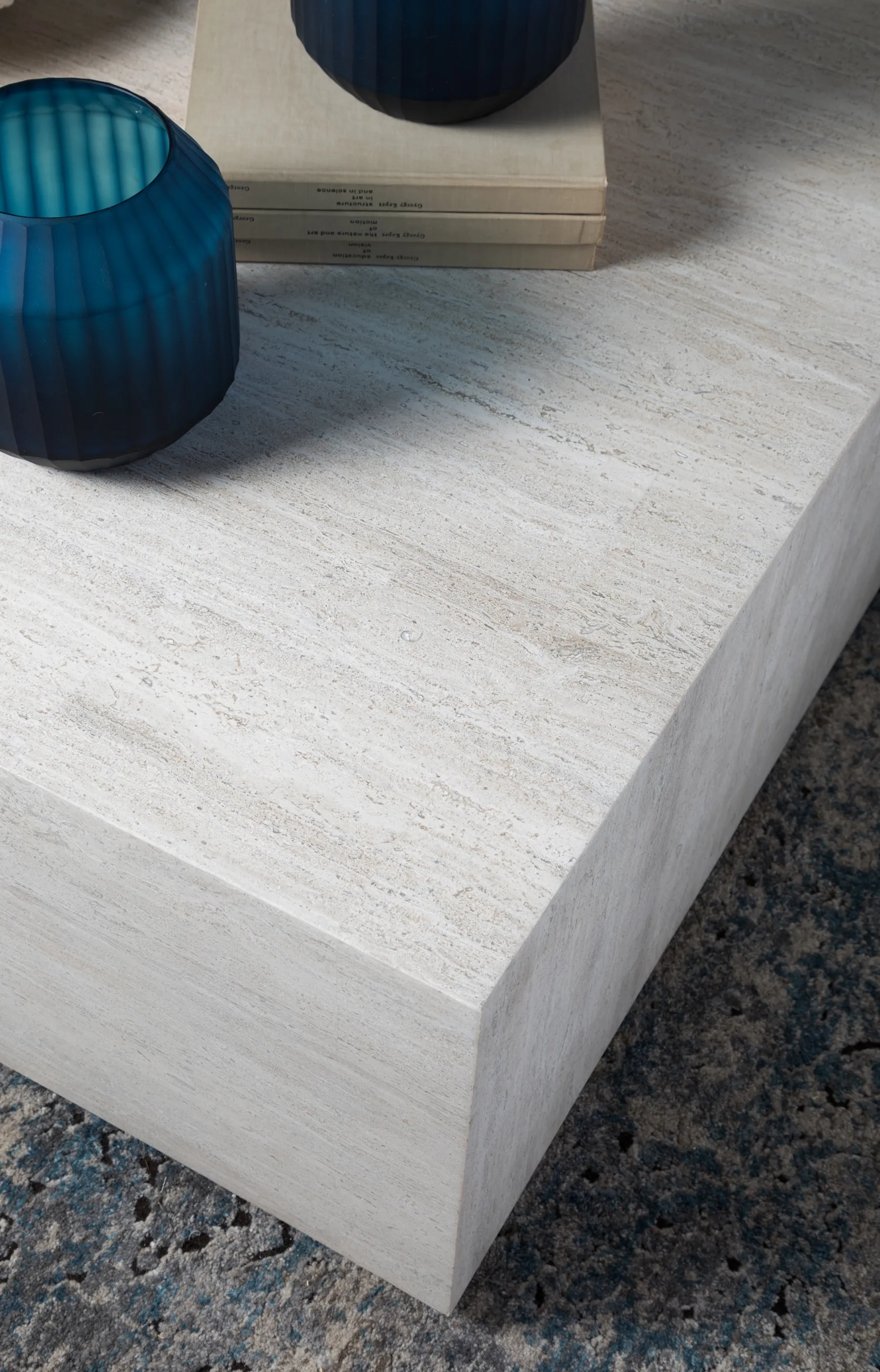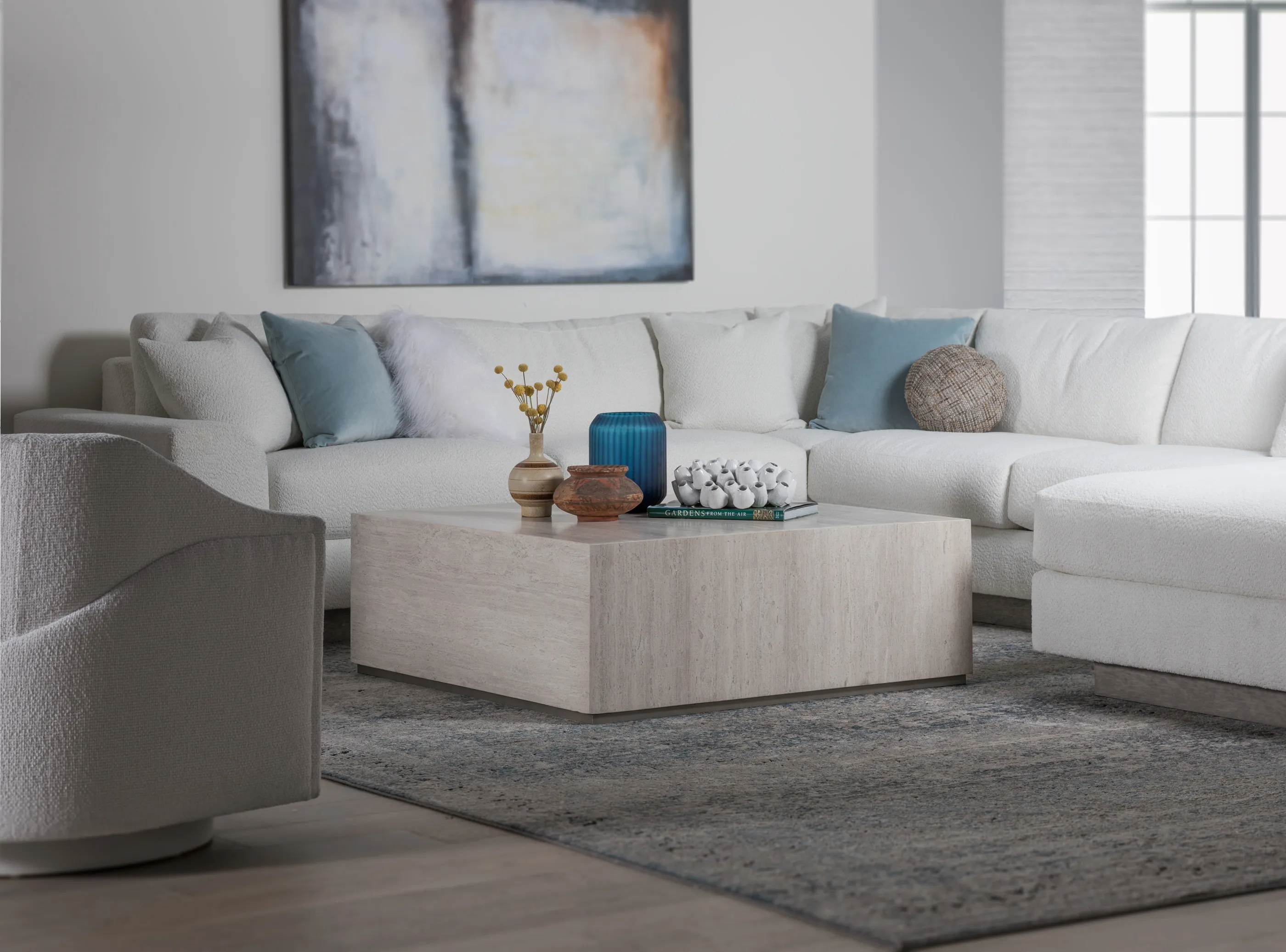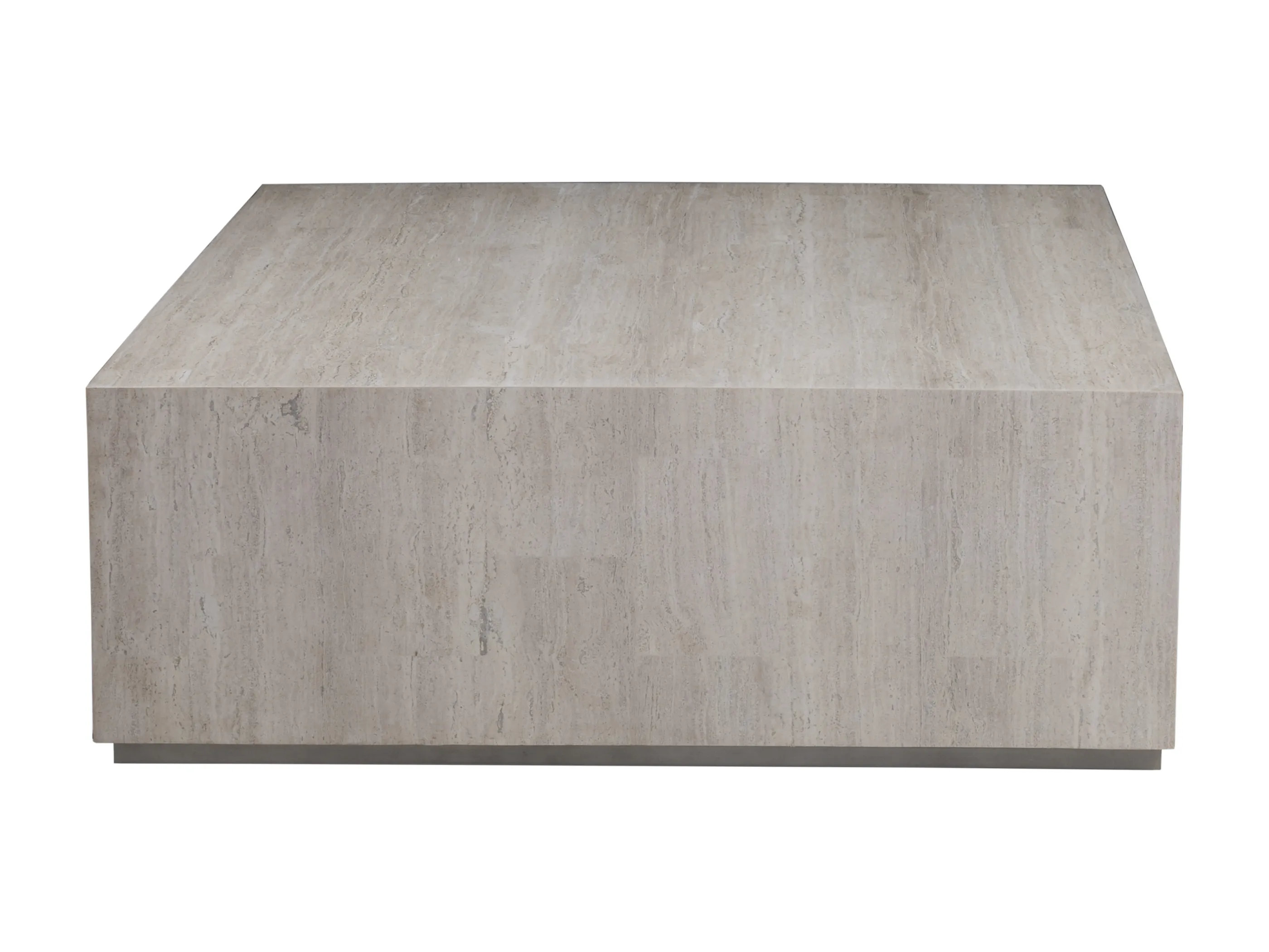 White veneered vein travertine with iron plinth in a silver finish, and natural variations of color. This is the only square design for the Cassio collection yet suitable for over-scaled sectionals.
