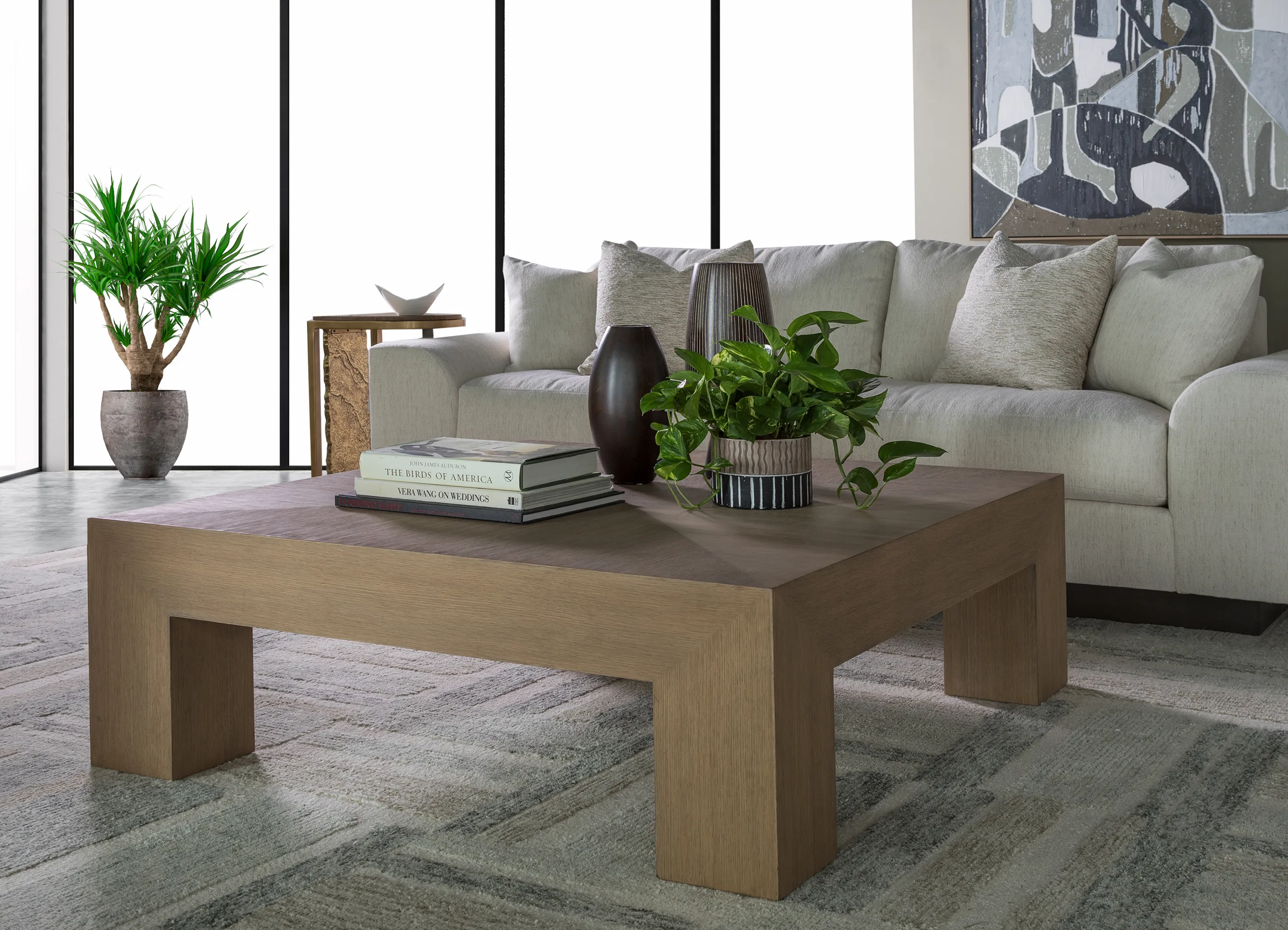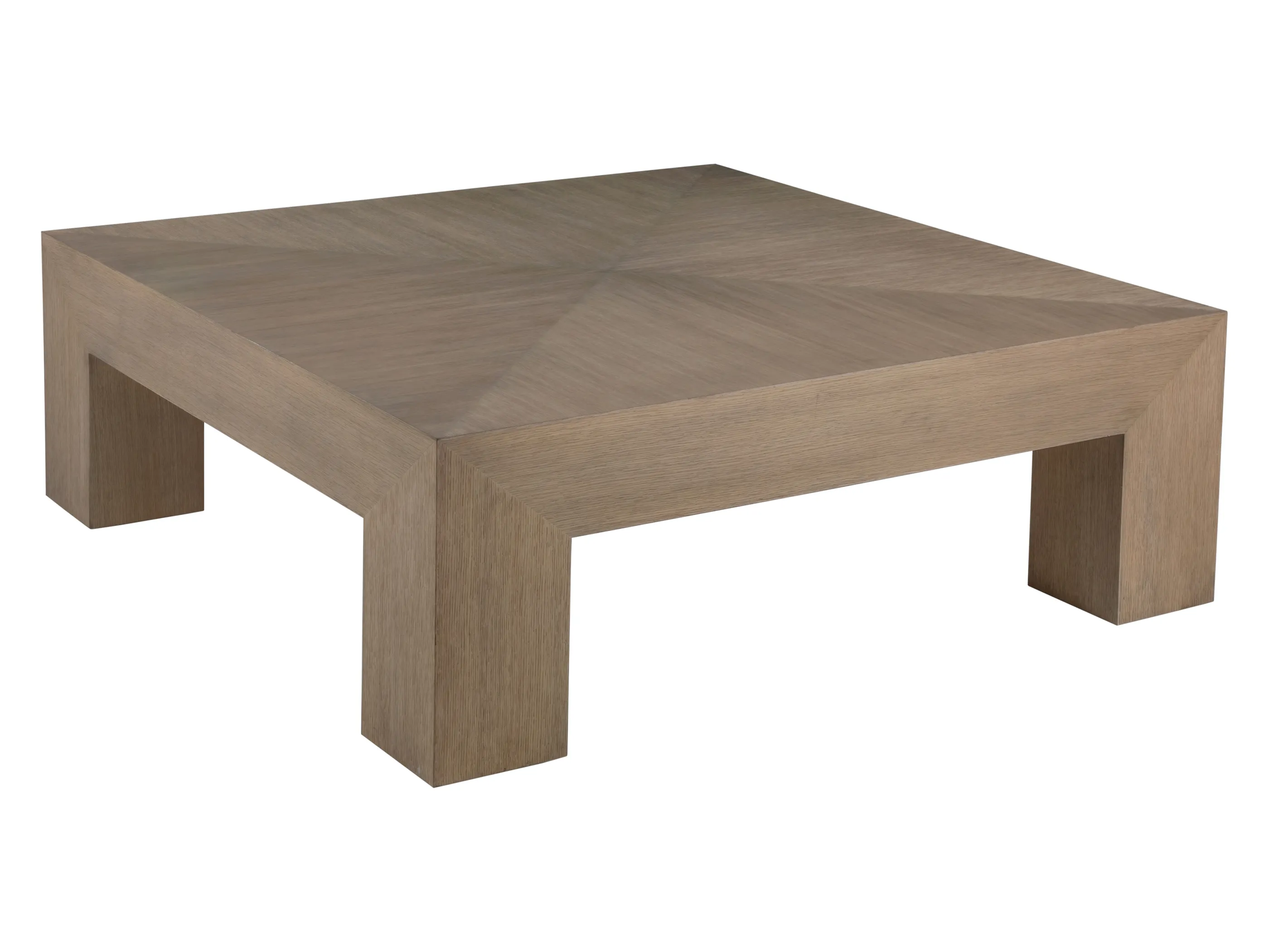 A square parsons cocktail with quatered white oak veneer pattern in the top. The over-scaled footprint is perfect for use with our sectionals.