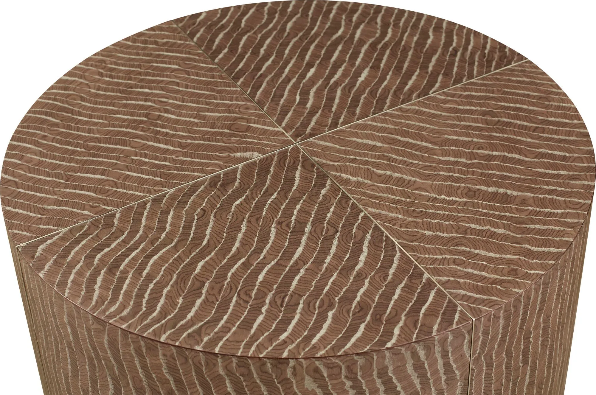 A classic pinstriped suit served as the inspiration for the Cylindrical Cocktail Table. Youthful and stylish, it features a platinum strea veneer with polished stainless steel inlay.