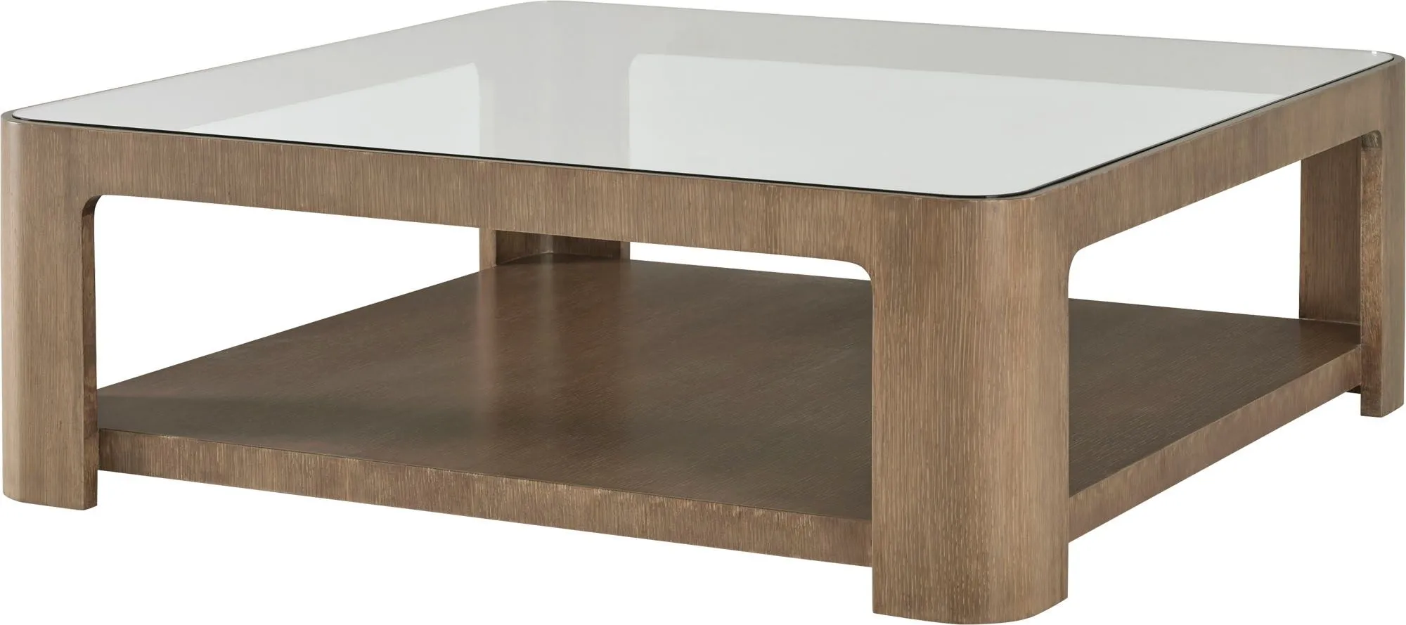 The Marin Cocktail Table is strong and geometric, pairing quartered oak veneer with a clear tempered glass tabletop. This modern table is the ultimate gathering place for camaraderie and conversation.