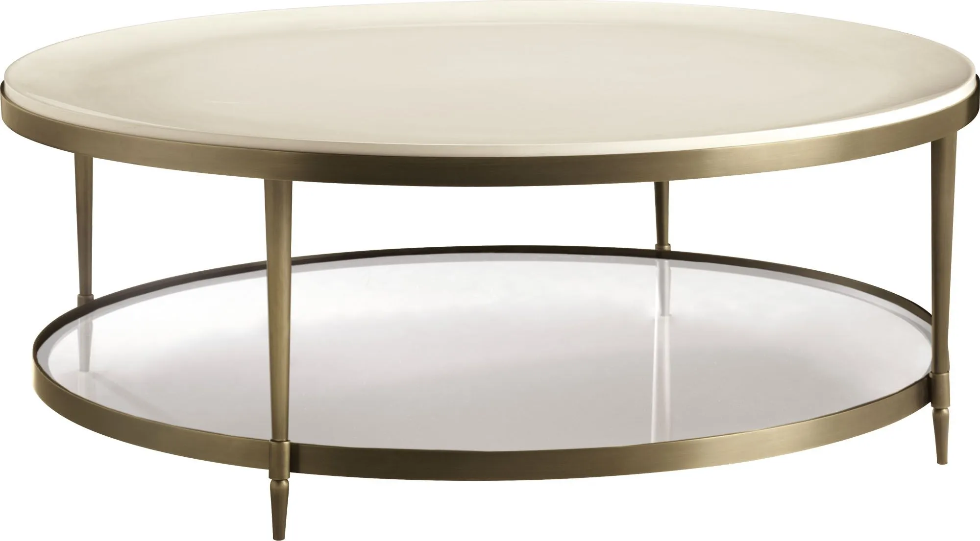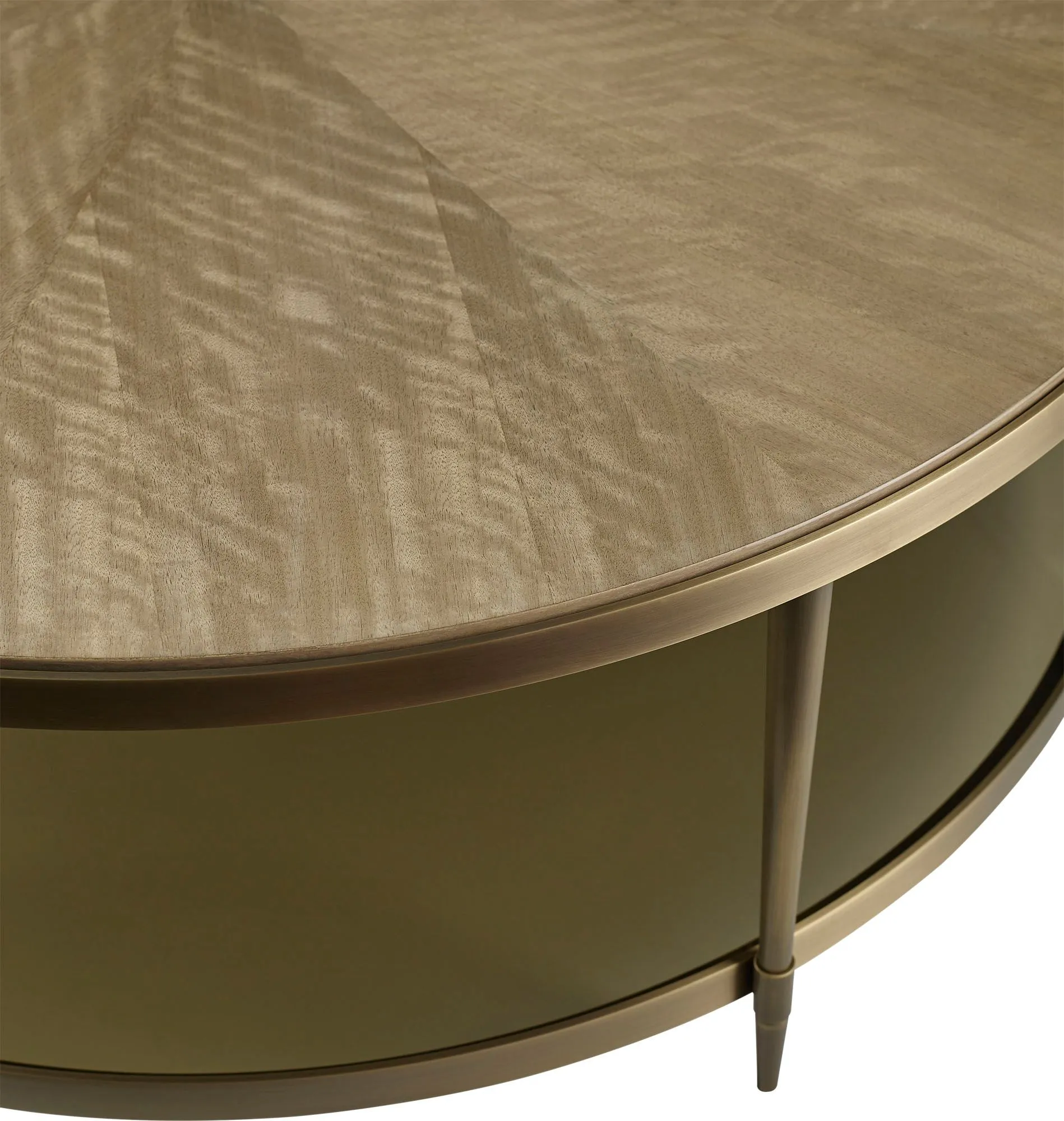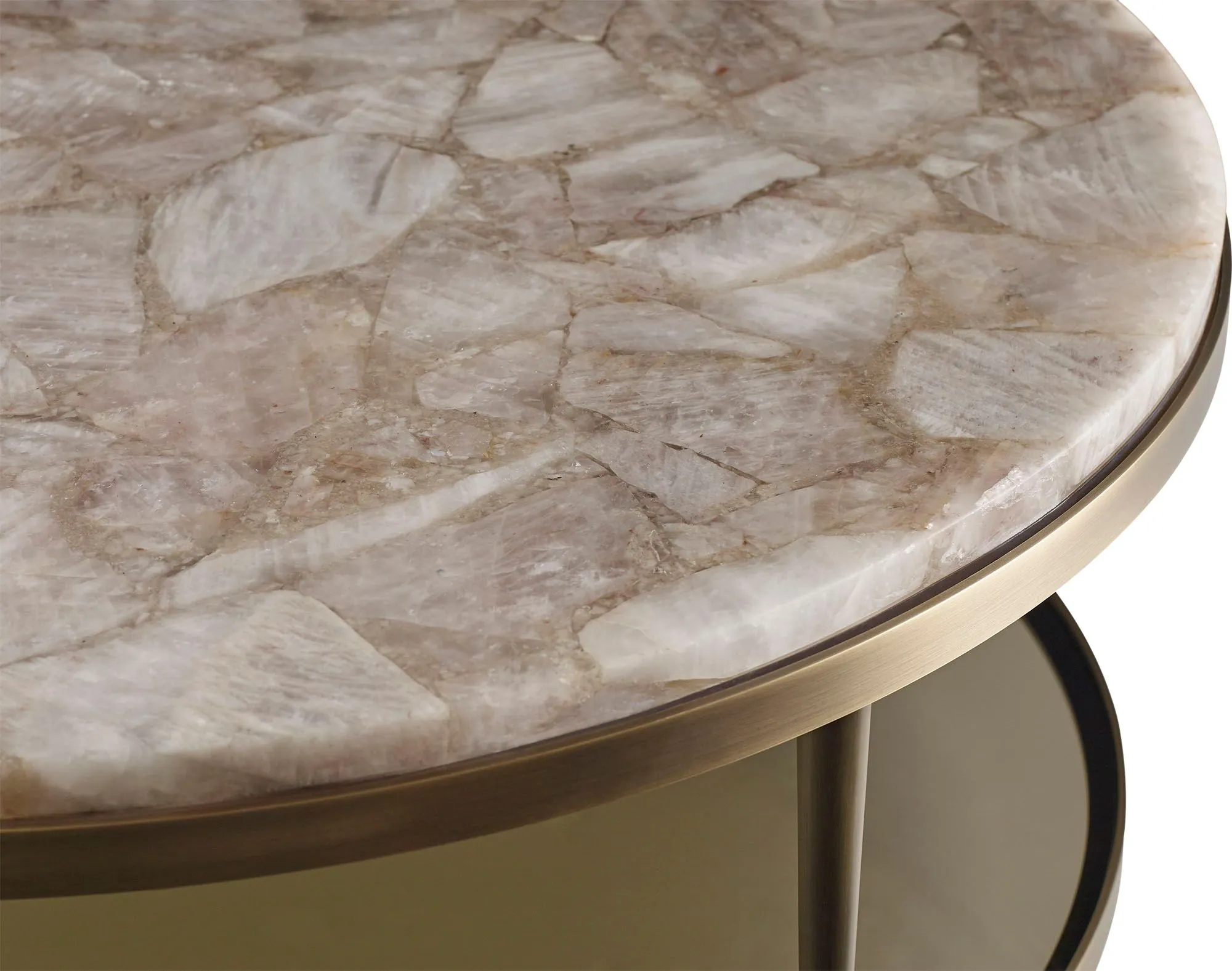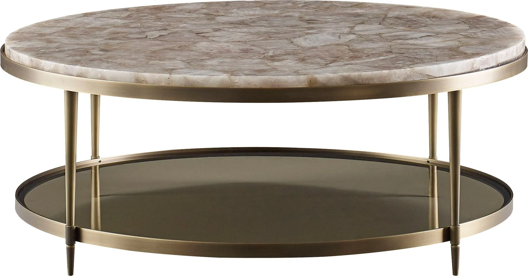 Inspired by the beauty of a cultured pearl, the Oberon Cocktail Table is a generous and sensual round form. The resin top swells down as if scooped out of a solid block. This subtle form is suspended in a bronze bezel and with a smoked glass shelf that hovers below on cast bronze feet. Now also available with figured quartered Walnut or Rose Quartz top.