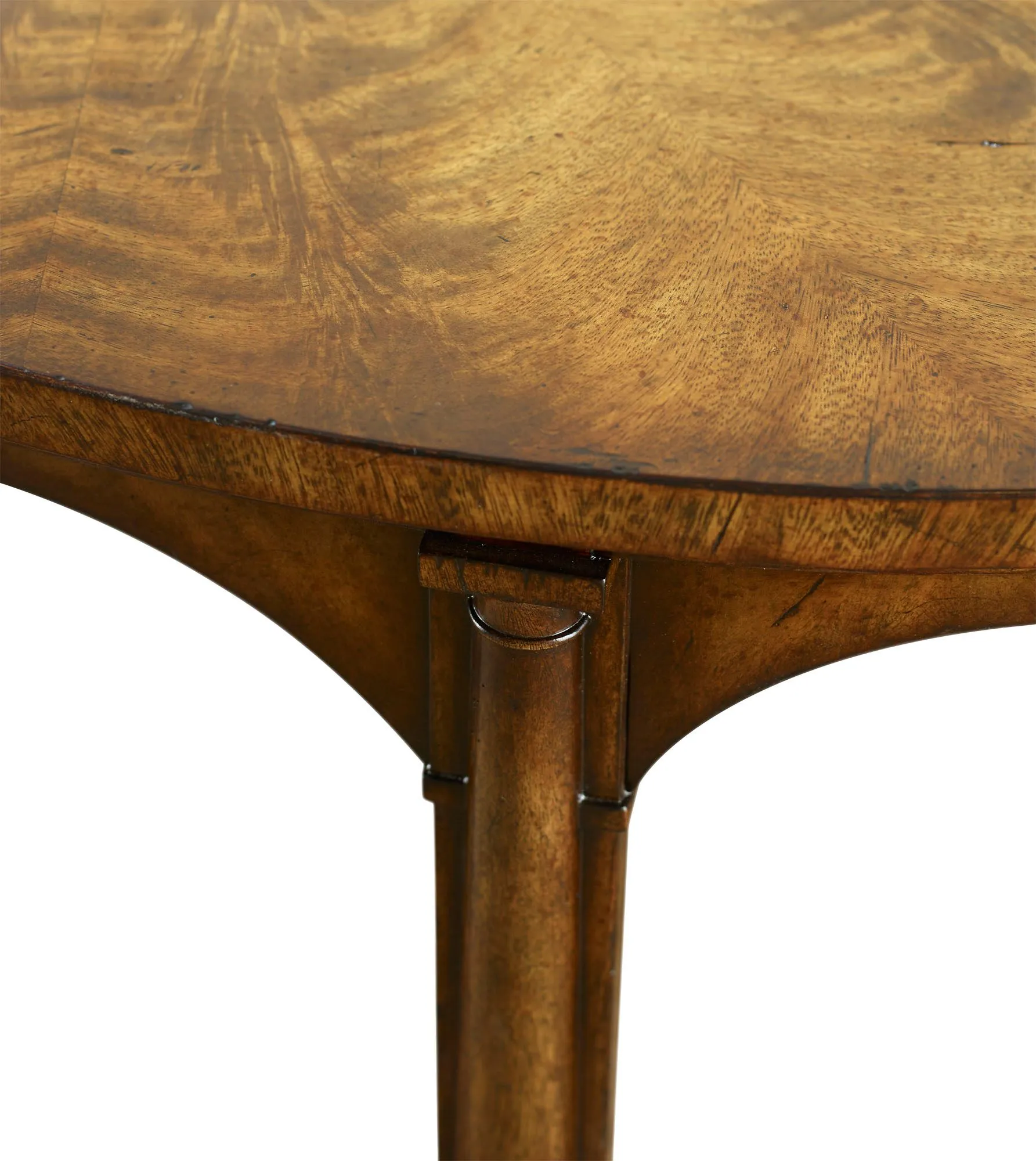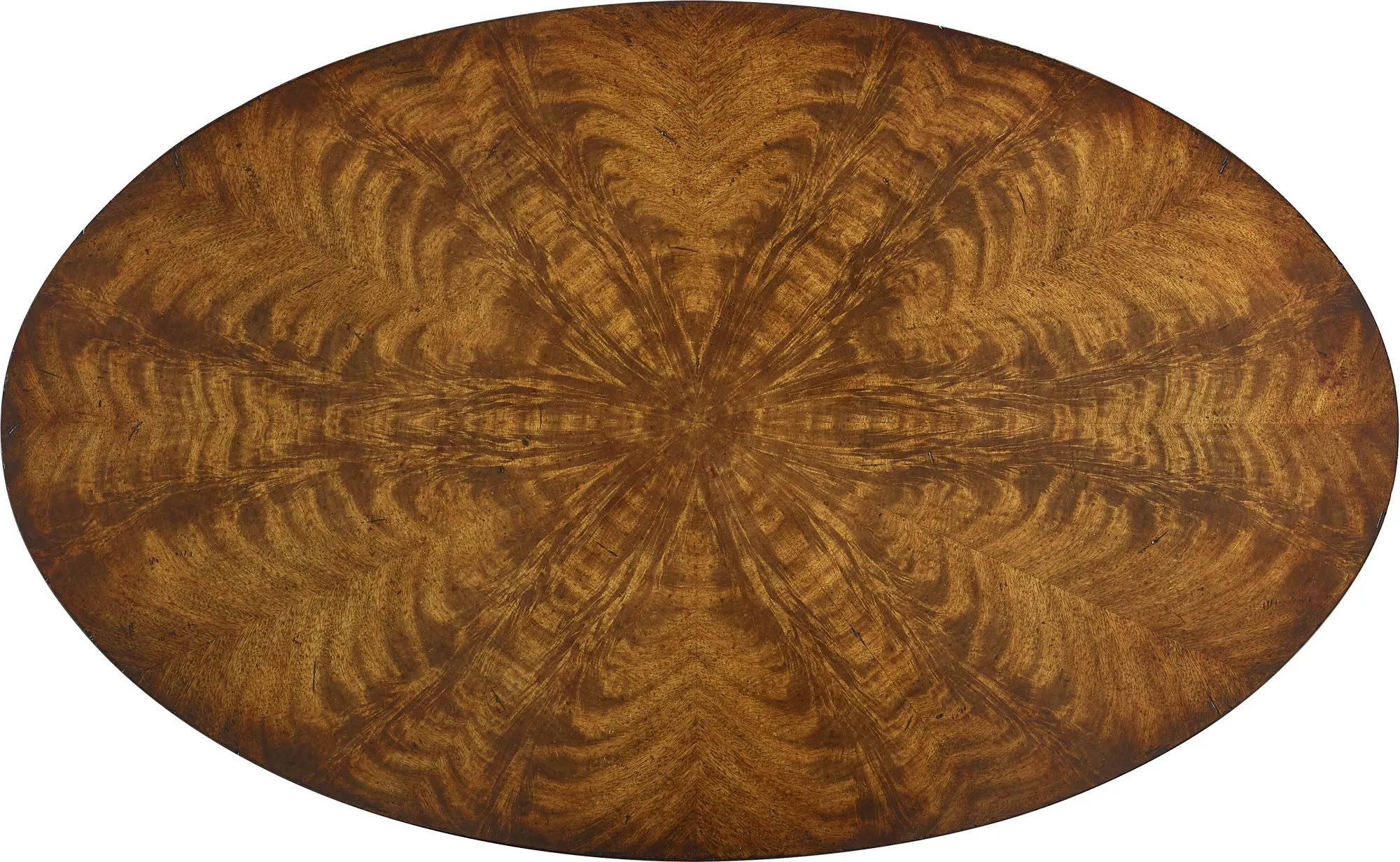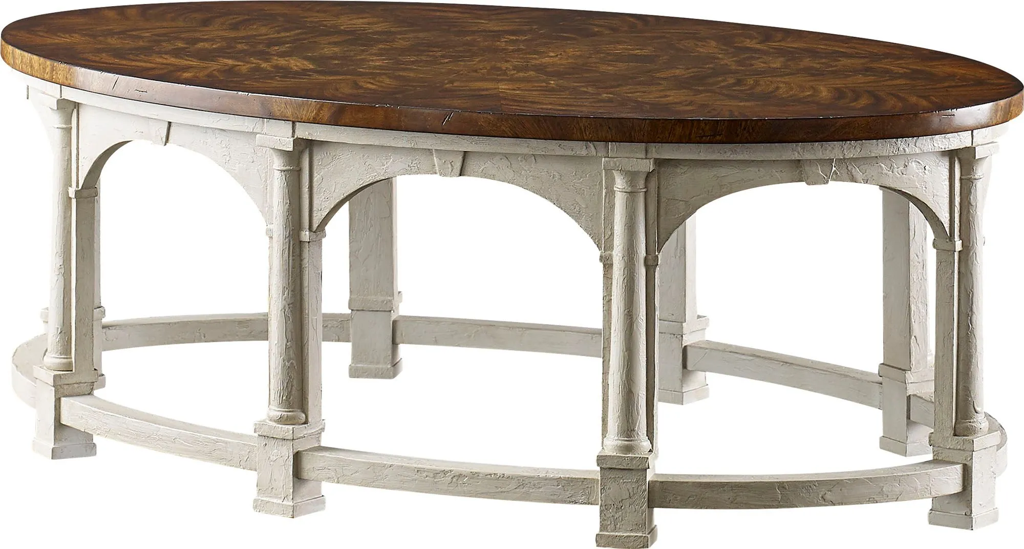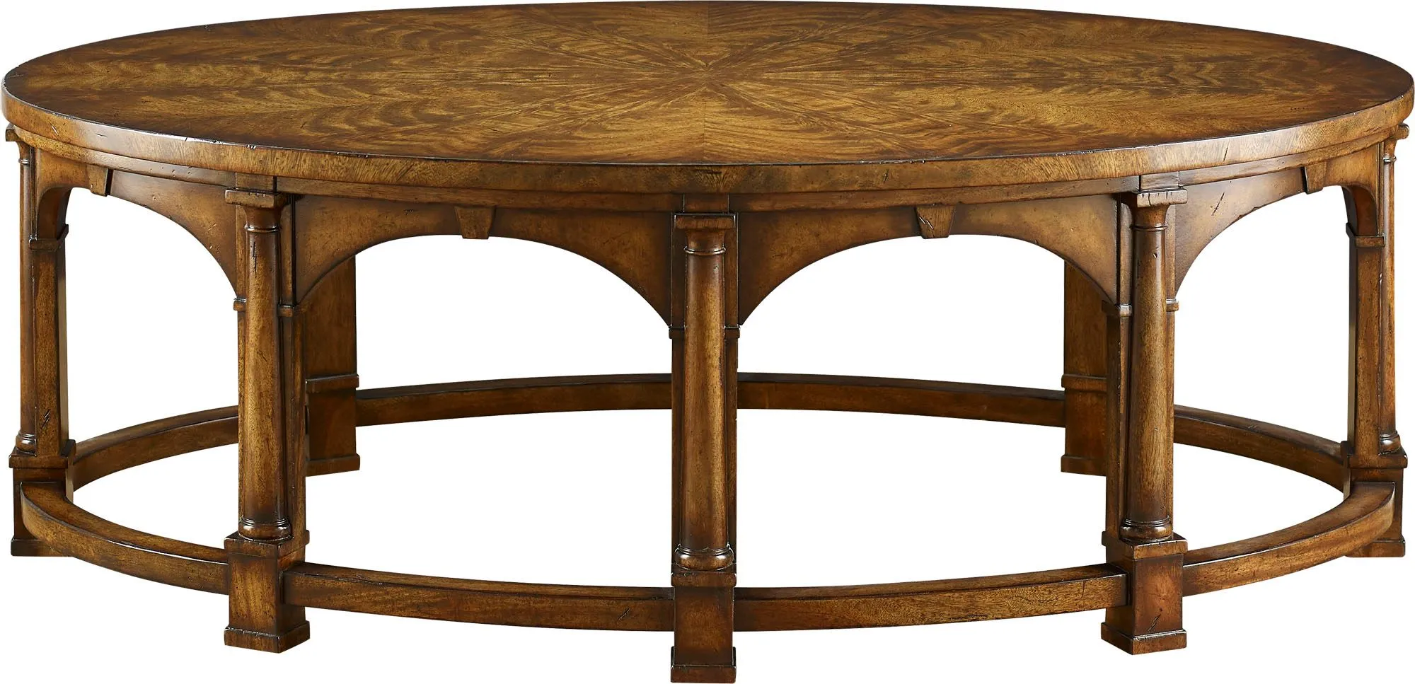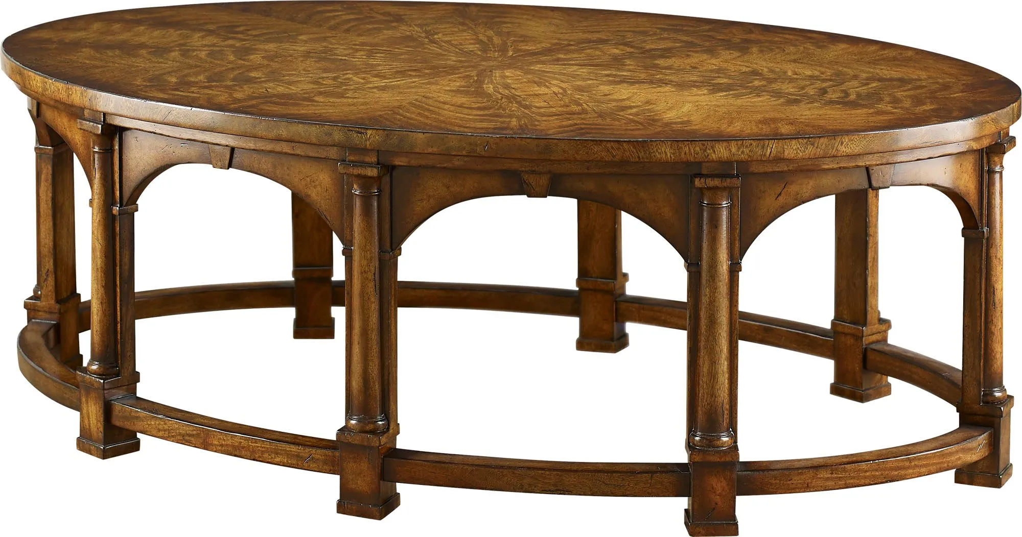 The early Edwardian period comes alive in the King Edward VII Cocktail Table. What first catches the eye are classic Doric columns that form an arched arcade, beneath an oval starburst-veneered top. An oval base and moulded feet complete the effect.
