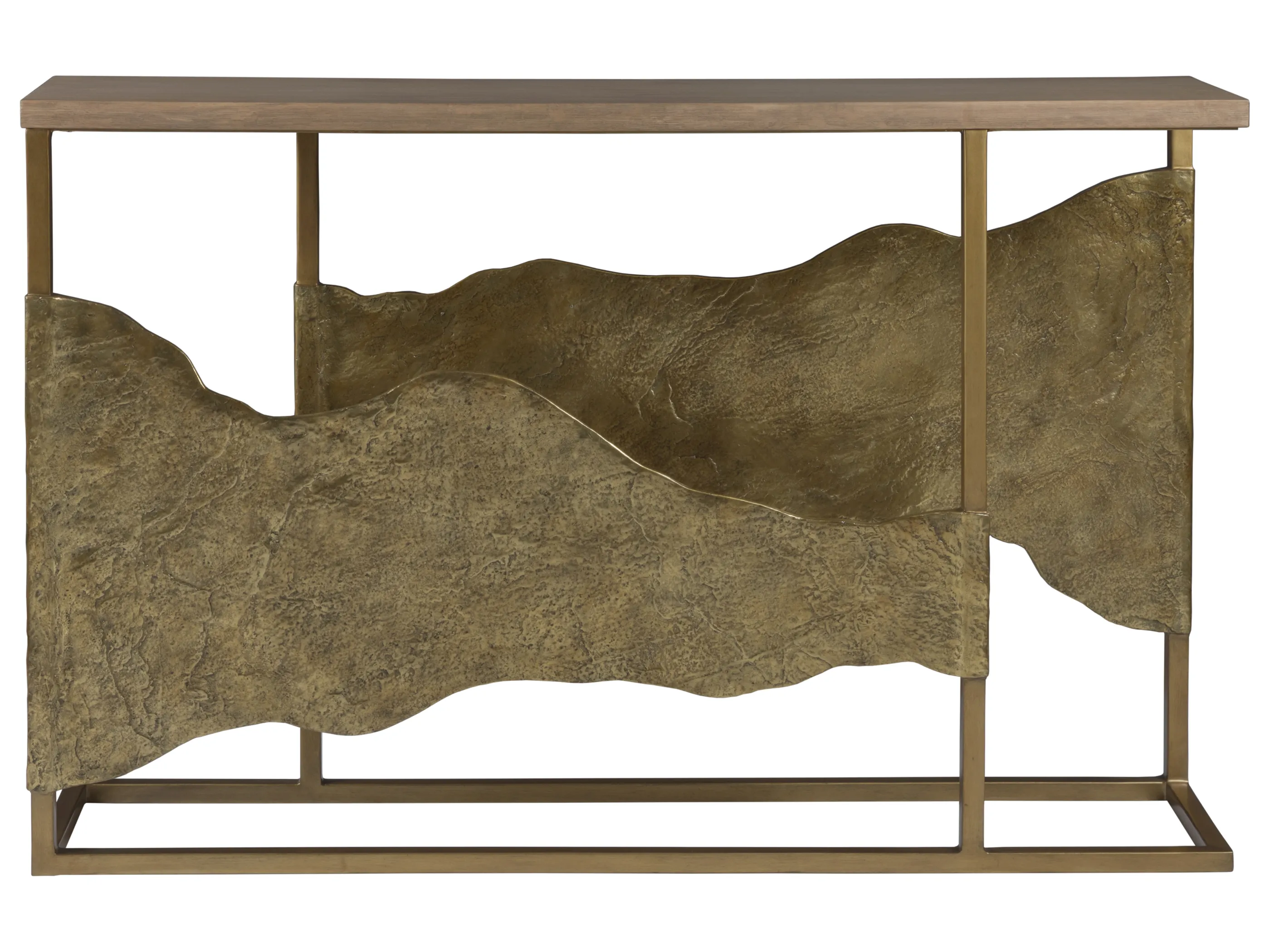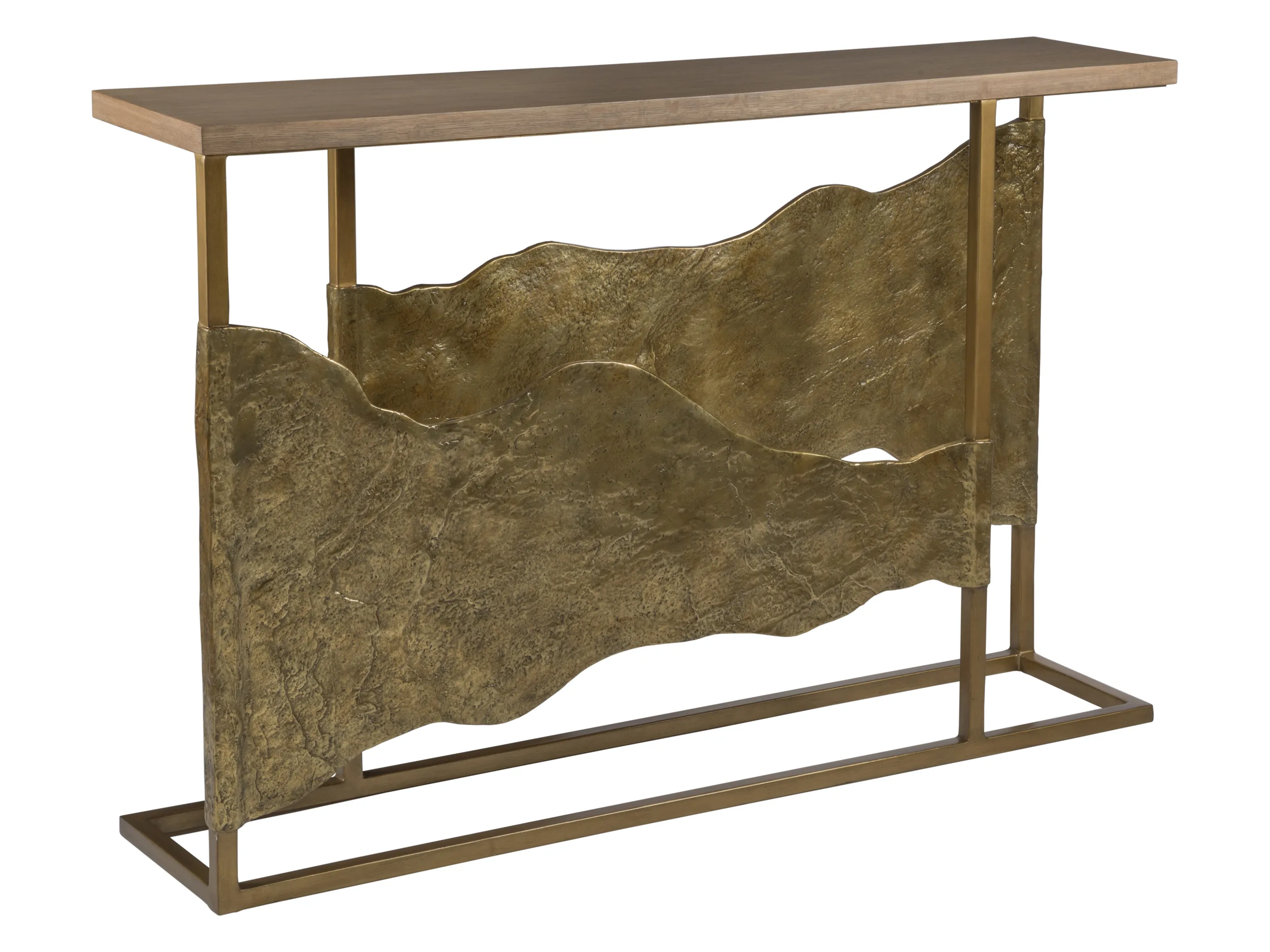 Simple form framed in iron and topped with white oak veneers, boasting stunning organic asymmetrical nature form castings of Brazilian slate clad in bronze.