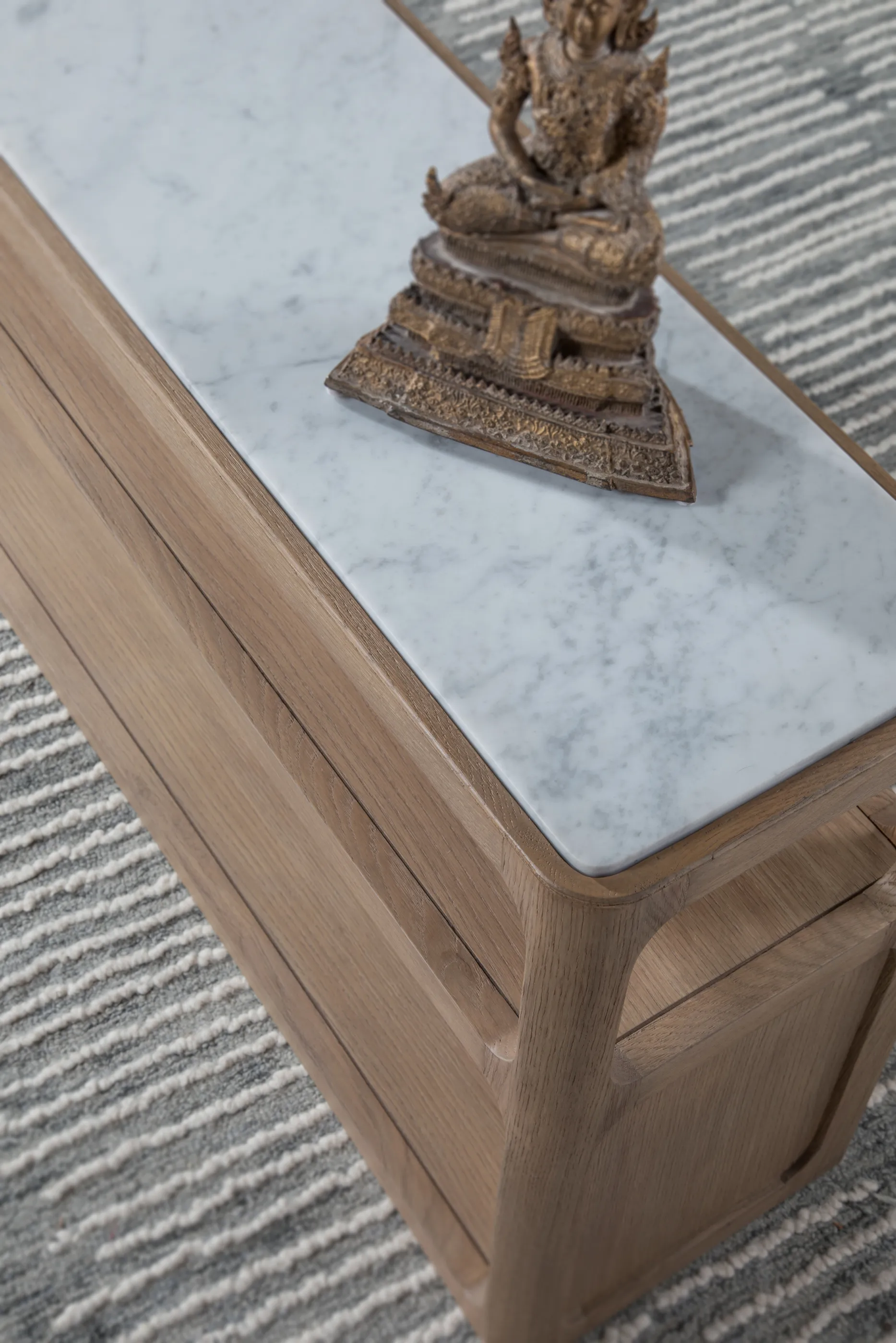 Great Room collection featuring New Traditional to Transitional original designs dressed in a natural white oak finish with light wire brushing and a silky, dry hand and appearance. Accent materials include Italian Carrara marble, natural seagrass, iron, and nature-form castings of Brazilian slate finished in champagne bronze. The term New Traditional is overused and typically undefined. To us, it means taking forms that have existed for many generations and interpreting them into the present as fresh and versatile designs with textural, on-trend finishes and materials...Simpatico represents exactly that.