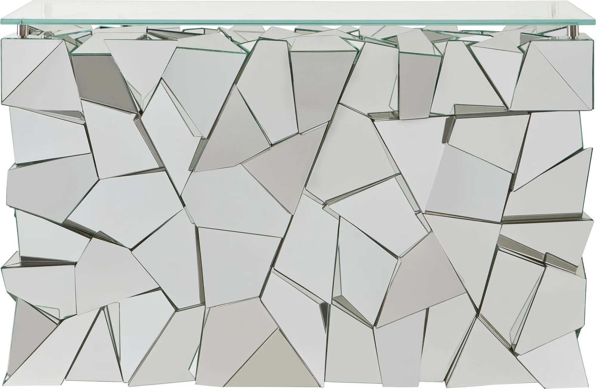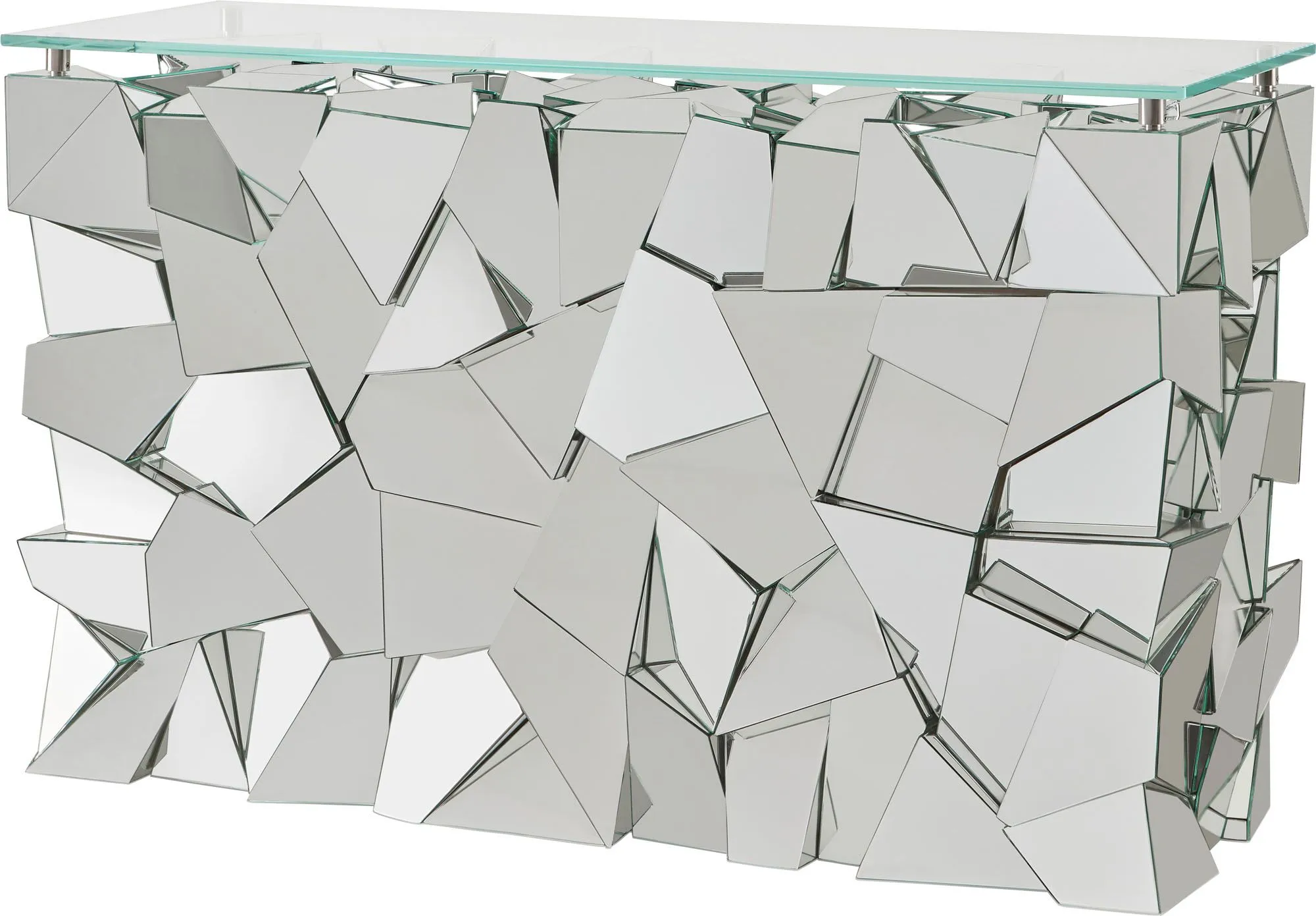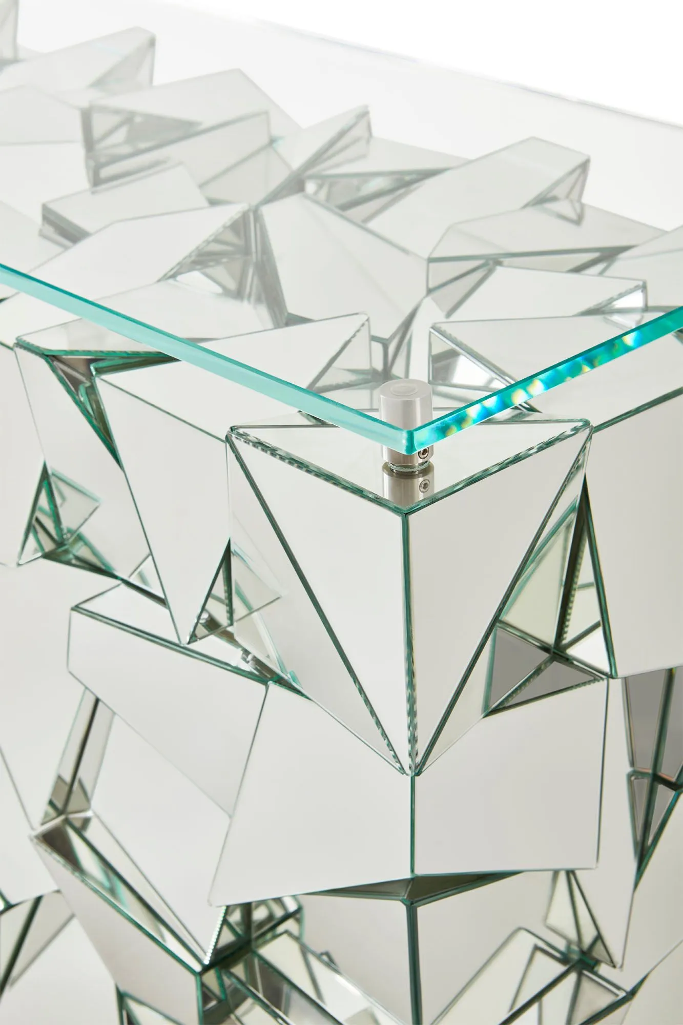 The fashion-forward Reflection Console carries on the spirit of 1970s modernism. Its disco ball-inspired design casts a stunning kaleidoscope of light. The starphire glass top has the option to be removed for a more sculptural look.