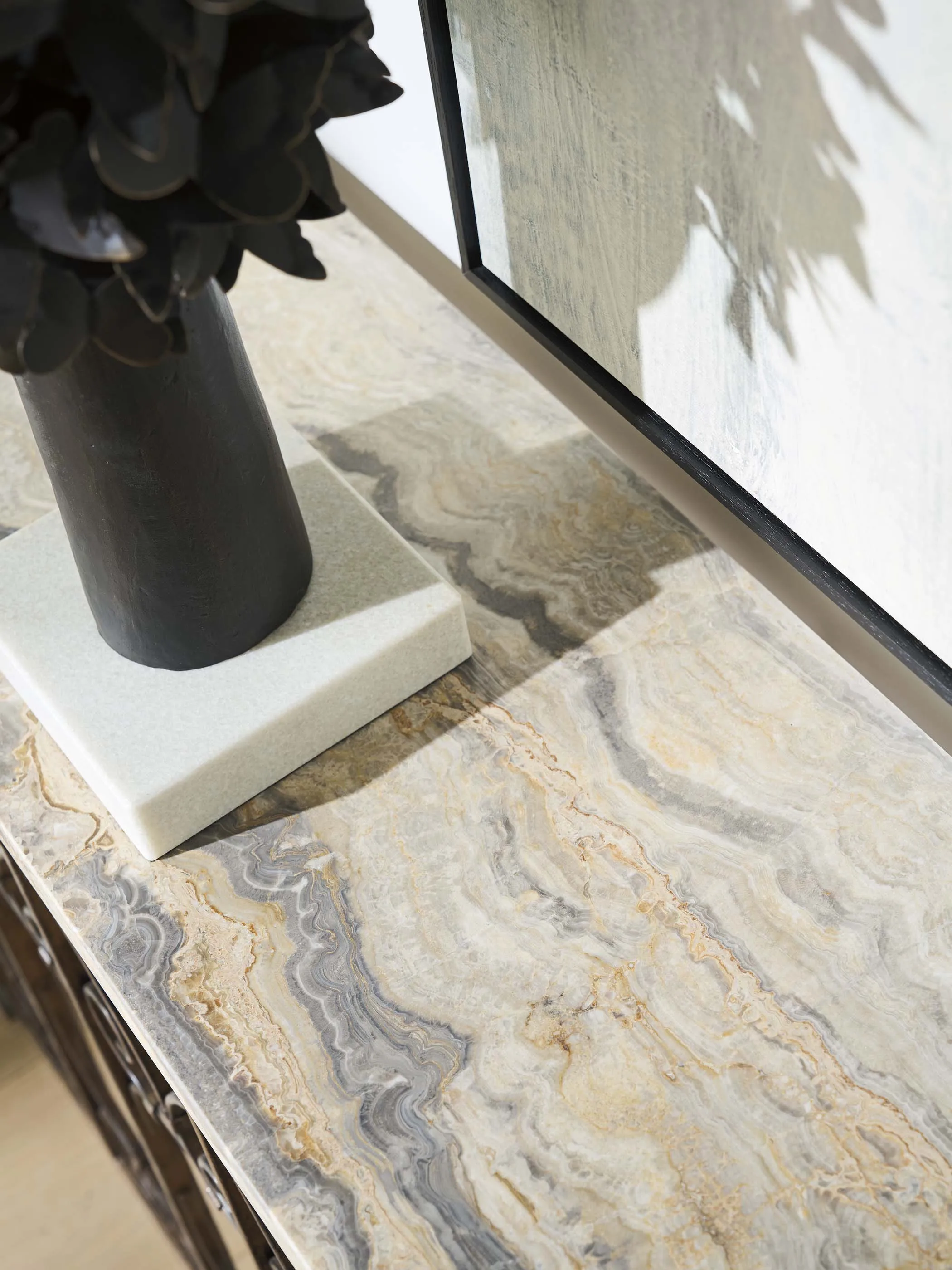 The 74-inch Fletcher console features elegant open scrollwork on the metal base, finished in hammered bronze and a beautiful Verrado stone top. As a natural material, the veining and colors in the stone will vary.