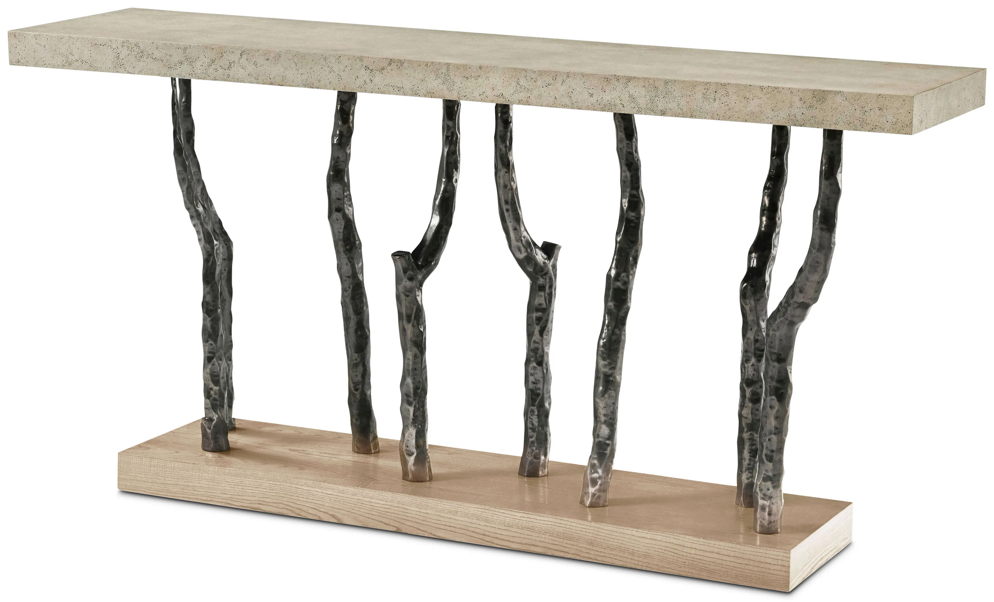 Contemporary console table made of figured ash available in Dune or Earth with cast metal legs in our Volcanic finish and done with our stone-like porous Mineral Finish at the top.