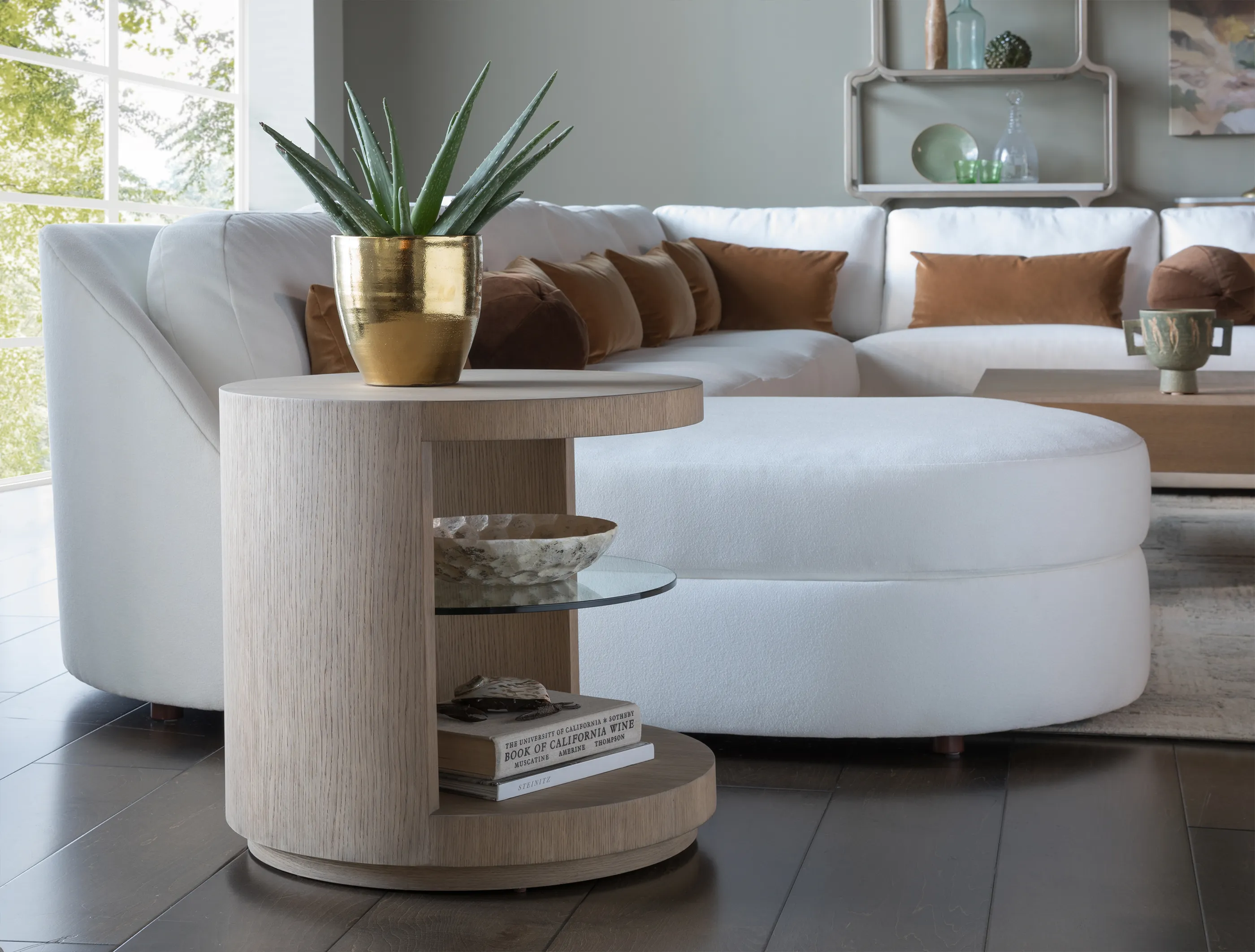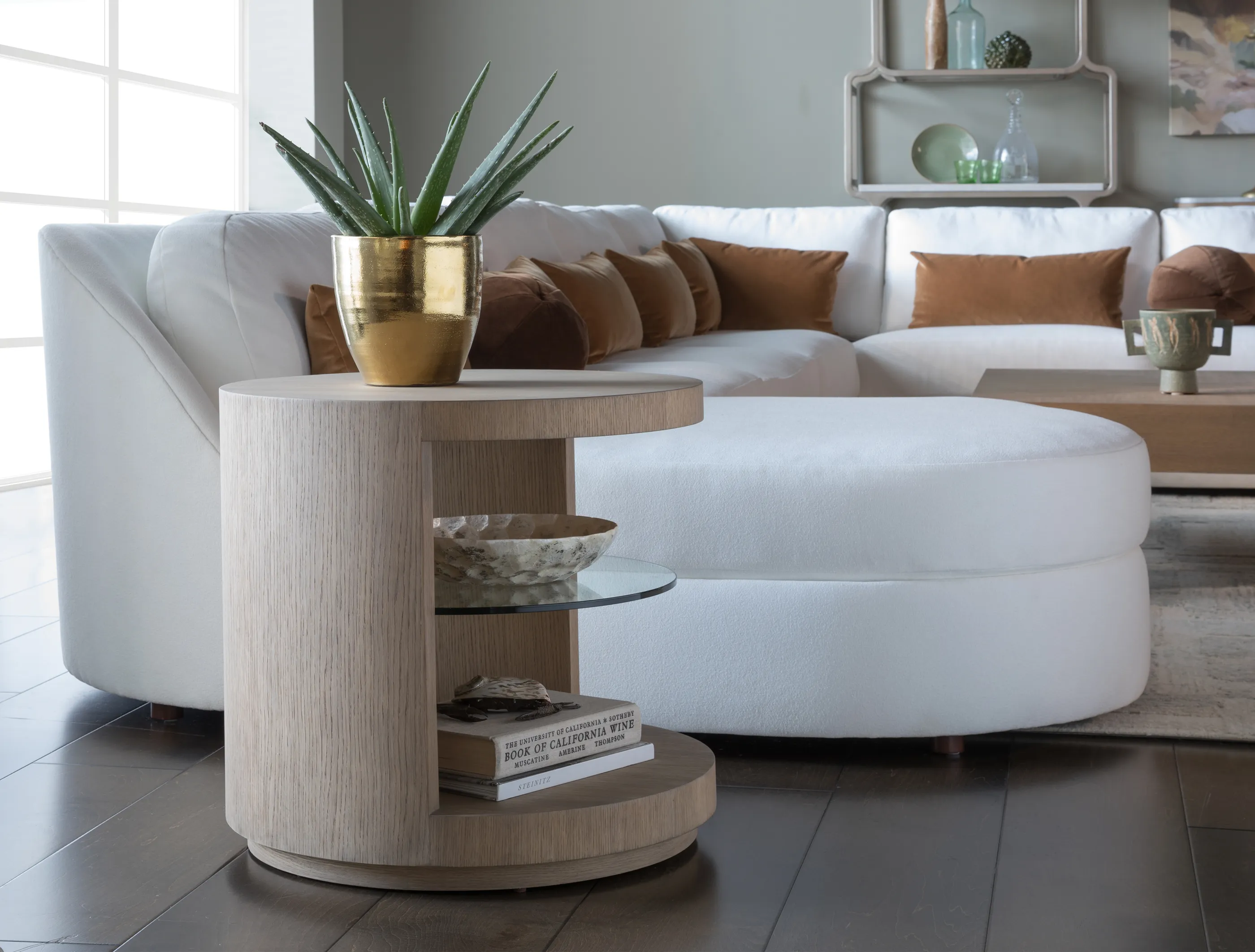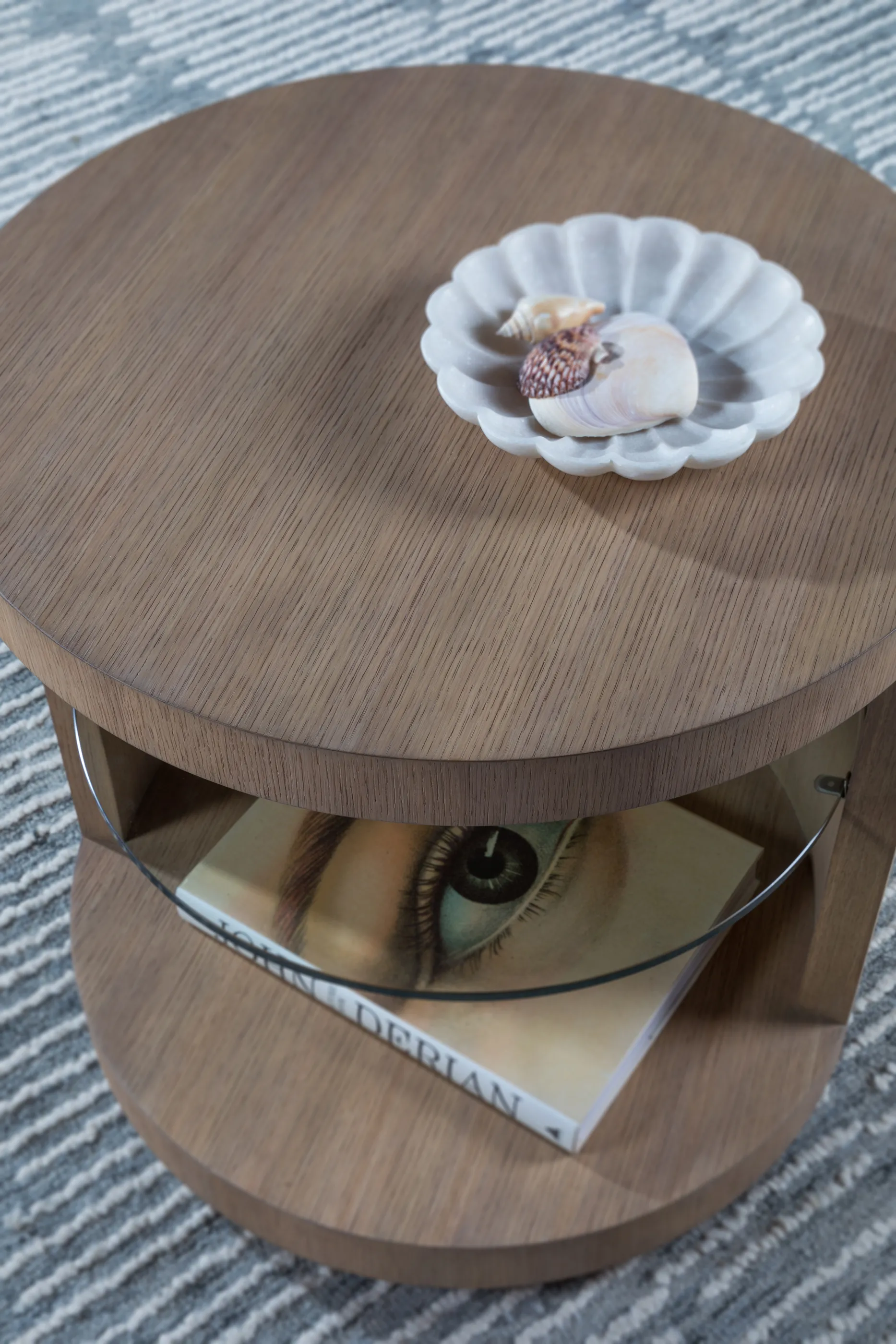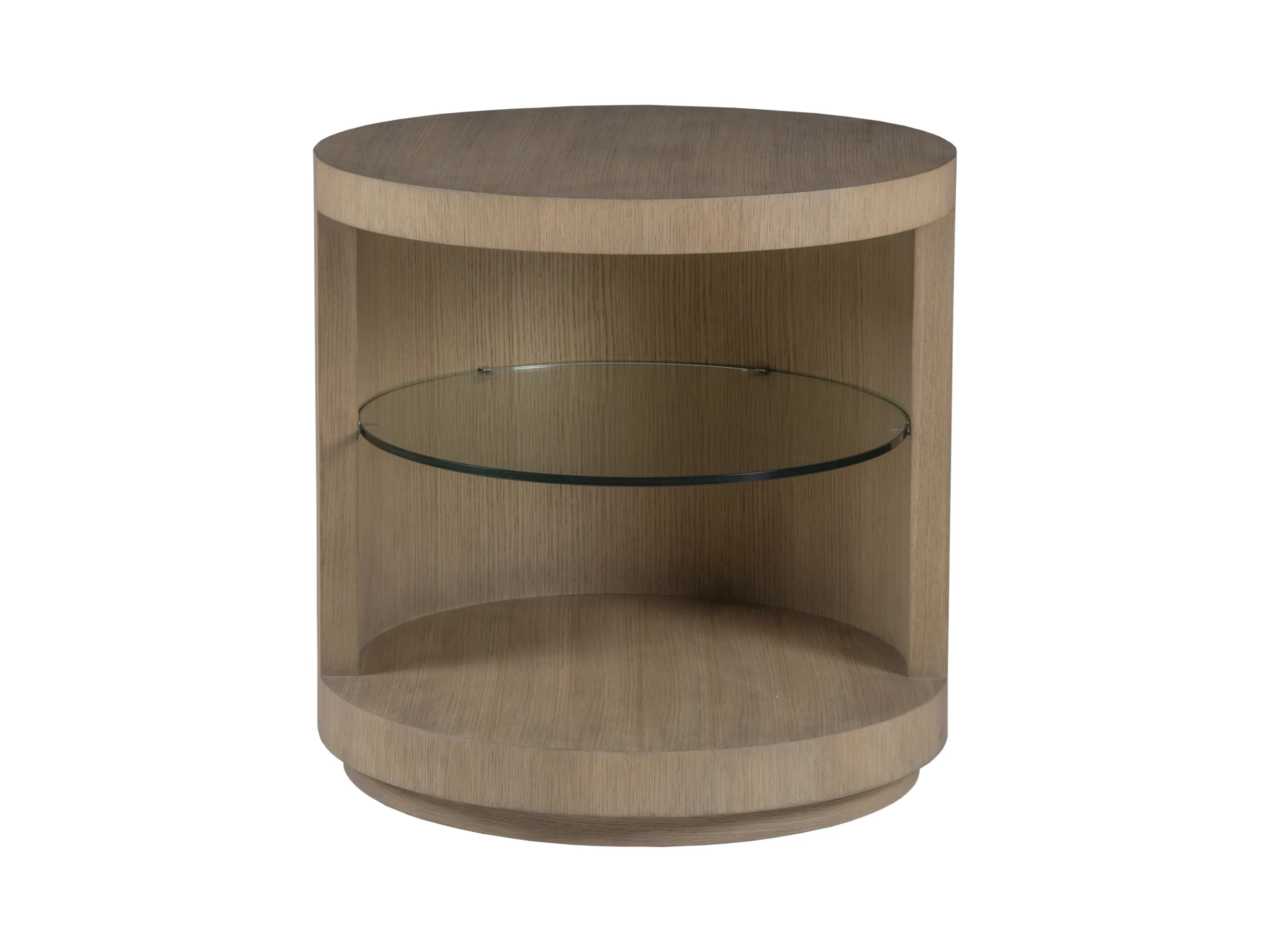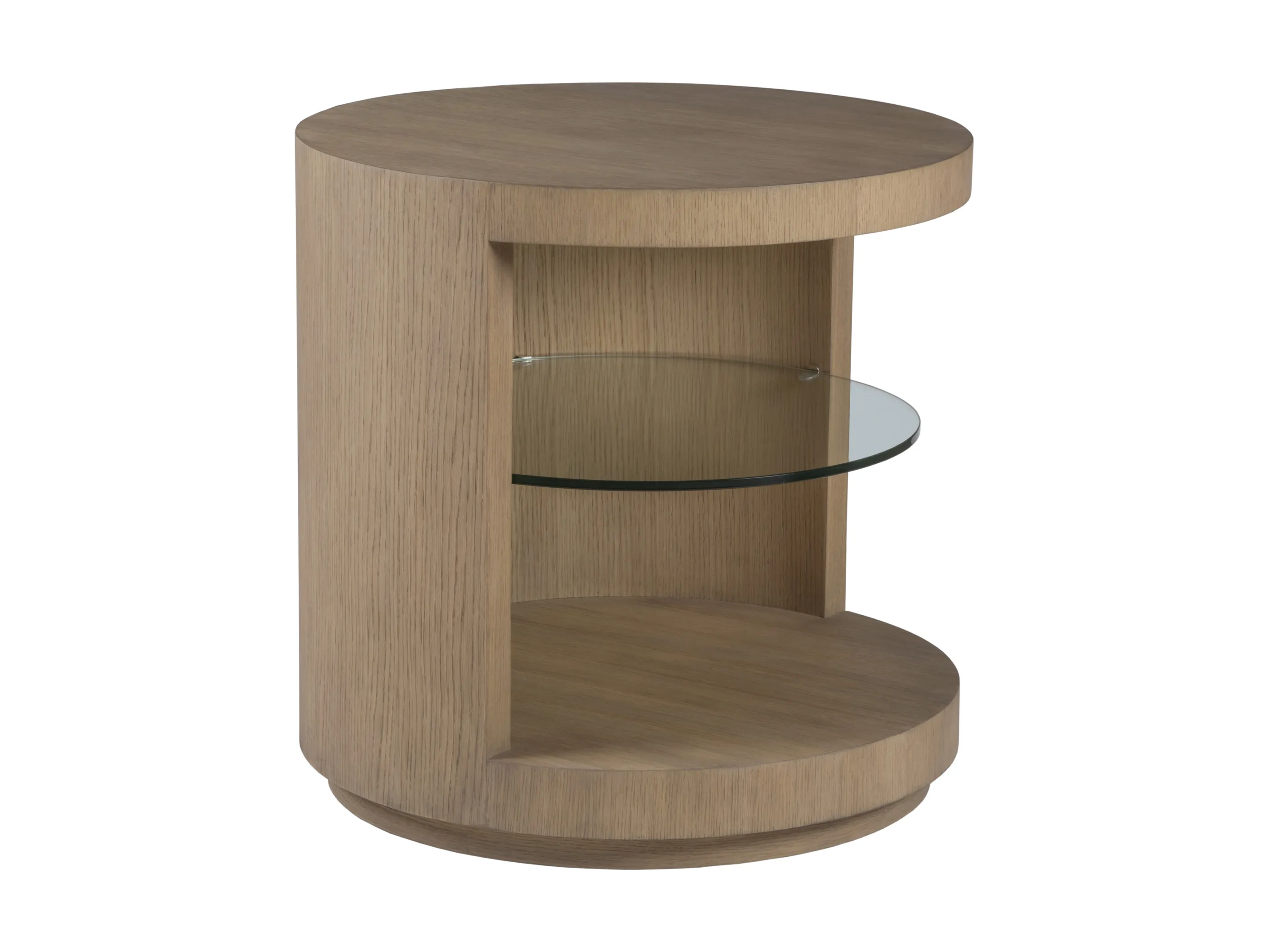 Cylindrical contemporary side table standing on a plinth base, featuring a half-side opening revealing a tempered glass shelf.