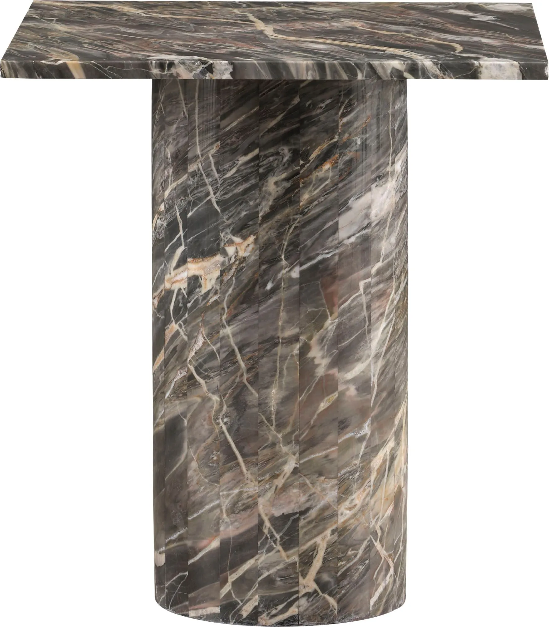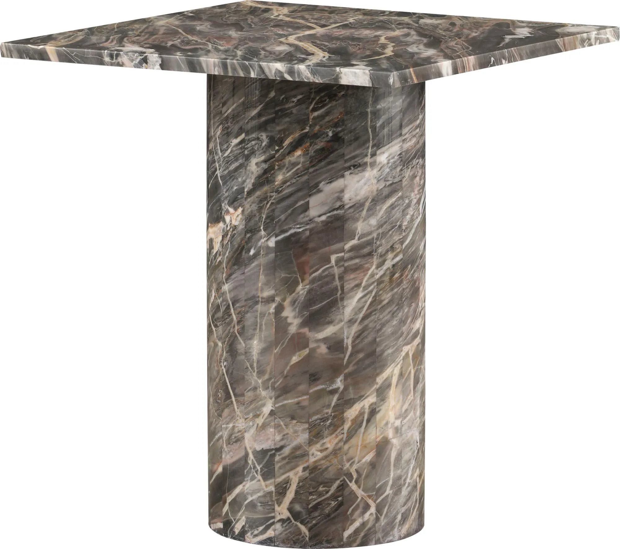 The Alexa Side Table is a luxurious piece that combines natural and modern shaping. A square tabletop rests above a cylindrical base crafted from Elegante Firefly marble.