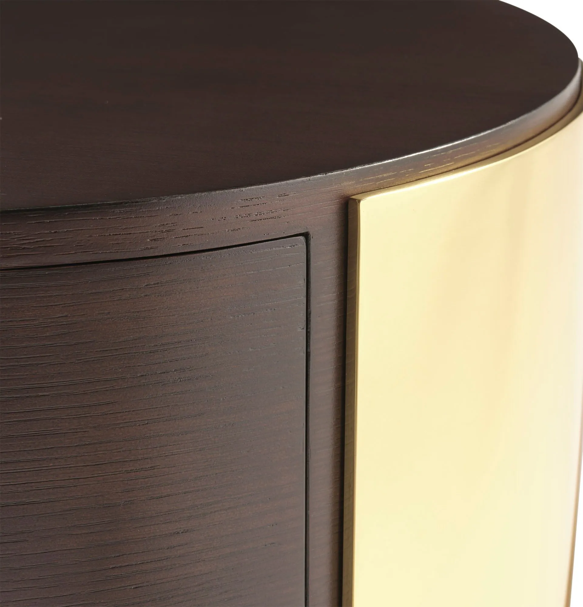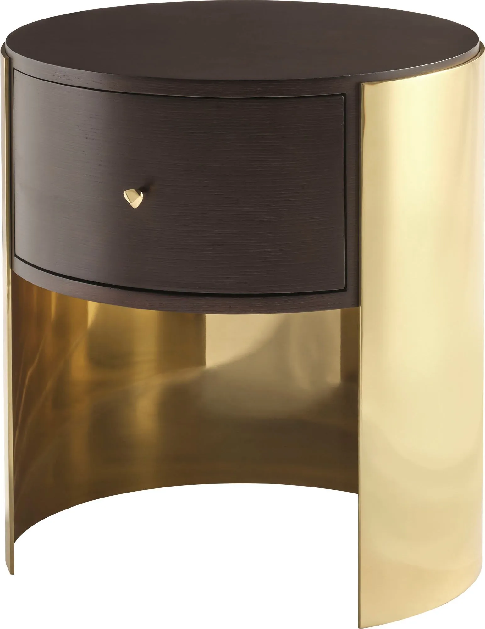 The Camila Side Table is a modern choice with a versatile aesthetic. Its signature feature is a veneered drawer front surrounded by Pure Brass, with a single drawer pull also made of Pure Brass.