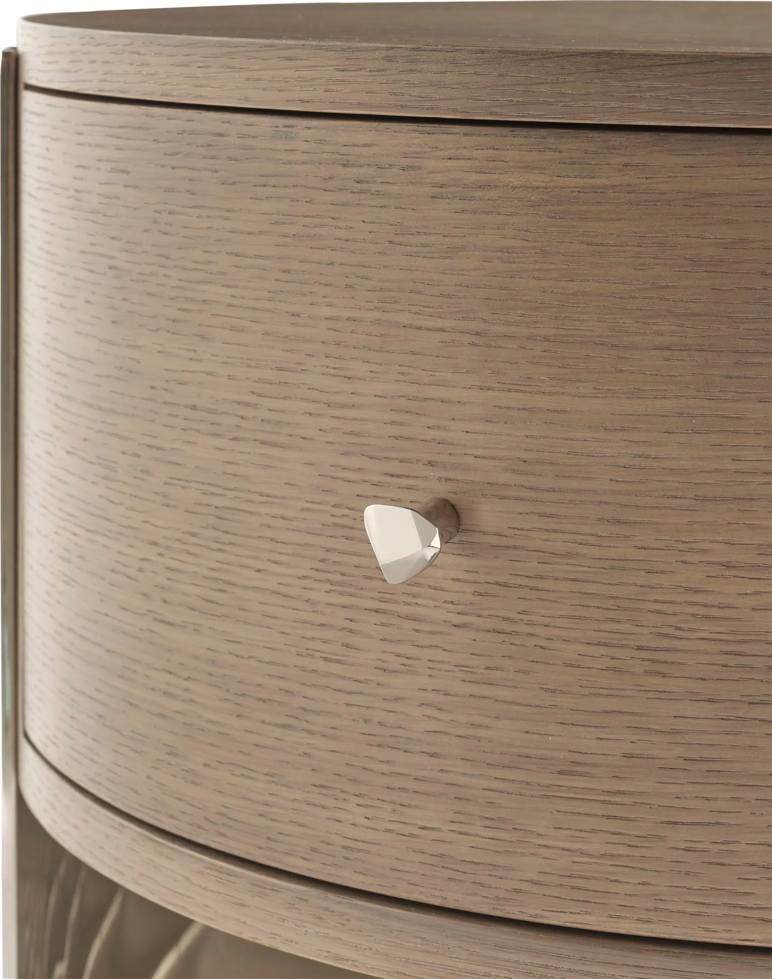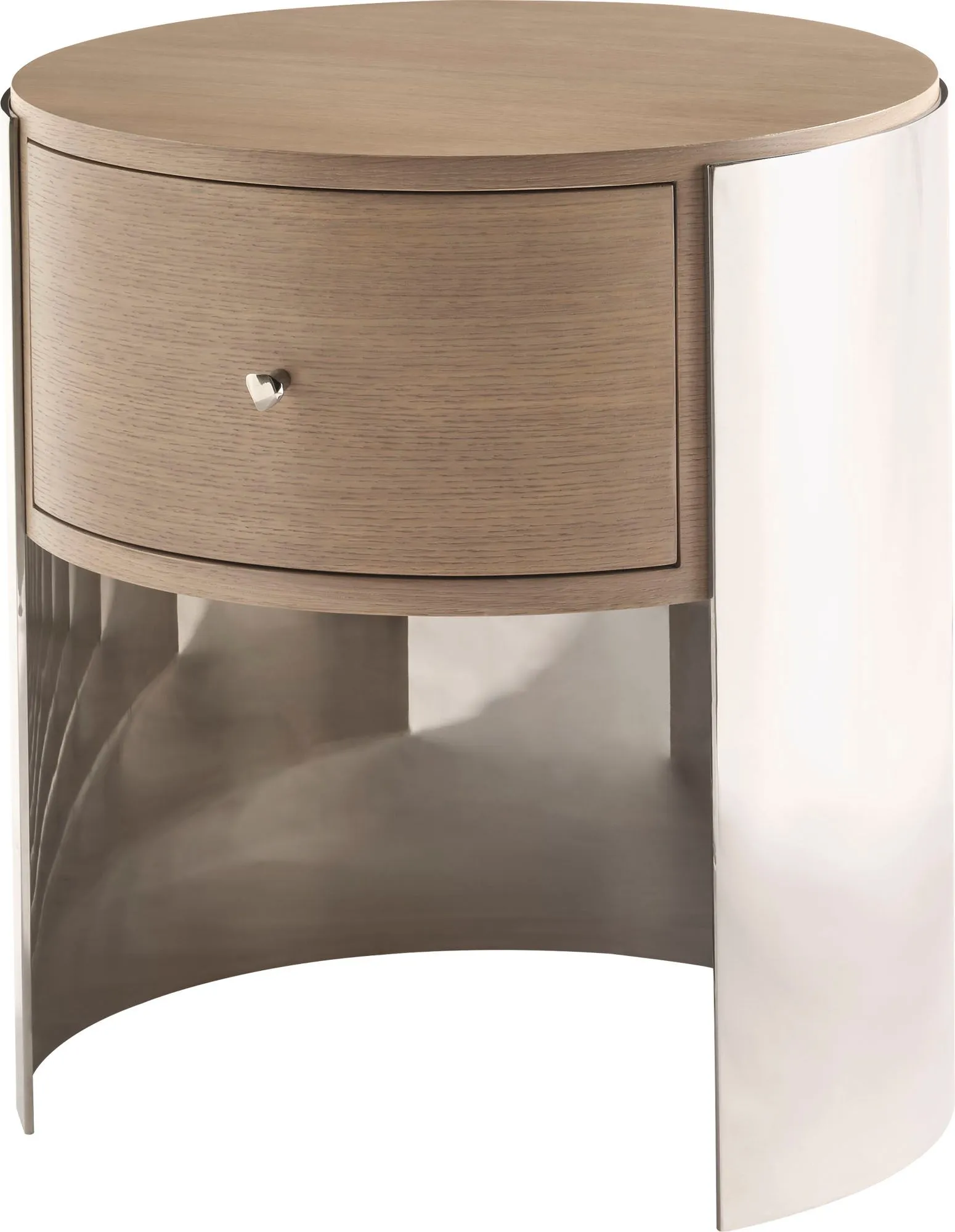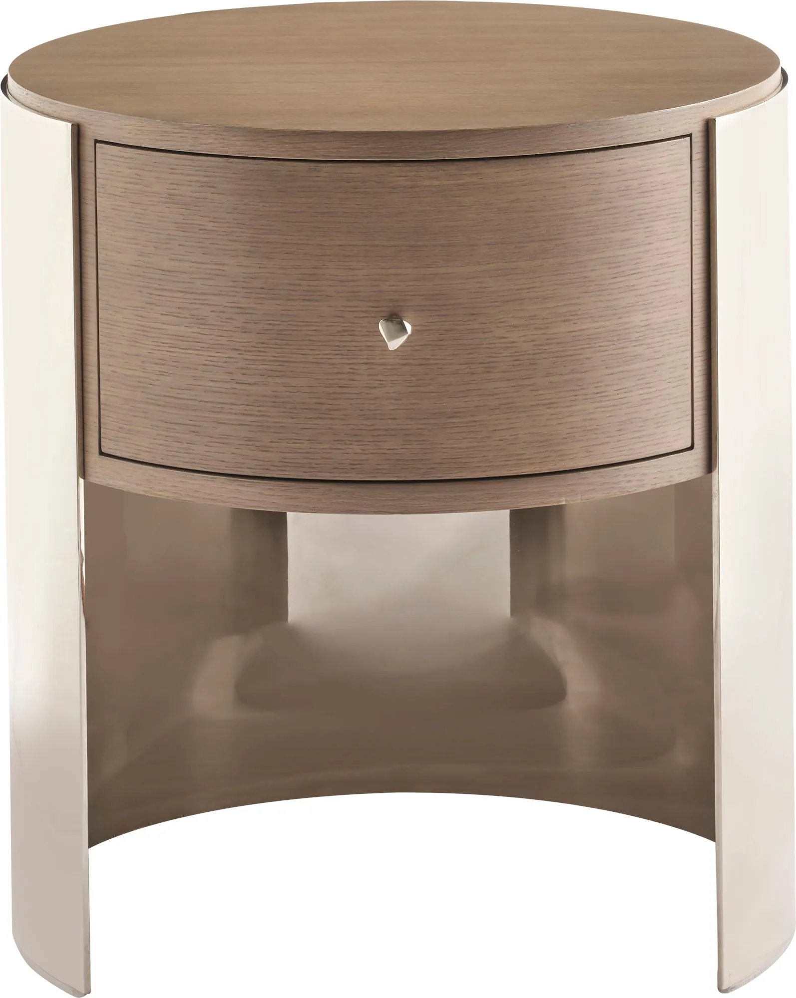 Featuring a veneered drawer front surrounded by Nickel Plated Brass, the Emma Side Table is a modern choice with a versatile aesthetic. The design is capped off by a single faceted knob in Nickel Plated Brass.
