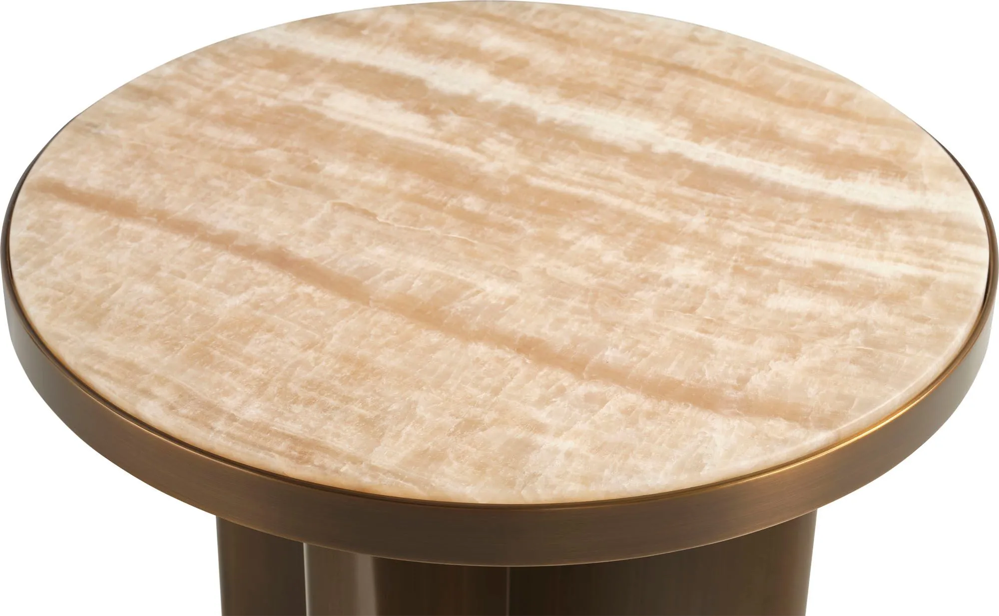 At once sensual and modern, the Calypso Side Table is a luxurious pairing of gentle curves and vibrant materials. Its honed Honey Onyx tabletop is encircled and supported by Warm Bronze.
