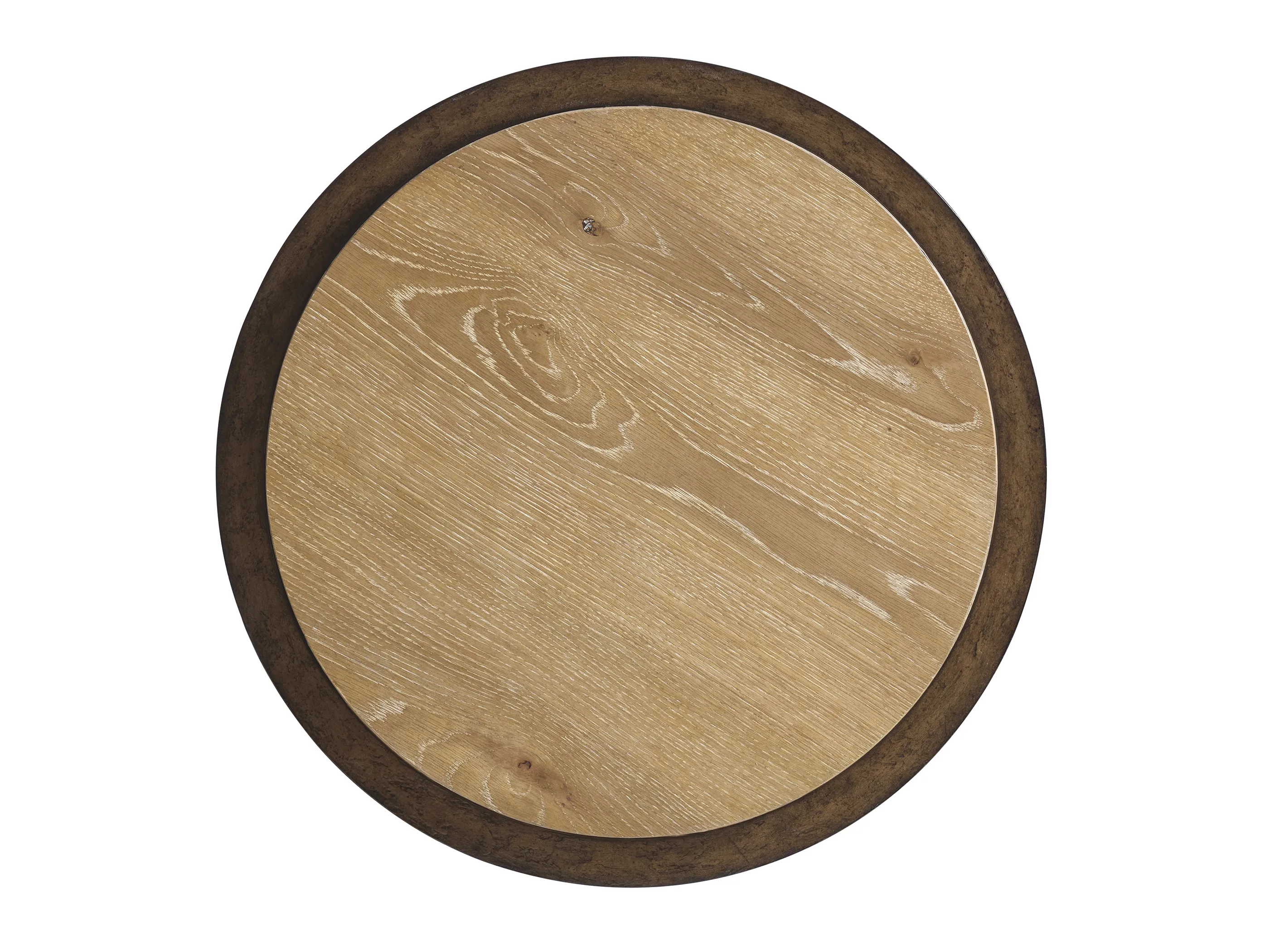The 27-inch diameter Catalonia end table has a unique design that features an inset wooden top nested in a metal rim. The base, also finished in hammered bronze, has tapered legs and a three-sided concave stretcher design.