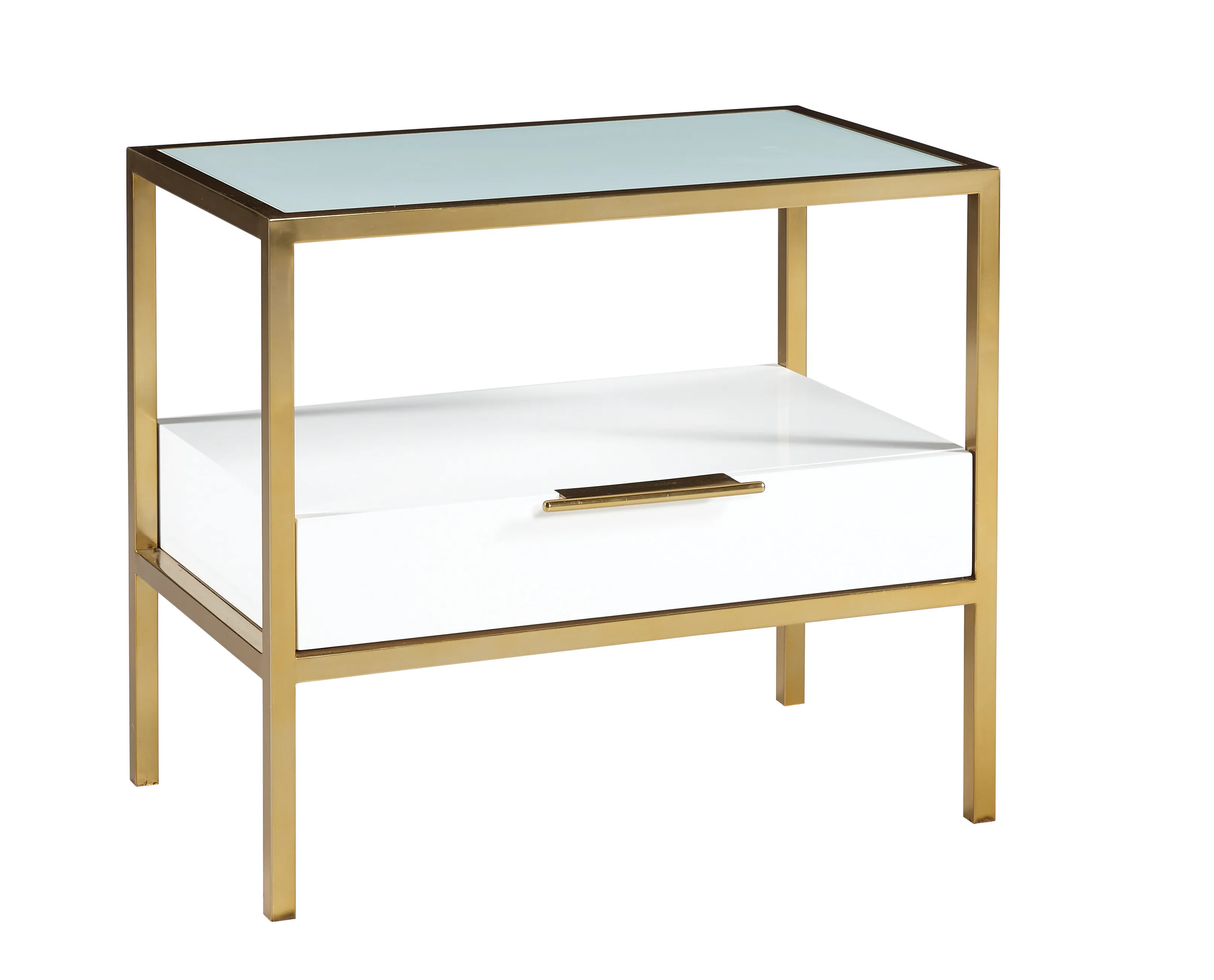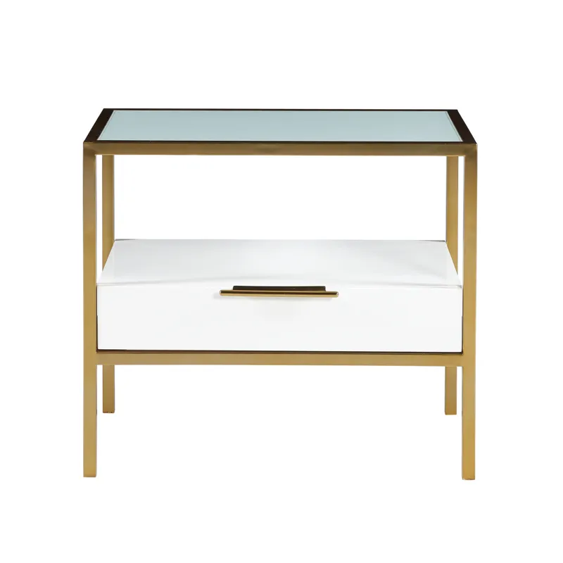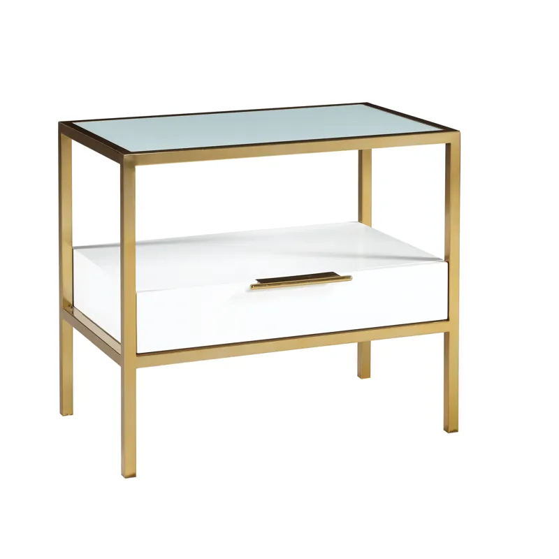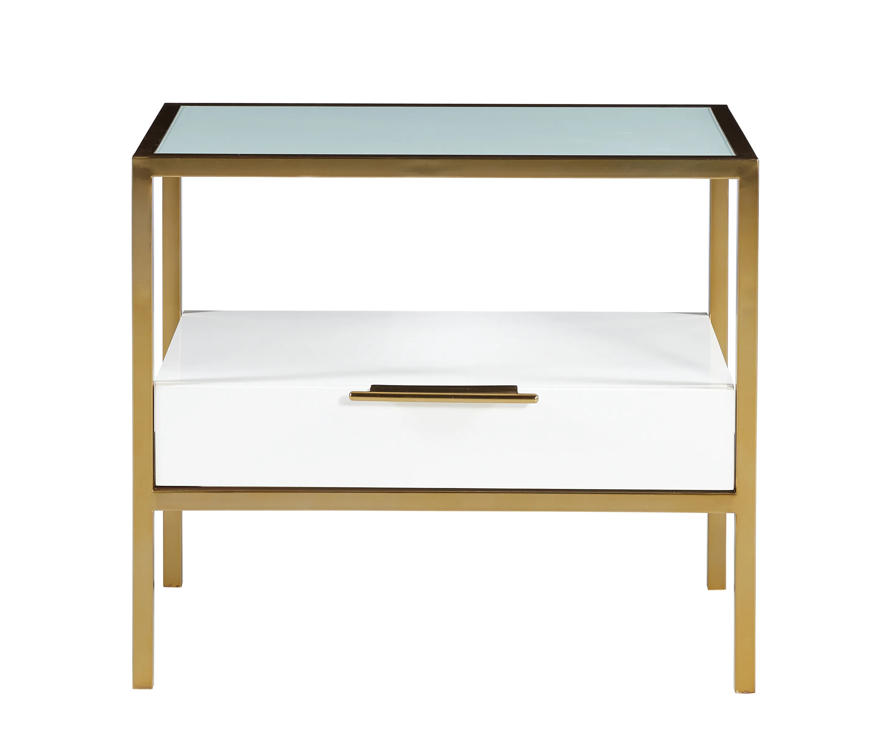 The Carmine Side Table makes a great end table for a sofa or bed. The metal frame has a polished brass finish with white enamel surfaces and a reverse painted glass top. The hardware matches the metal framing
