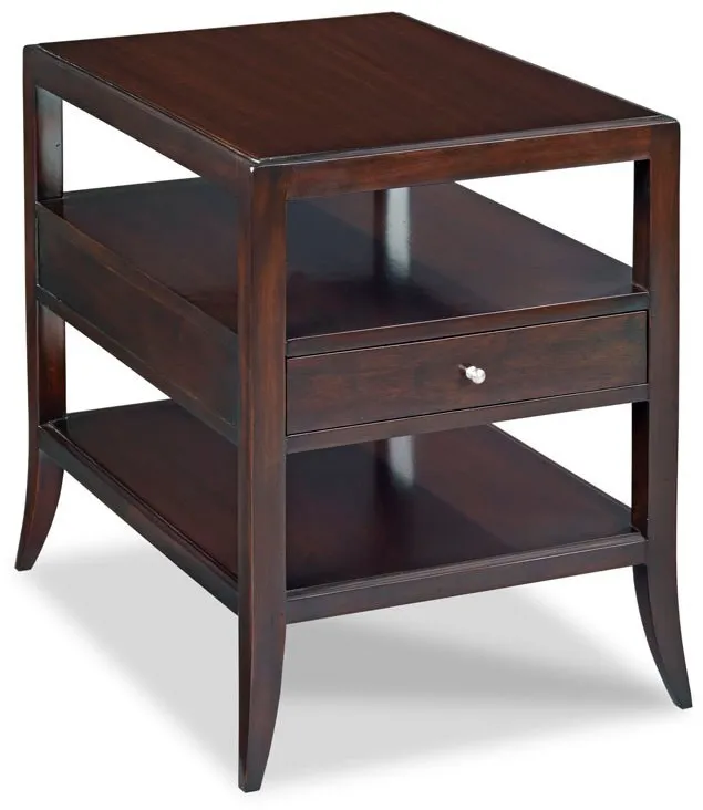 A round galleried top is raised by three curvaceously shaped legs that hold two low shelves.