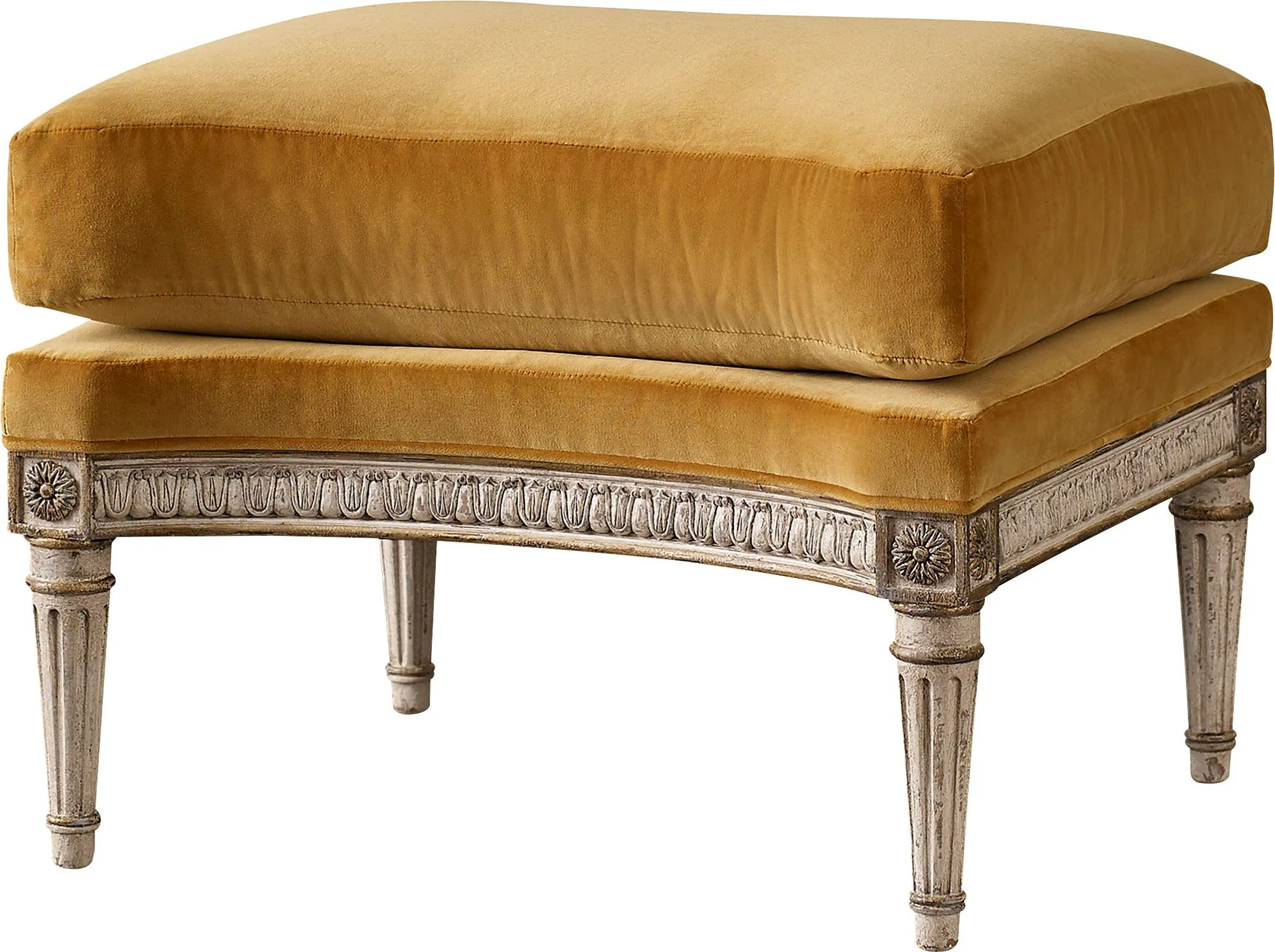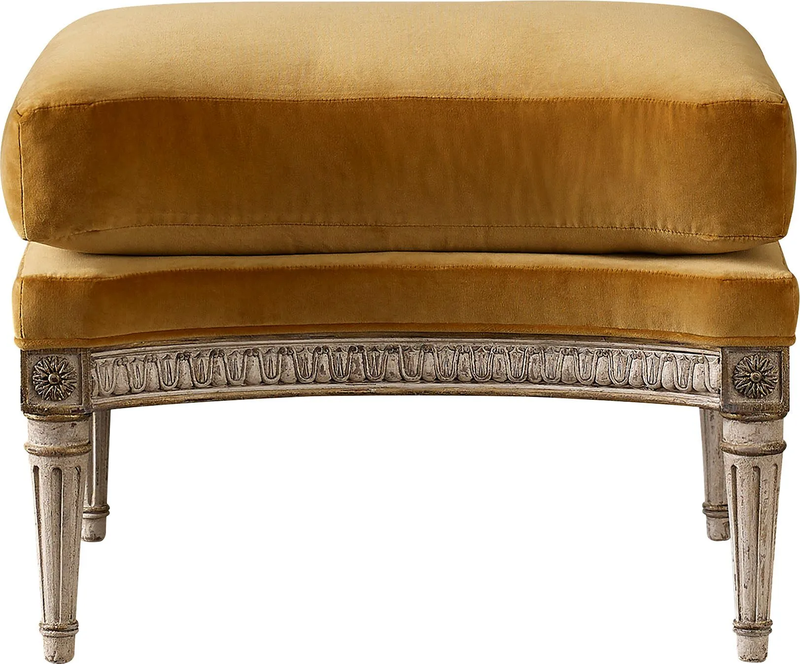 The King Louis XVI Carved Ottoman complements its accompanying chair, rafted with carved and fluted columns and gracefully curved contours.