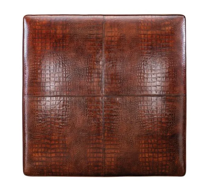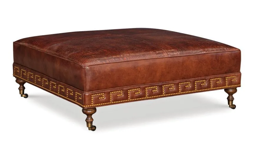 Upholstered, square cocktail ottoman with classic, carved legs. Features a Greek Key nail pattern around the bottom base available at an upcharge. This nail pattern can be switched for the scalloped nail pattern featured on the CJ6928. Standard without nails
