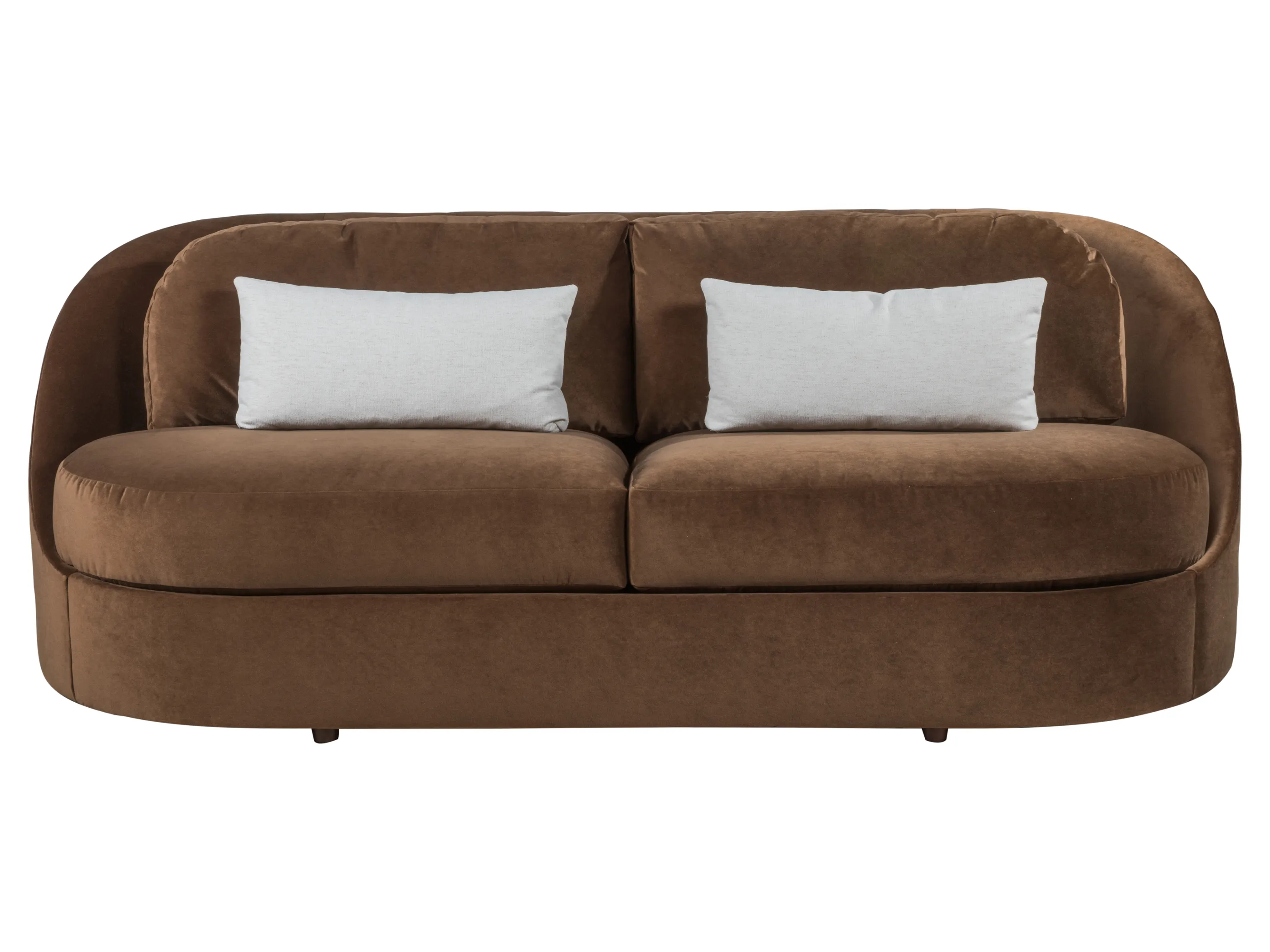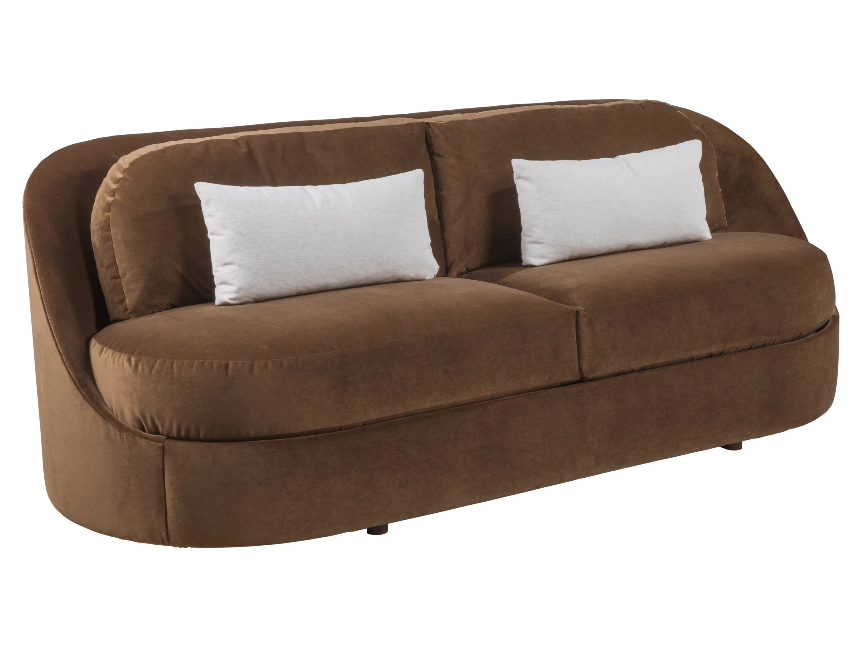 A sleeker version of our Genevieve, the Ava is lower in overall height, deeper, and boasts asymmetrical back pillows with standard kidney pillows for added comfort and visual dimension. The frame features delicate tapering and shaping in both the in-backs and the outside trimming, with both meeting in an almost knife-like edge around the top rails that encircle the pieces. Shown with two seat cushions.