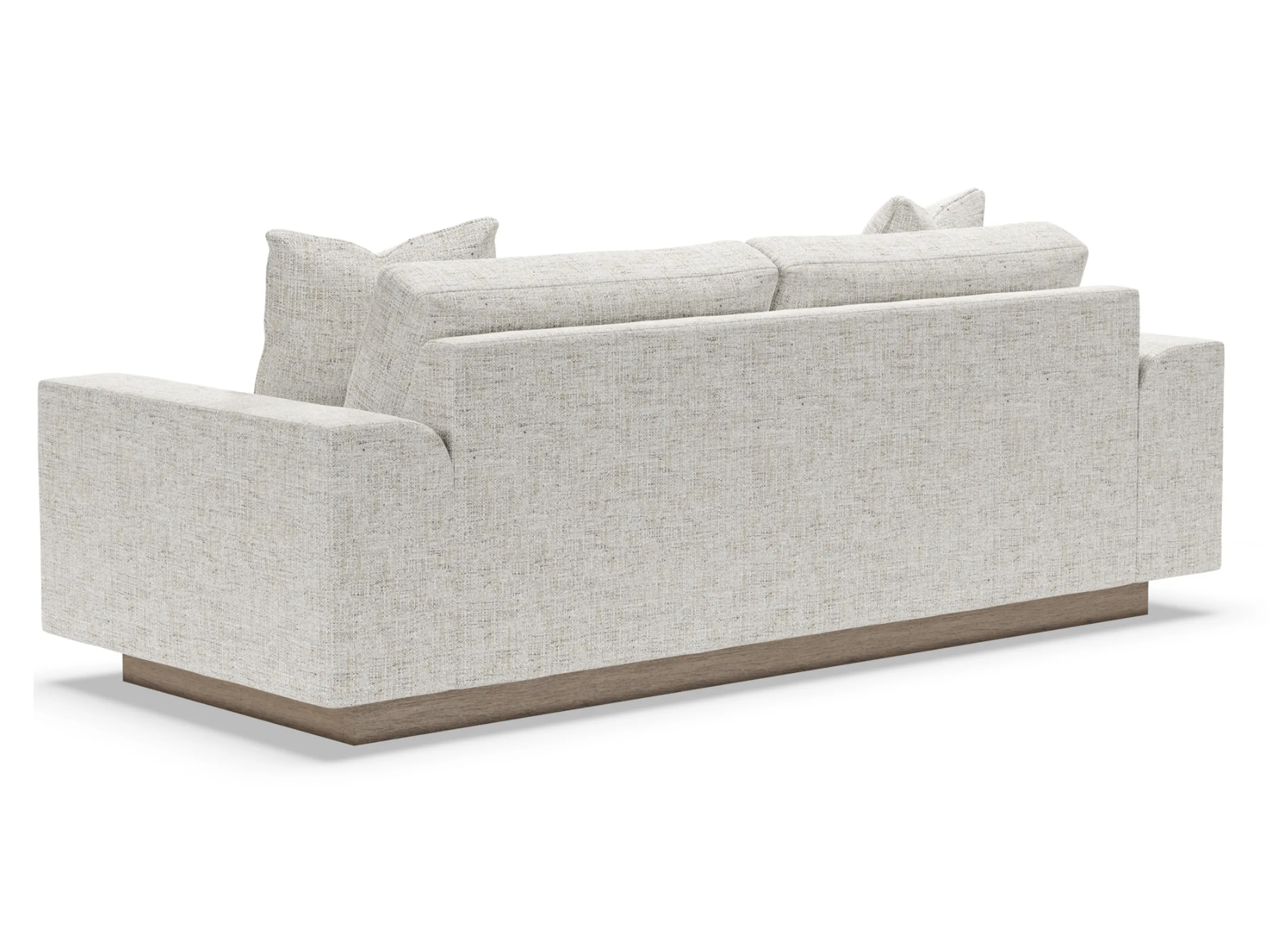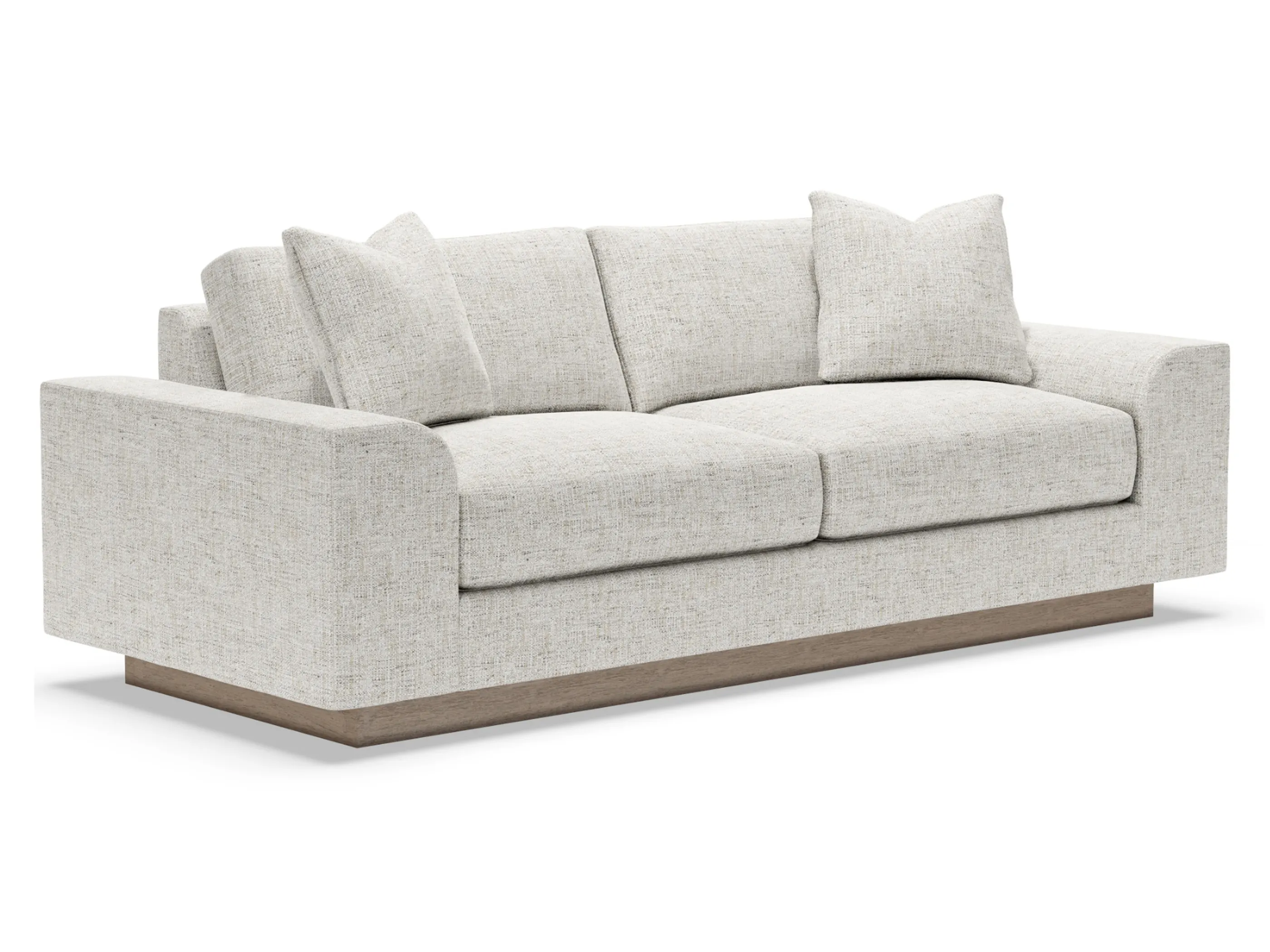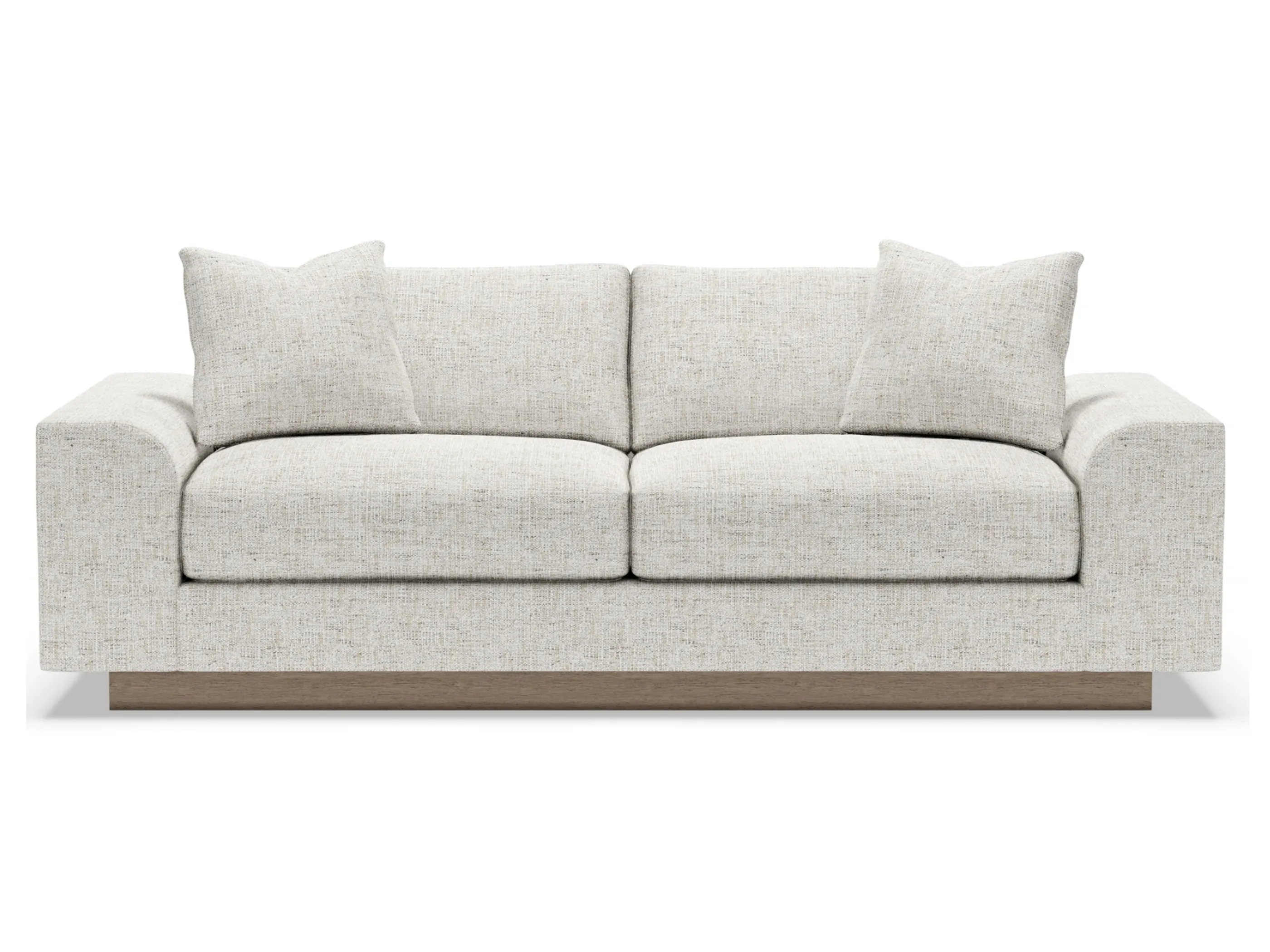 Contemporary, casual styling, Lana is perhaps our plushest offering, boasting two thick Ultra Down seat cushions and captured by 11-inch arms that turn a perfect radius to the inside. The architectural plinth detail lends sophistication to the overall presentation while allowing the frame to appear floating depending on the angle of view. The two blend down back cushions and two 20-inch lux down throw pillows provide exceptional comfort. The plinth base is available in your choice of upholstery finishes.