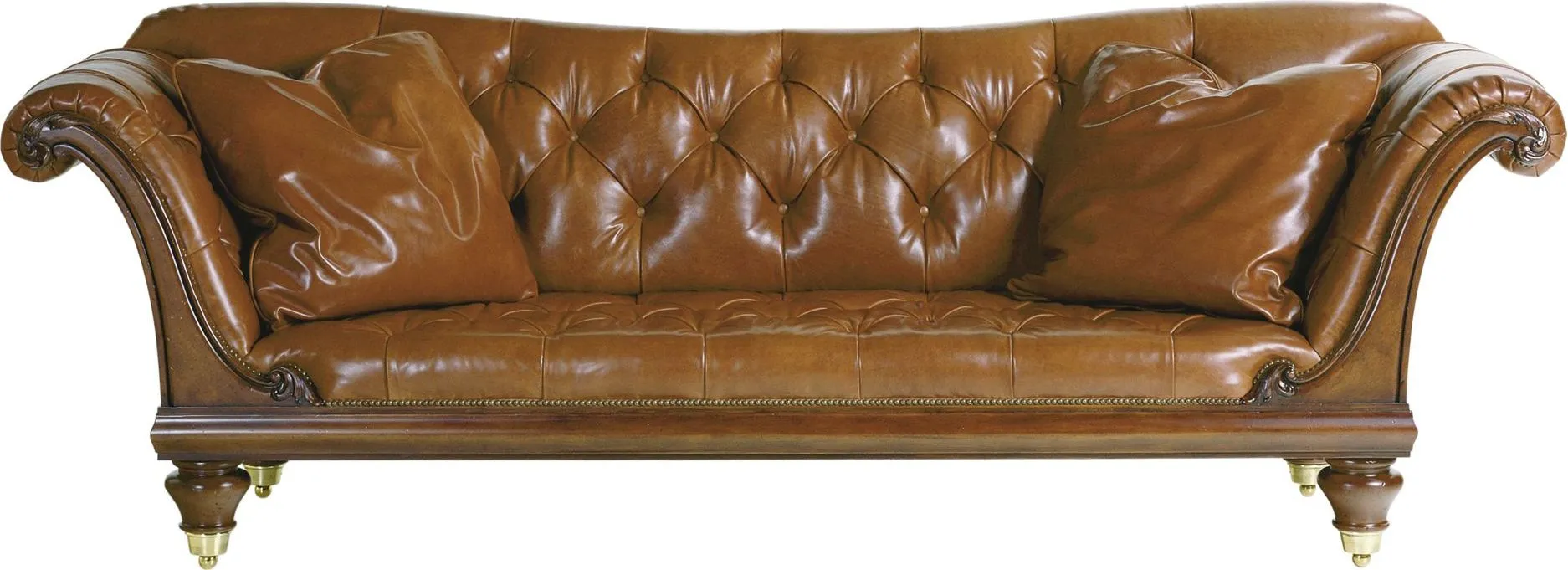 A Victorian sofa with a tufted back and seat. Scrolled arms with carved borders. Turned feet with a cap detail. Nail trim standard on leather. The original resides at Chatsworth - the home of the Duke and Duchess of Devonshire - itself widely hailed as one of the seven treasure houses in all of England. The Chatsworth Sofa has an openly English silhouette that works in both period and contemporary settings. Striking in finishes that contrast with the cover. Circa 1880.