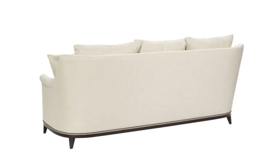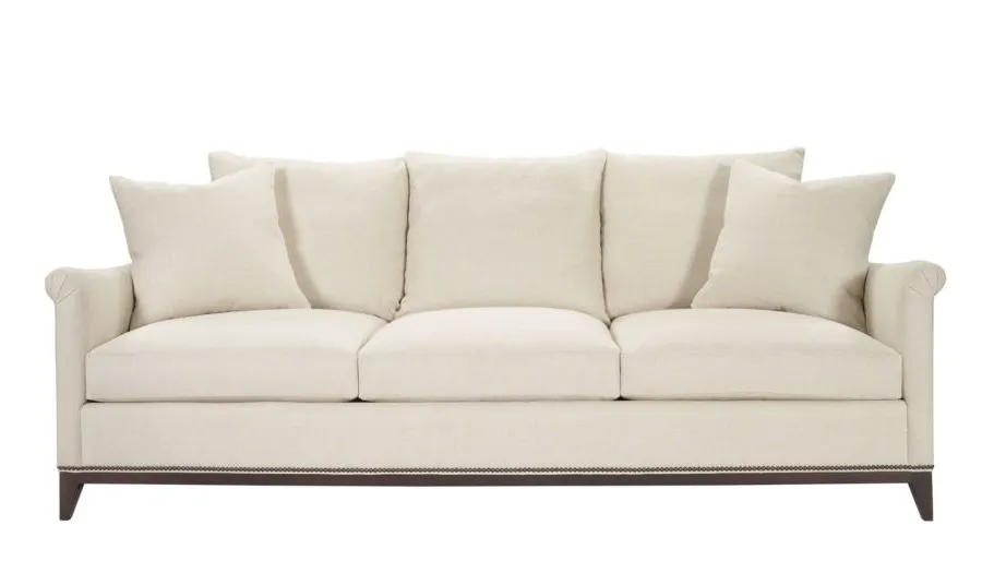 The understated Jules series is defined by the narrow sloping tapered Lawson arm with pleat. Jules is weltless except for around the base. Knife-edge back pillows and spring-down seat cushions are standard. The Jules Sofa, Chair and Ottoman have a curved ash border and tapered legs. Jules is also available M2M® Made To Measure from a chair to a 120-inch sofa. Shown in standard 89-inch size in optional Espresso finish and NS-08 nail trim.
