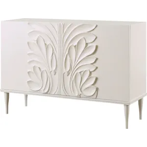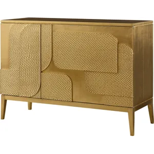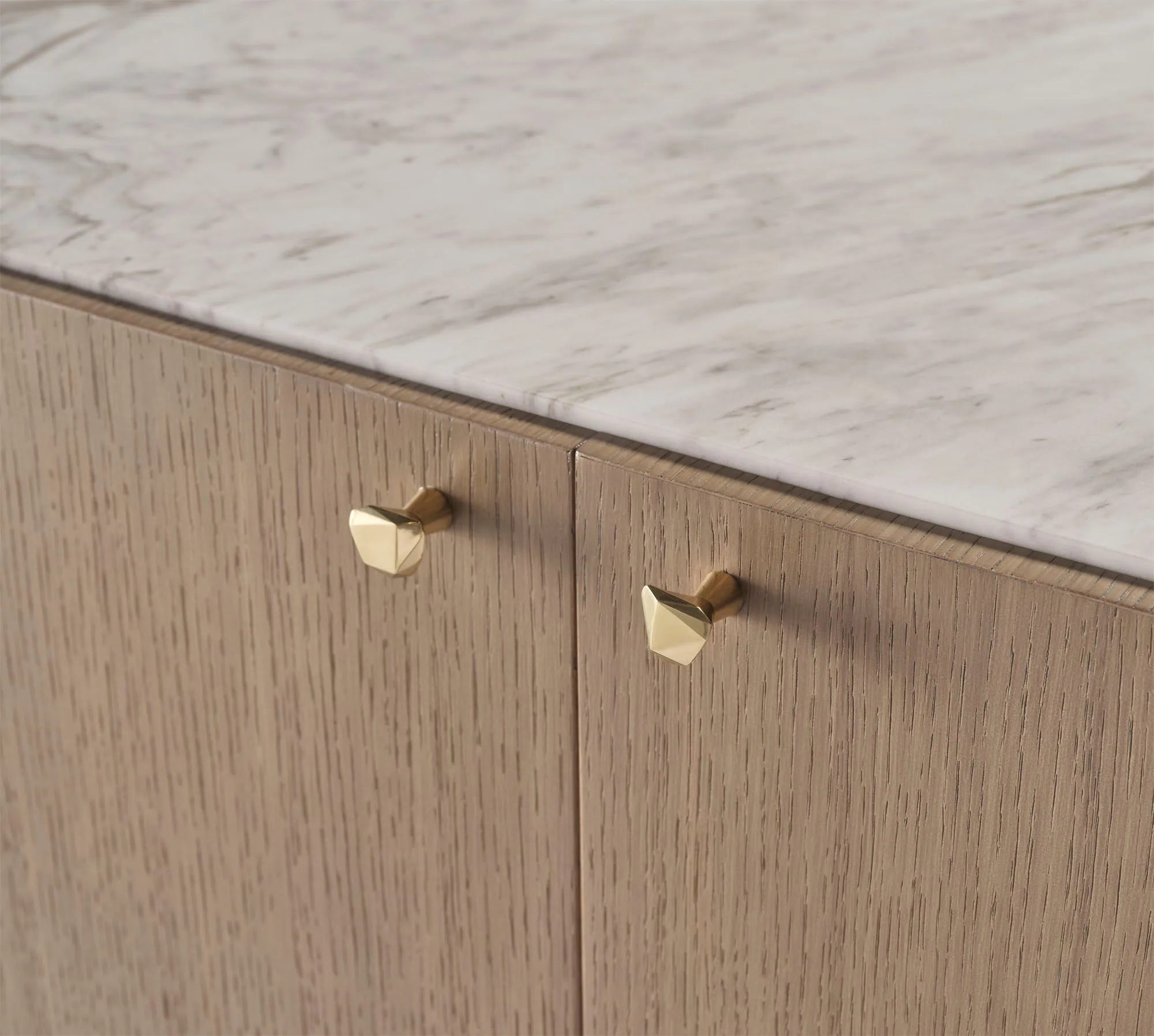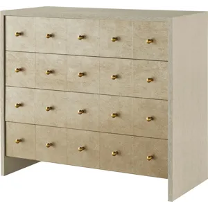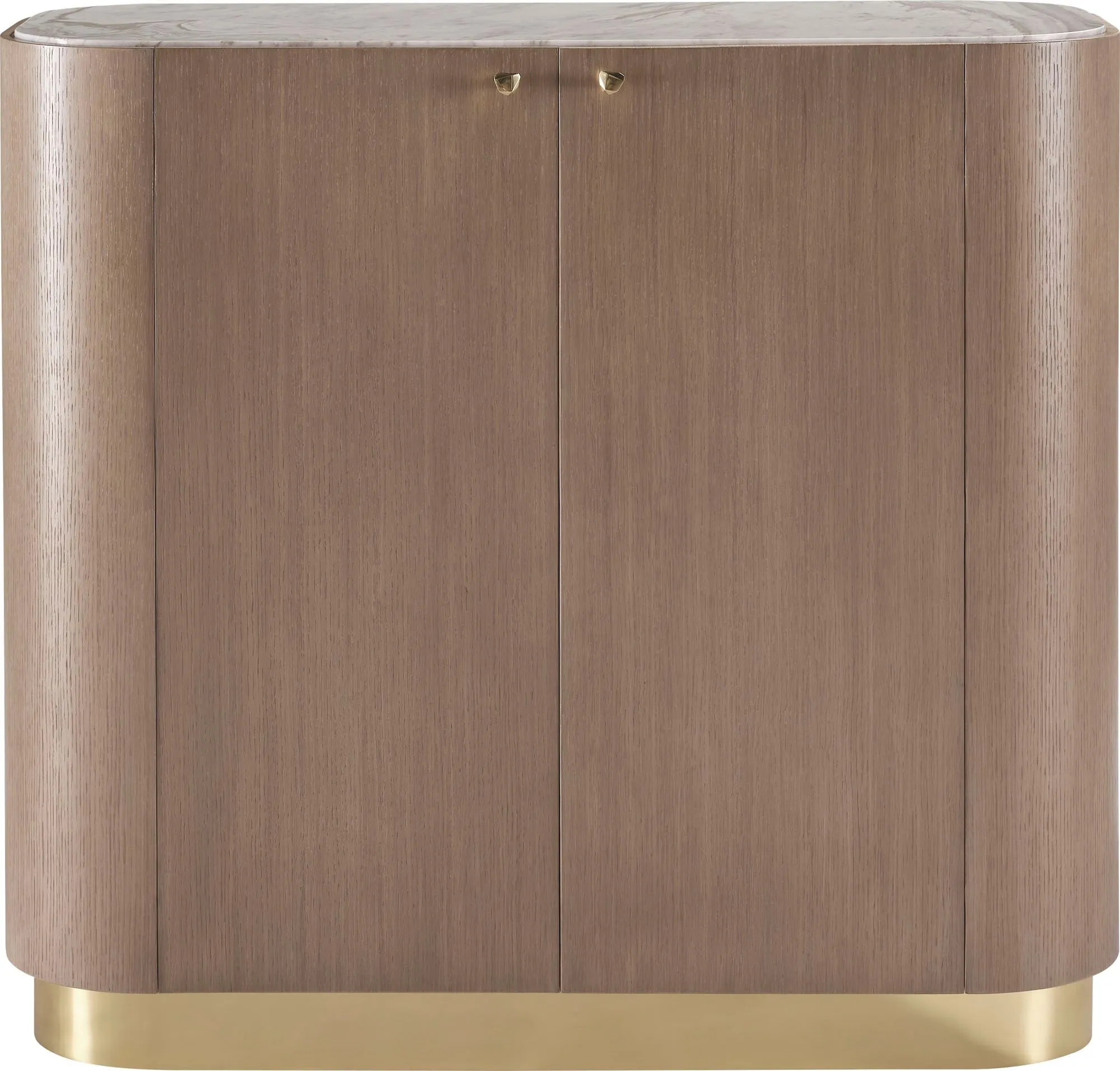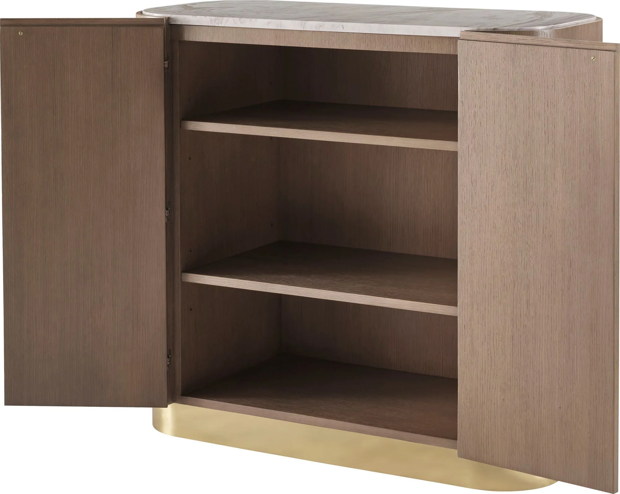 The Finley Chest features a rounded shape inspired by the dramatic turns of a racetrack. Its top is crafted from polished Hena White marble, while its Pure Brass base and hardware complete the assuredly modern design.
