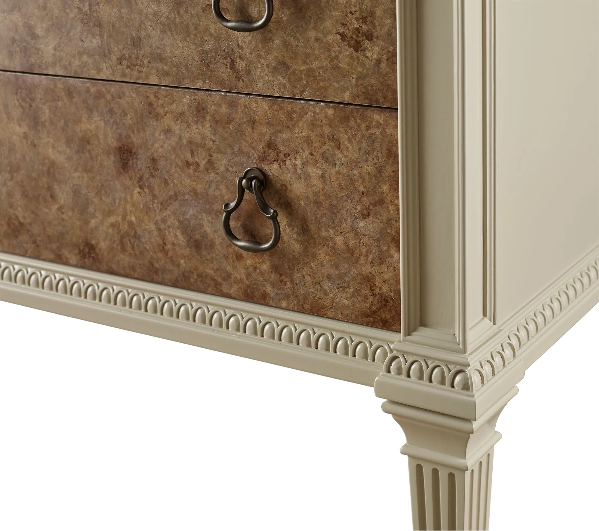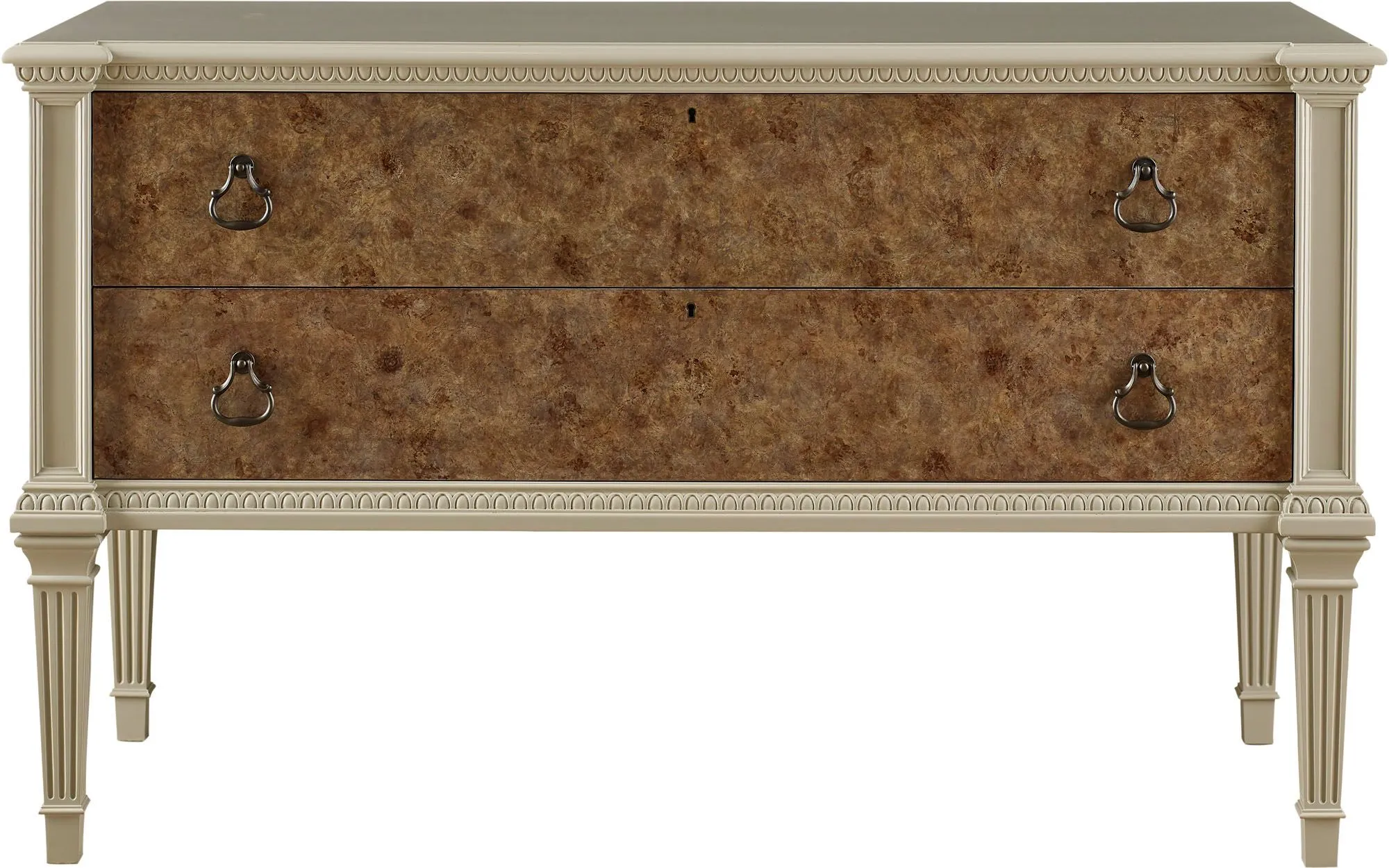 The Dutch Paneled Chest captures the refinement of the late Dutch Republic, circa 1770. The chest features two oak burl veneered drawers with shaped drop-handles and plain keyhole escutcheons with a dark bronze key.