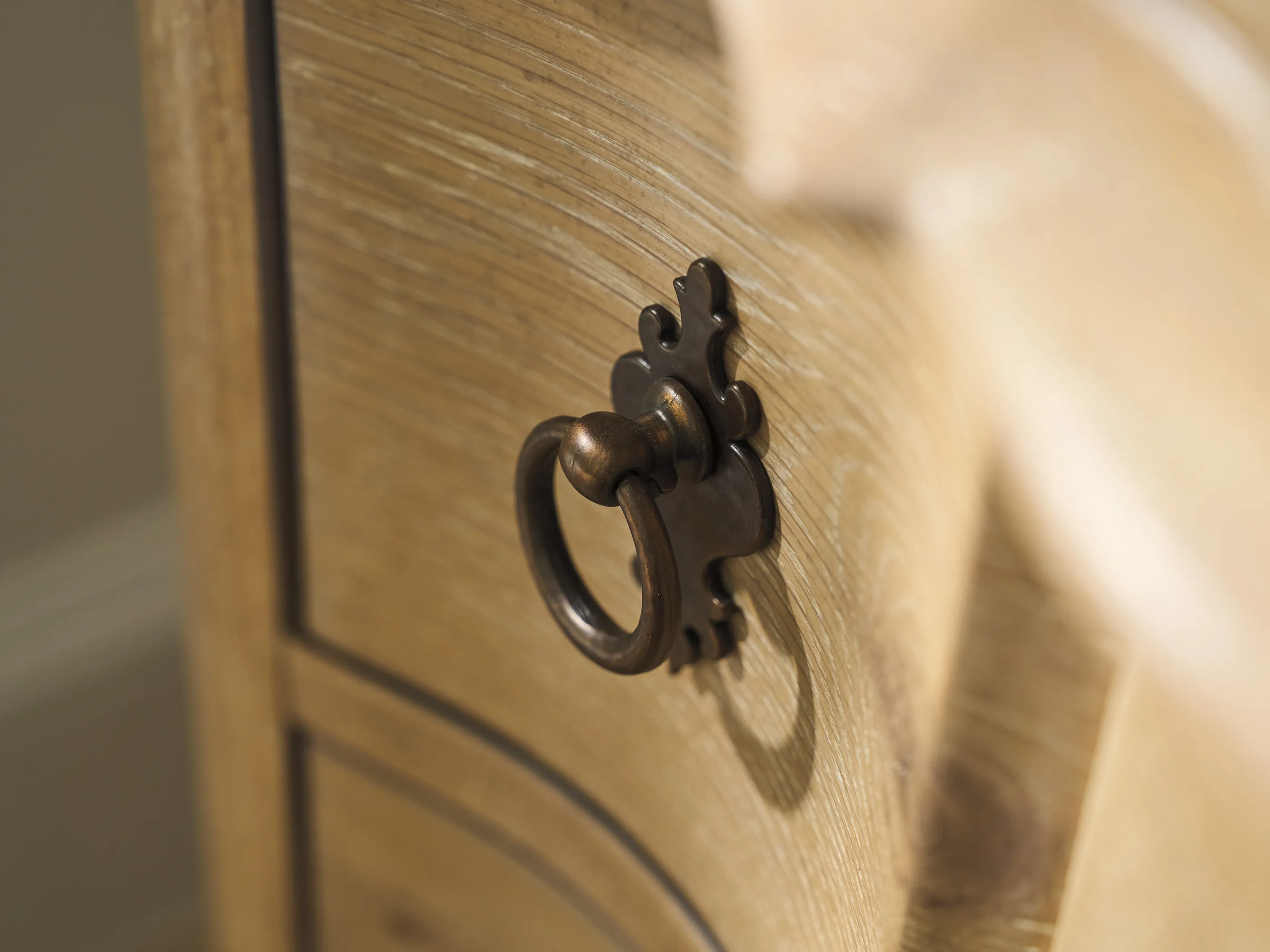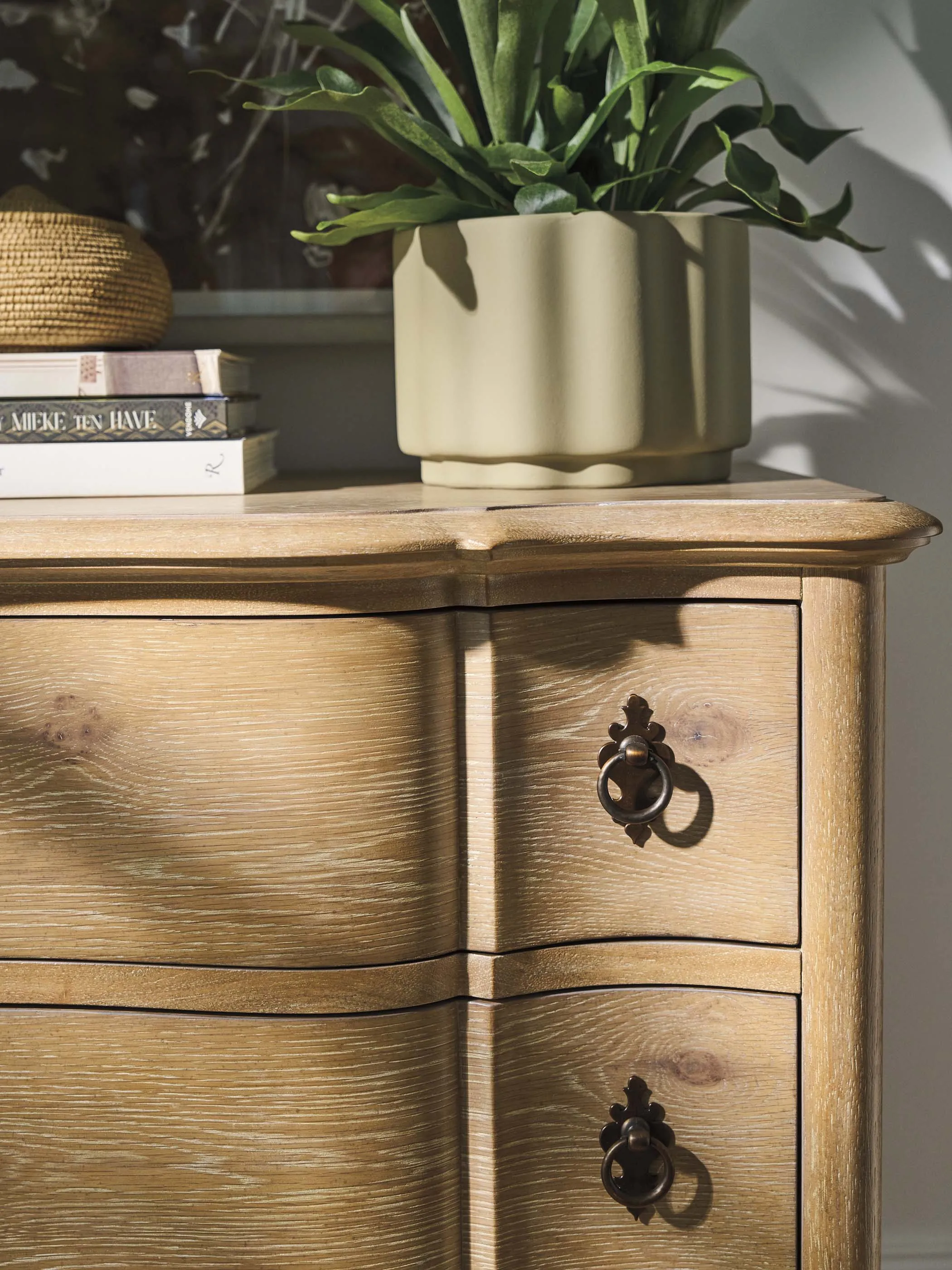 The 48-inch Camino hall chest features a graceful serpentine front, a horizontal pattern of white oak across the drawer faces, and custom hardware in hammered bronze. The base is highlighted by shaped molding and tapered legs. Drawers have full-extension guides.
